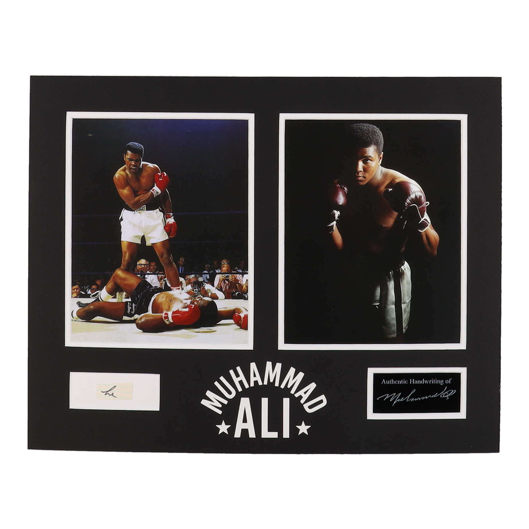 This custom matted display measures 16" x 20" in size. Features a cut with original handwriting from Muhammad Ali (D. 2016, HOF). The display also includes (2) photos of Ali and a plaque with a laser engraved full signature (not hand-signed).