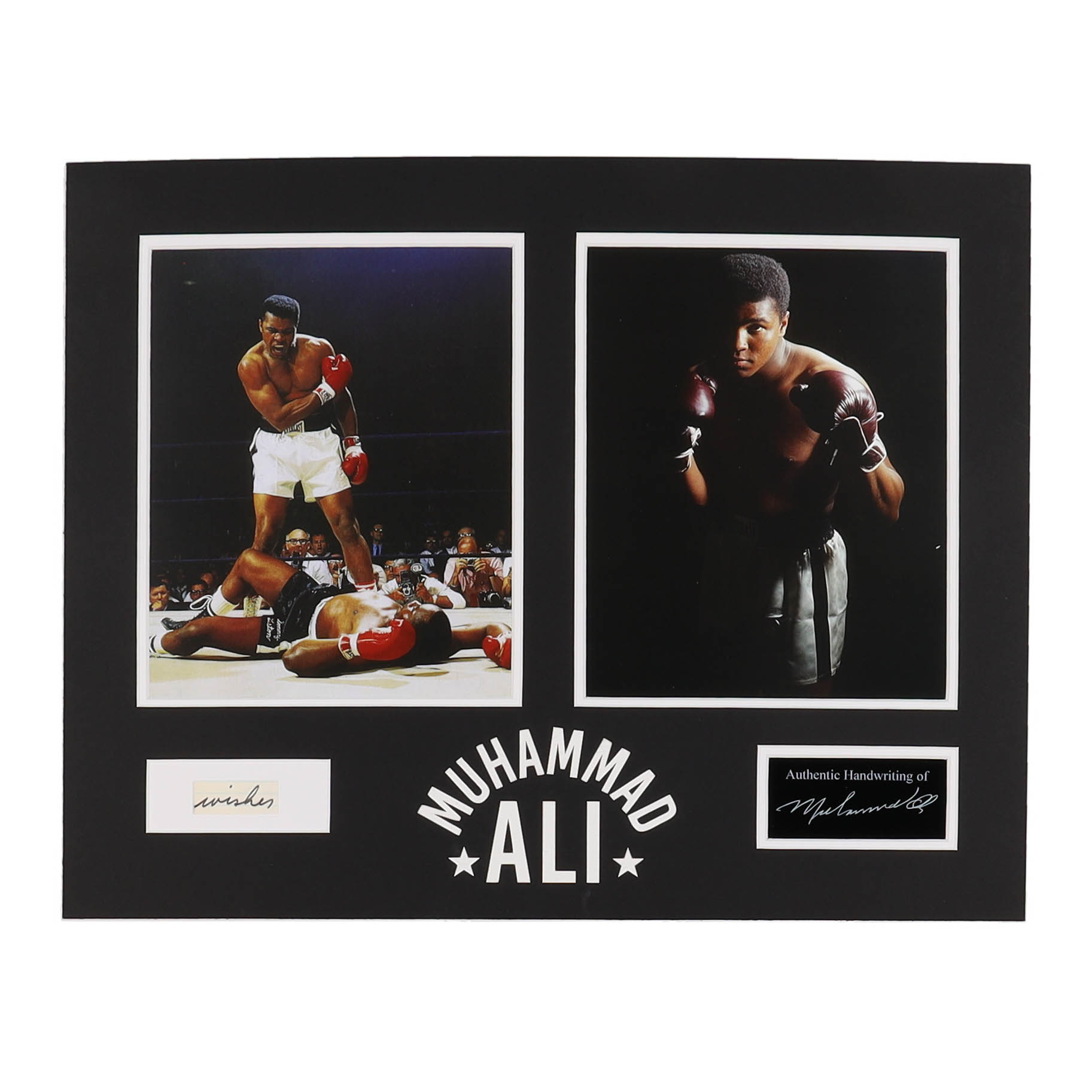 This custom matted display measures 16" x 20" in size. Features a cut with original handwriting from Muhammad Ali (D. 2016, HOF). The display also includes (2) photos of Ali and a plaque with a laser engraved full signature (not hand-signed).