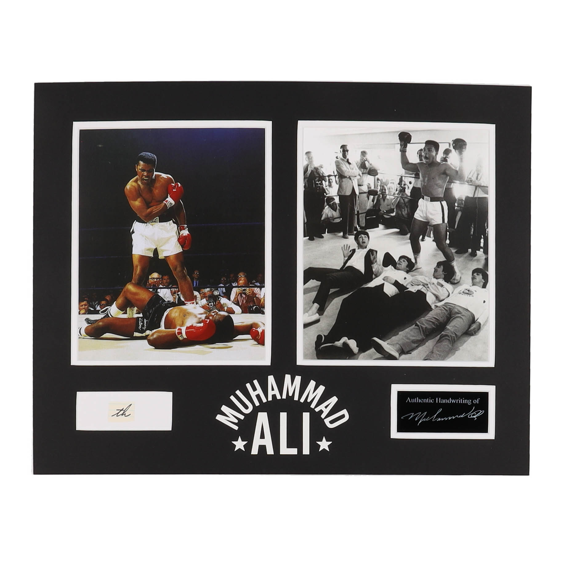 This custom matted display measures 16" x 20" in size. Features a cut with original handwriting from Muhammad Ali (D. 2016, HOF). The display also includes (2) photos of Ali and a plaque with a laser engraved full signature (not hand-signed).