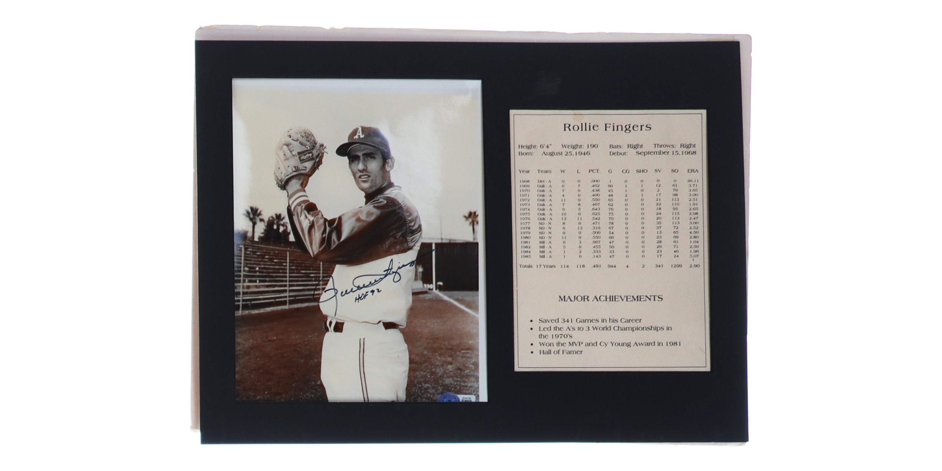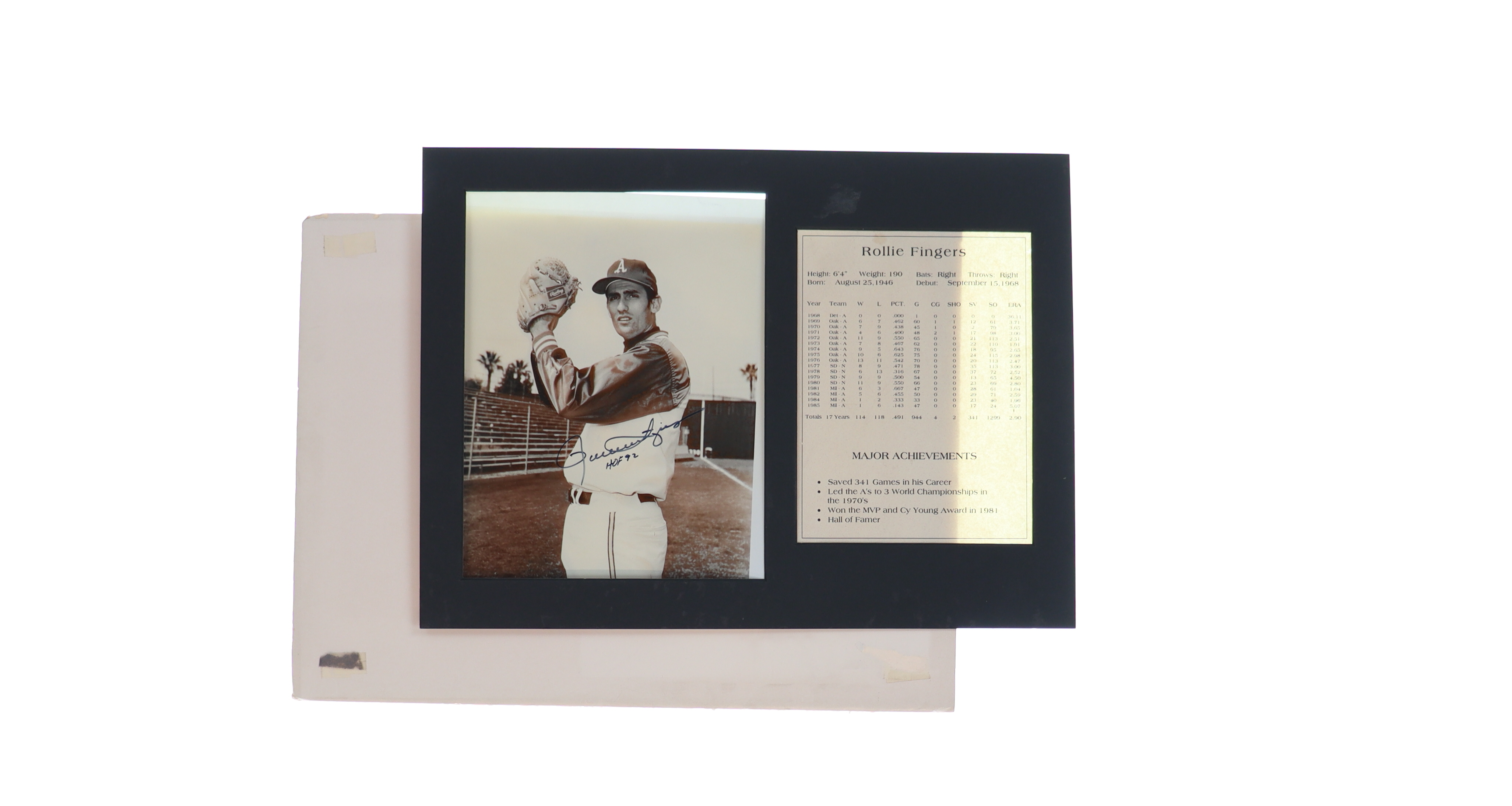 Custom matting measures approximately 12" x 15" in size. Features a photo that has been hand-signed and inscribed by Rollie Fingers (Oakland Athletics, HOF). The matting is detached from the cardboard.