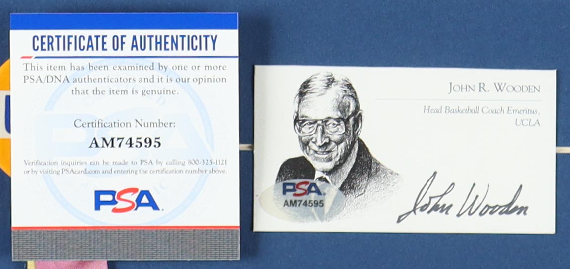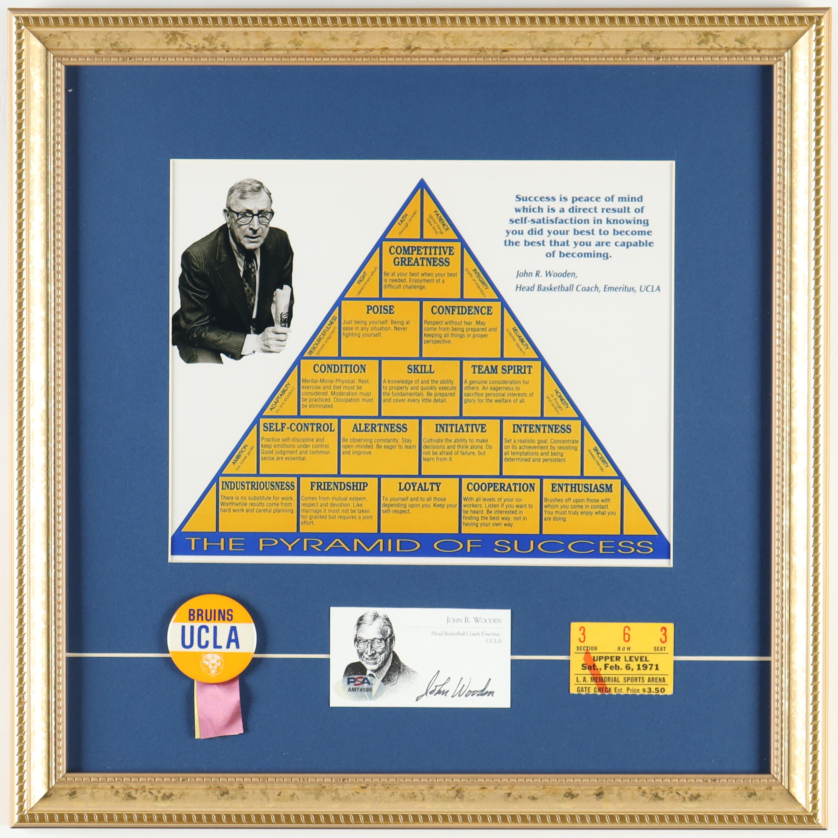 Custom frame measures approximately 16" x 16" in size and features an original UCLA business card that has been hand-signed by John Wooden (D. 2010, UCLA Bruins, HOF). The display also includes a UCLA Bruins vintage game ticket, Bruins pin and a "The Pyramid Of Success" photo.