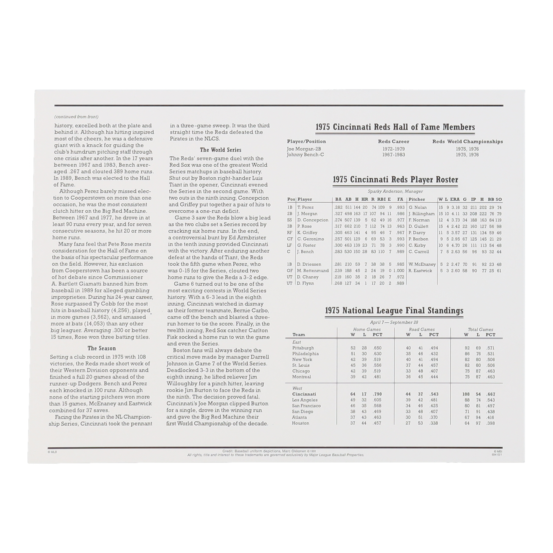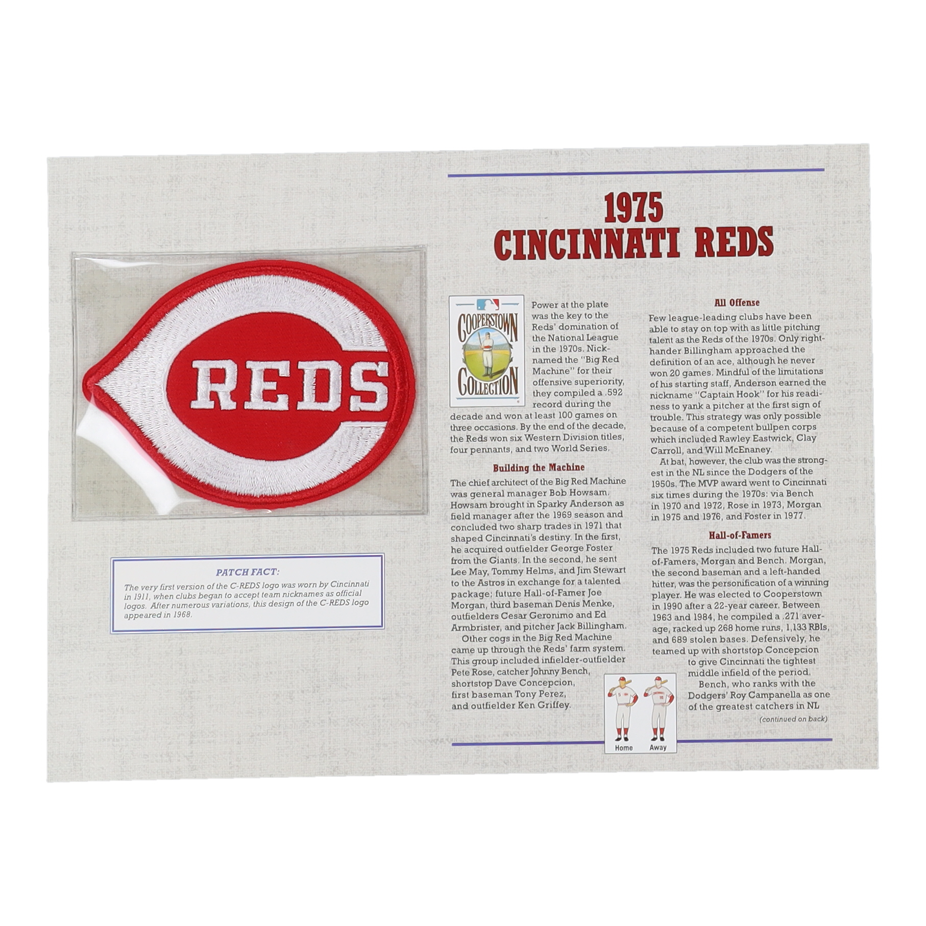 1975 Cincinnati Reds Cooperstown Collection statistics commemorative stat card measures approximately 9" x 12" in size. Includes cloth uniform patch as shown.