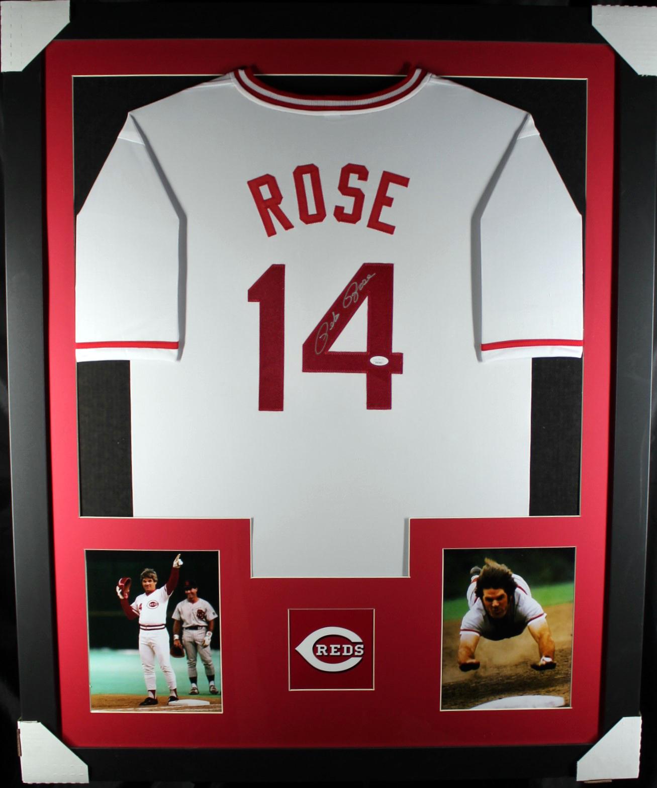 Custom frame measures 35" x 43" in size and features a jersey that has been hand-signed by Pete Rose.