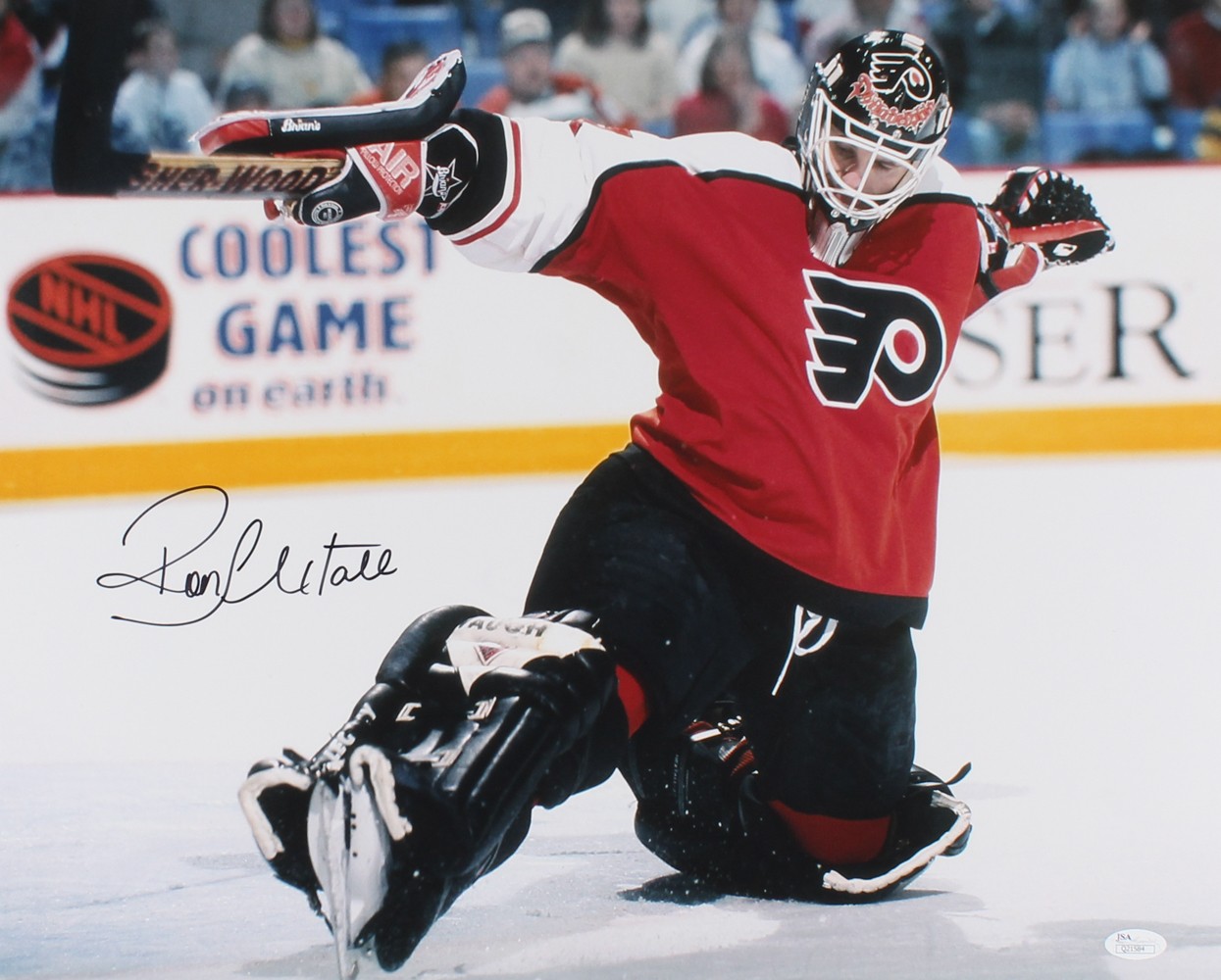 Photo measures 16" x 20" in size and has been hand-signed in black felt tip pen by Ron Hextall (Flyers).