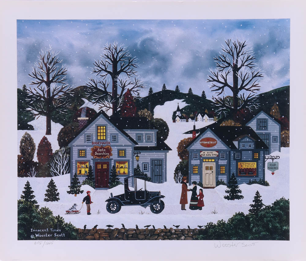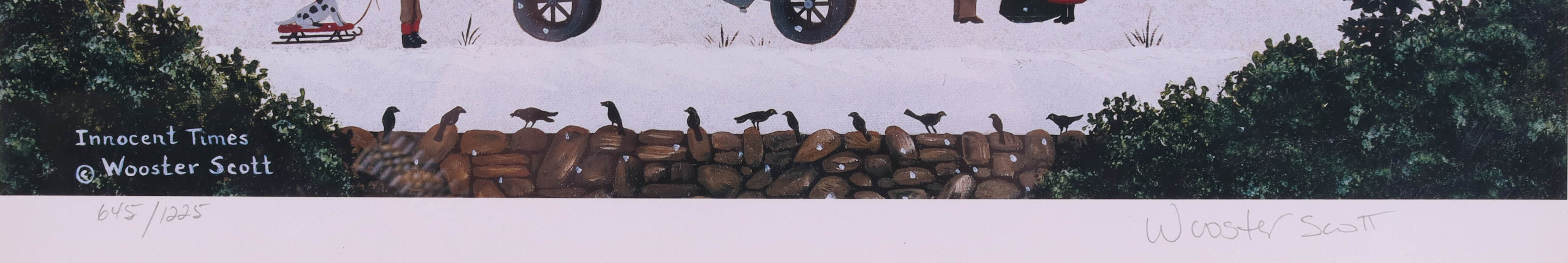 Cozy, down-home images of a bygone era when life was simpler - this is the feeling captured in the creations of one of the world's most recognized artists. "Innocent Times" is a limited edition lithograph on paper, numbered and hand signed by Wooster Scott! Measures approx. 17" x 14" (with border), 15" x 12" (image).