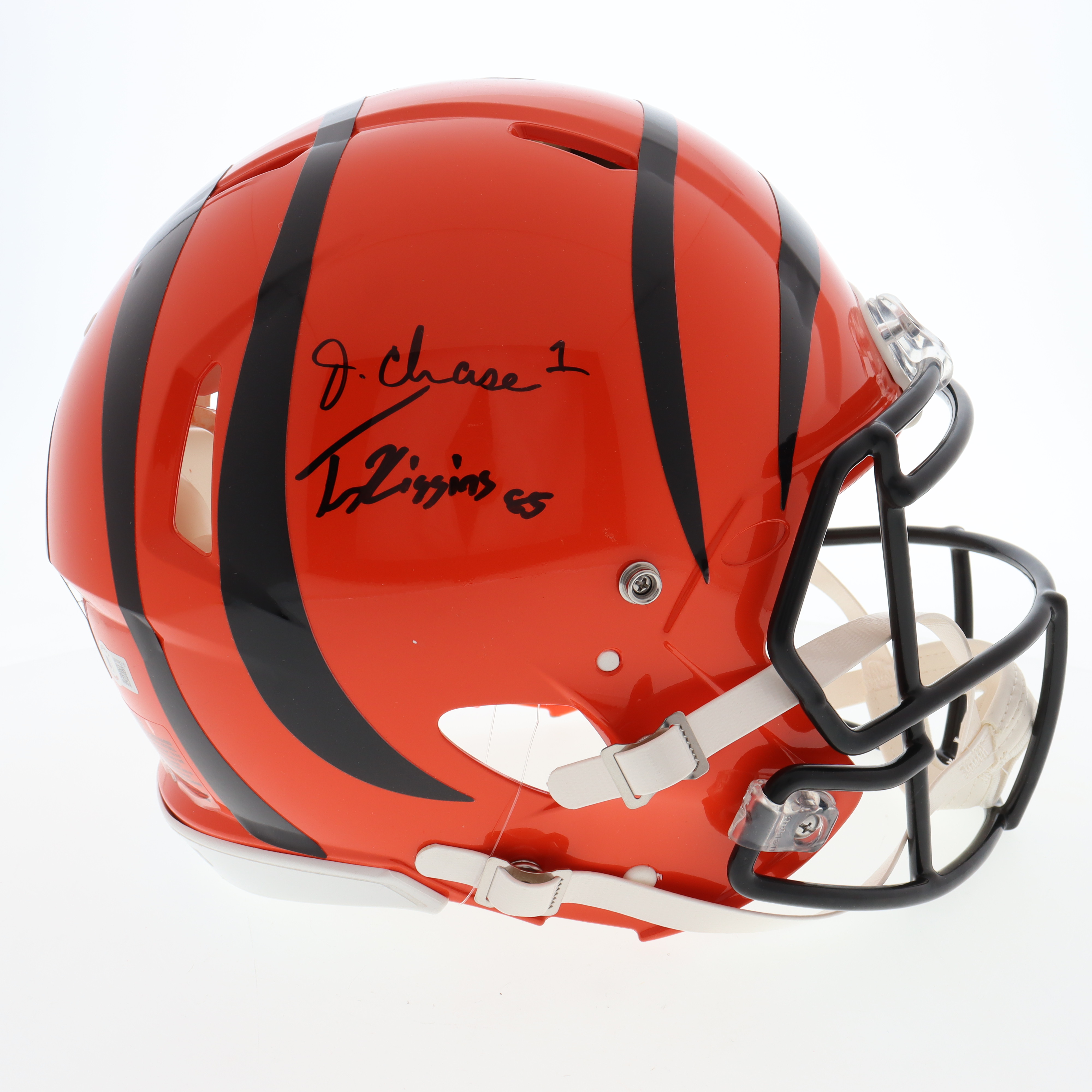 Riddell Cincinnati Bengals full-size authentic on-field Speed helmet. Hand-signed by Ja'Marr Chase and Tee Higgins.