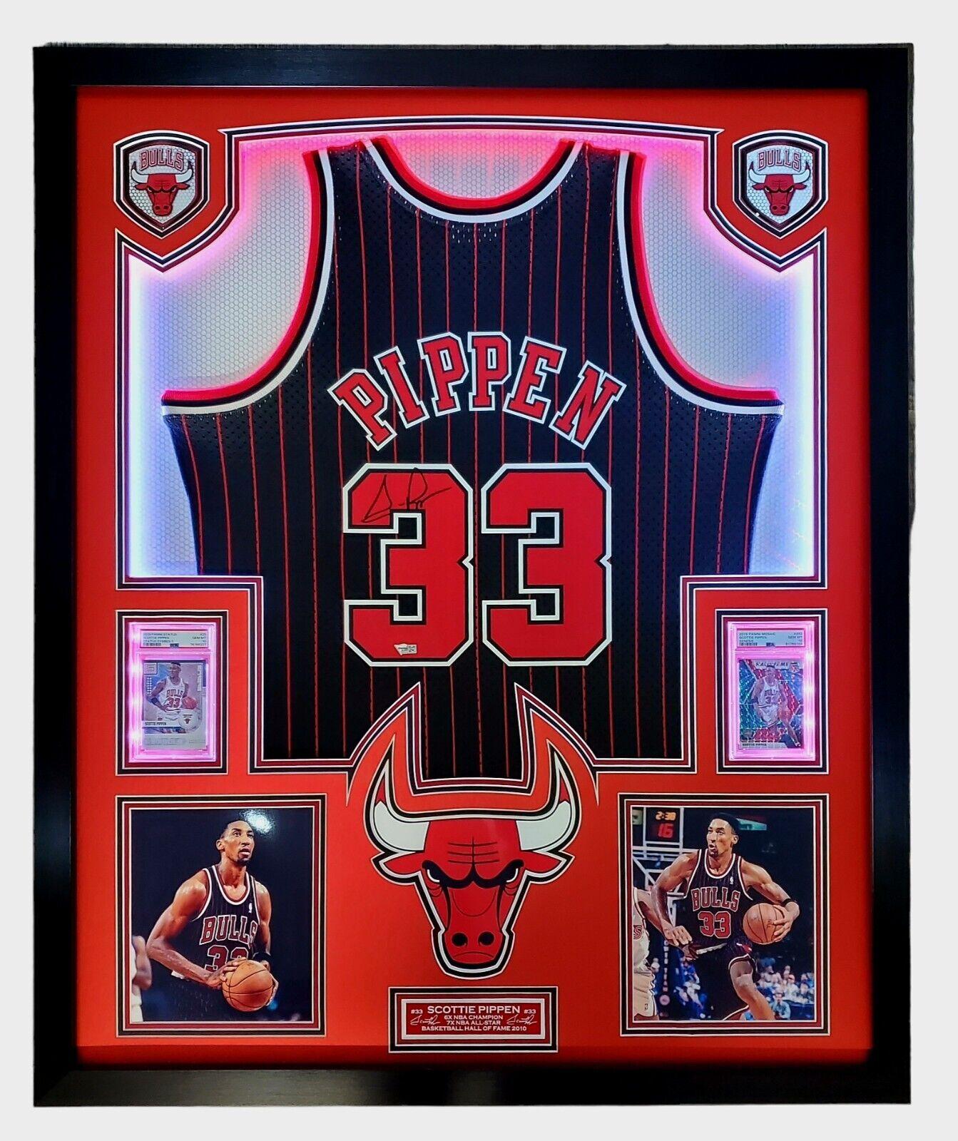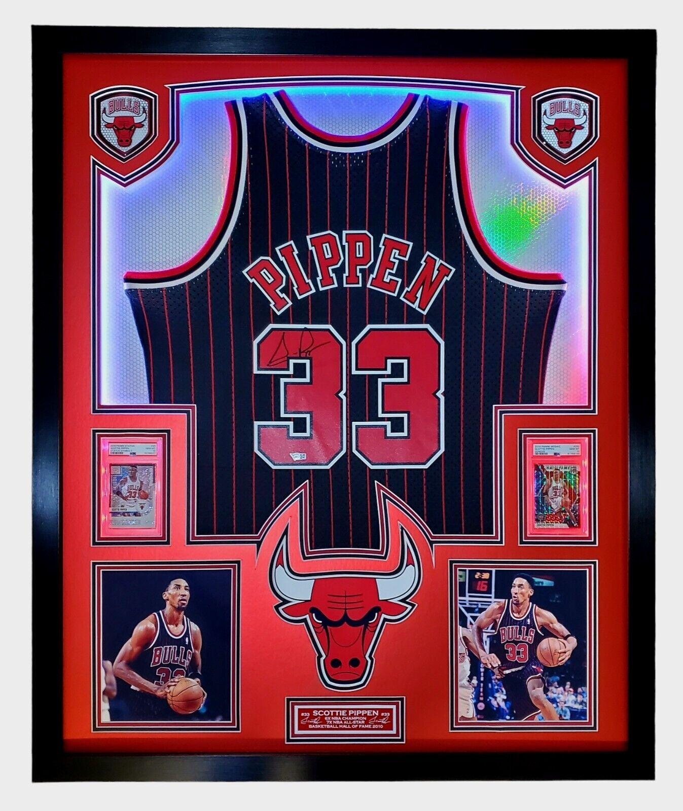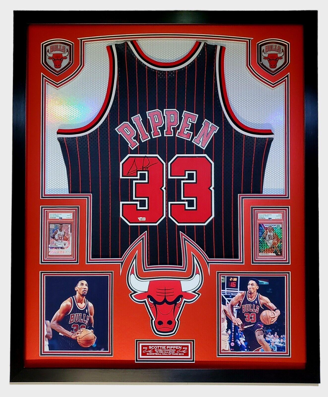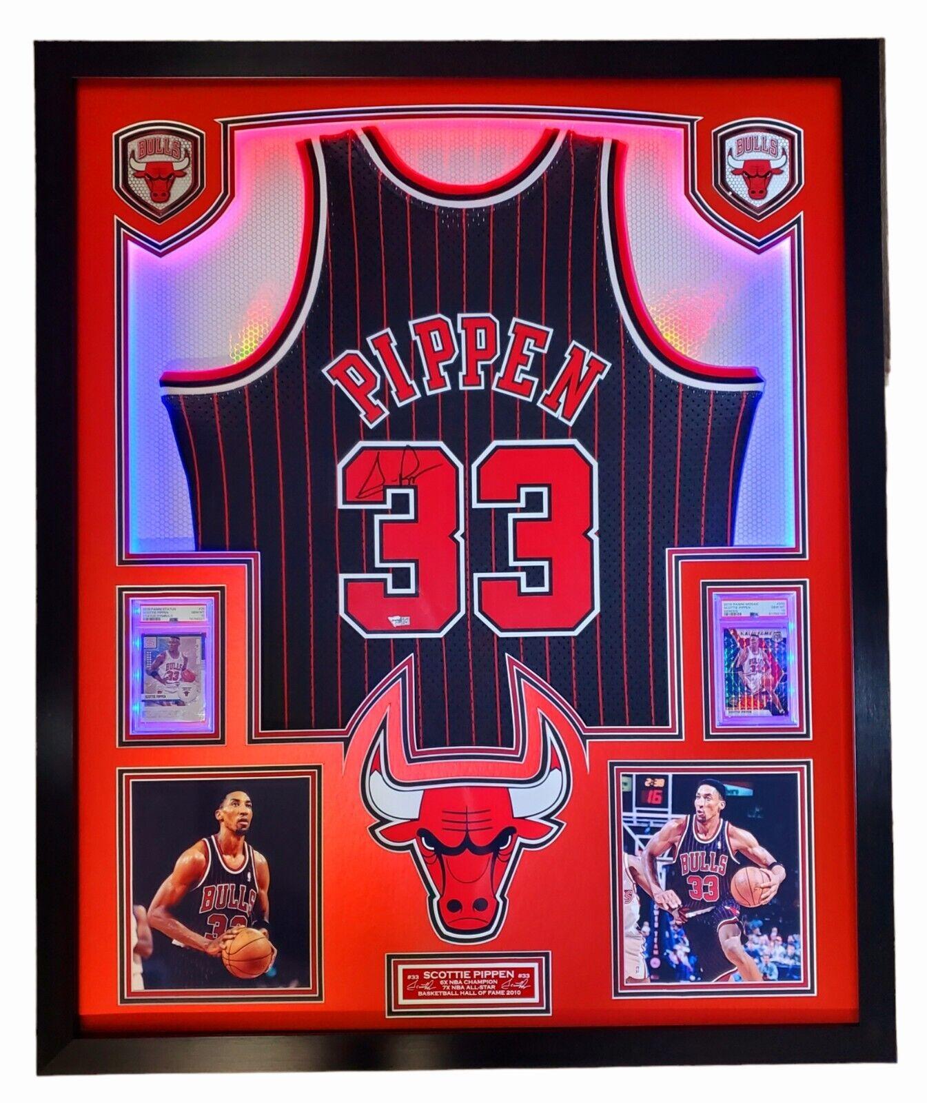 Custom display measures 33" x 42" in size and features a jersey that has been hand-signed by Scottie Pippen (Chicago Bulls, HOF).