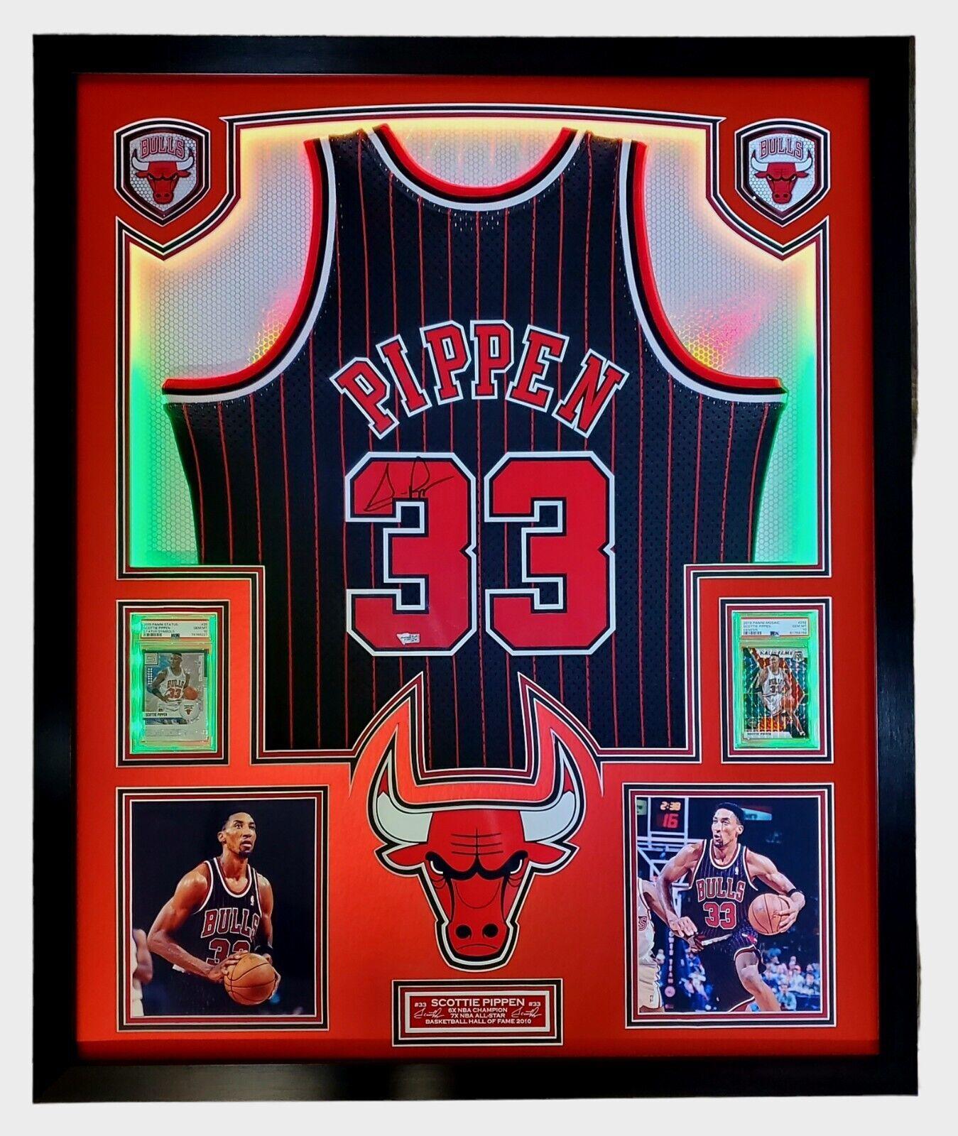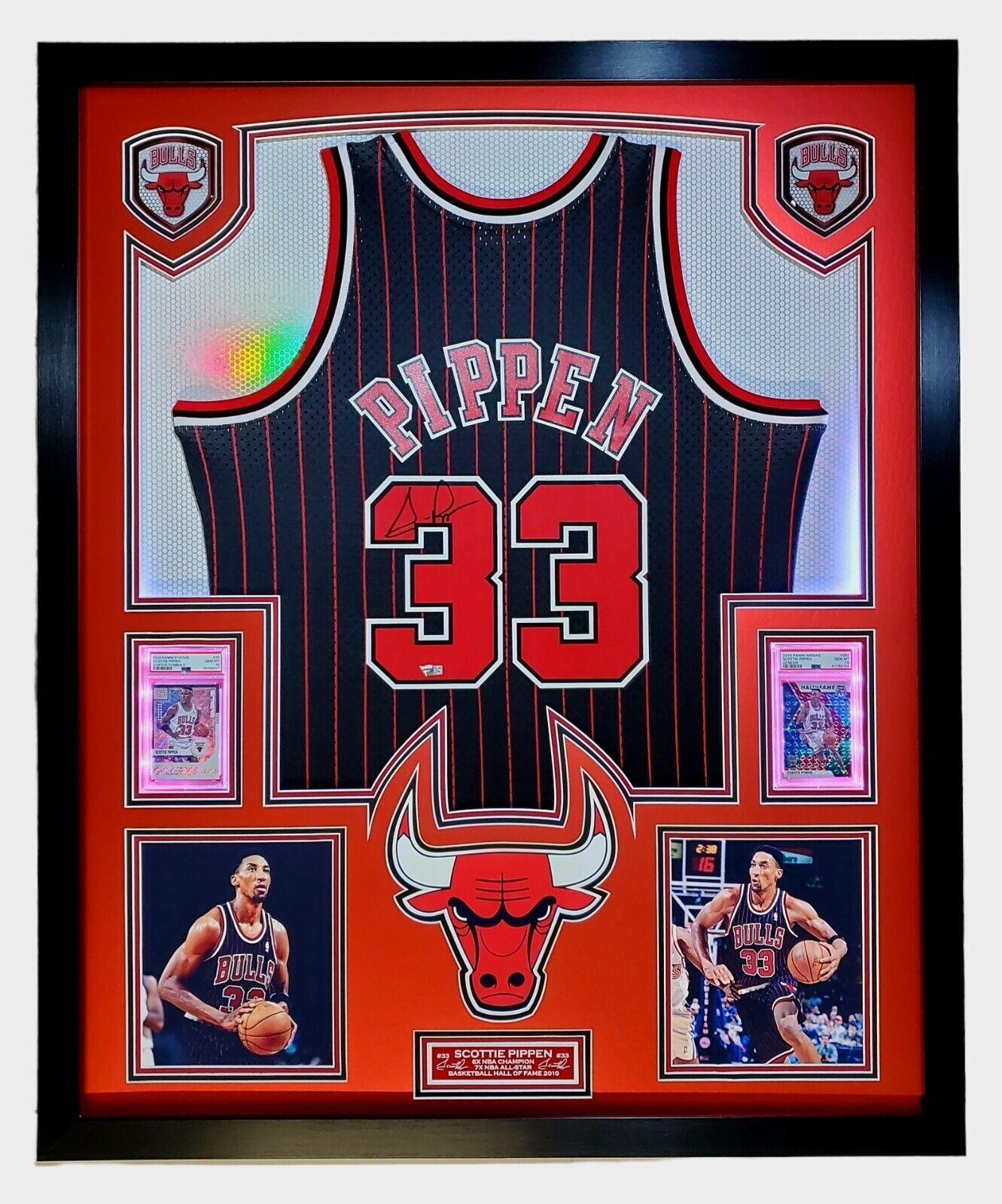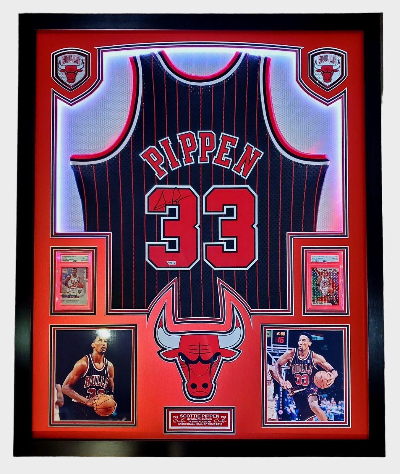Custom display measures 33" x 42" in size and features a jersey that has been hand-signed by Scottie Pippen (Chicago Bulls, HOF).