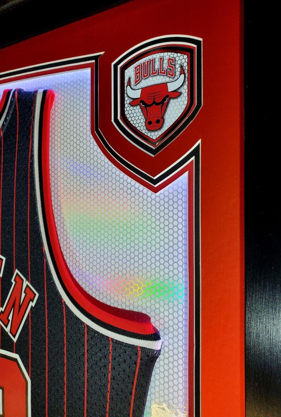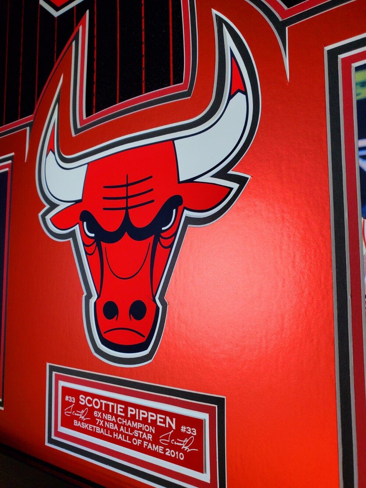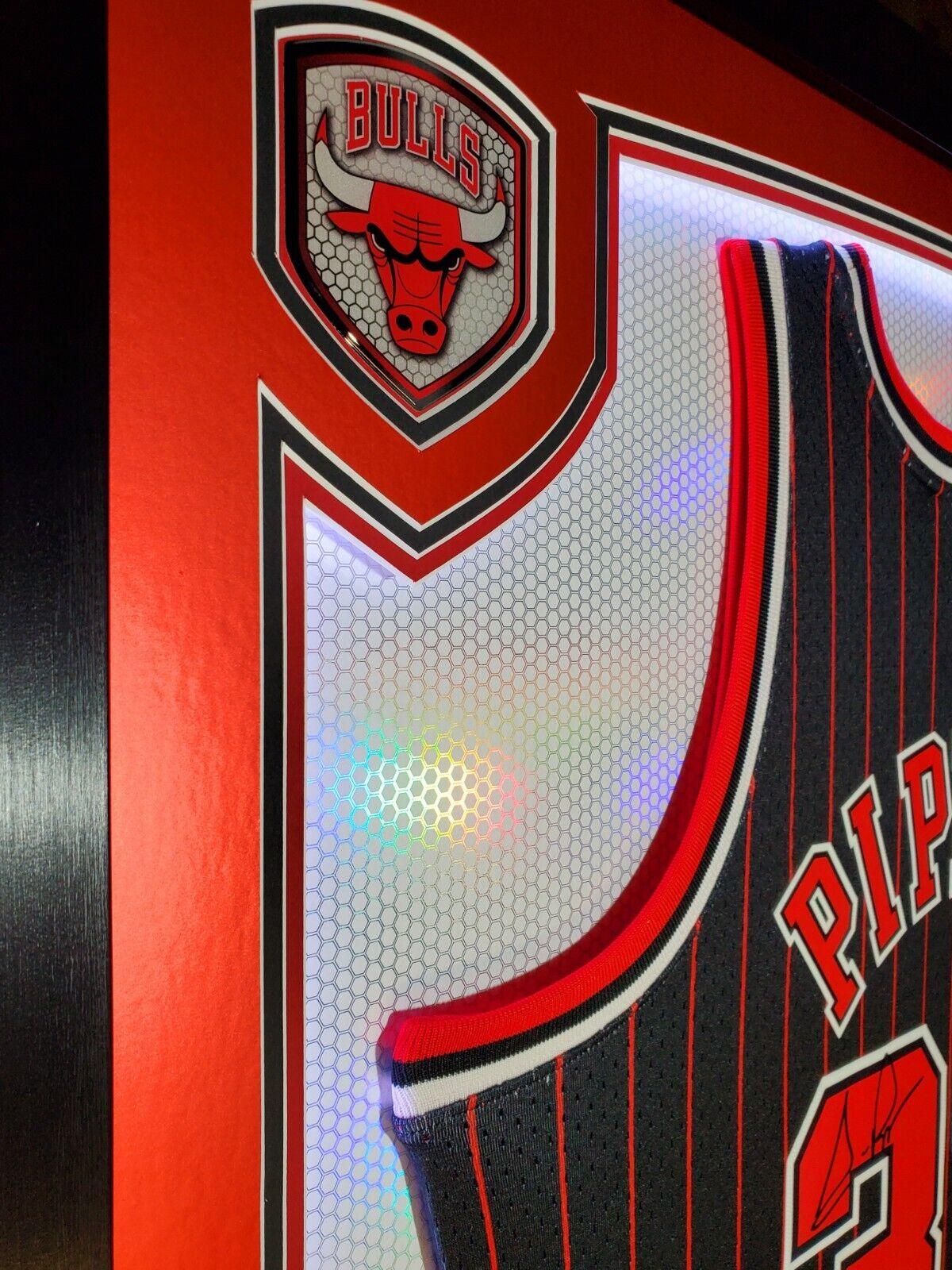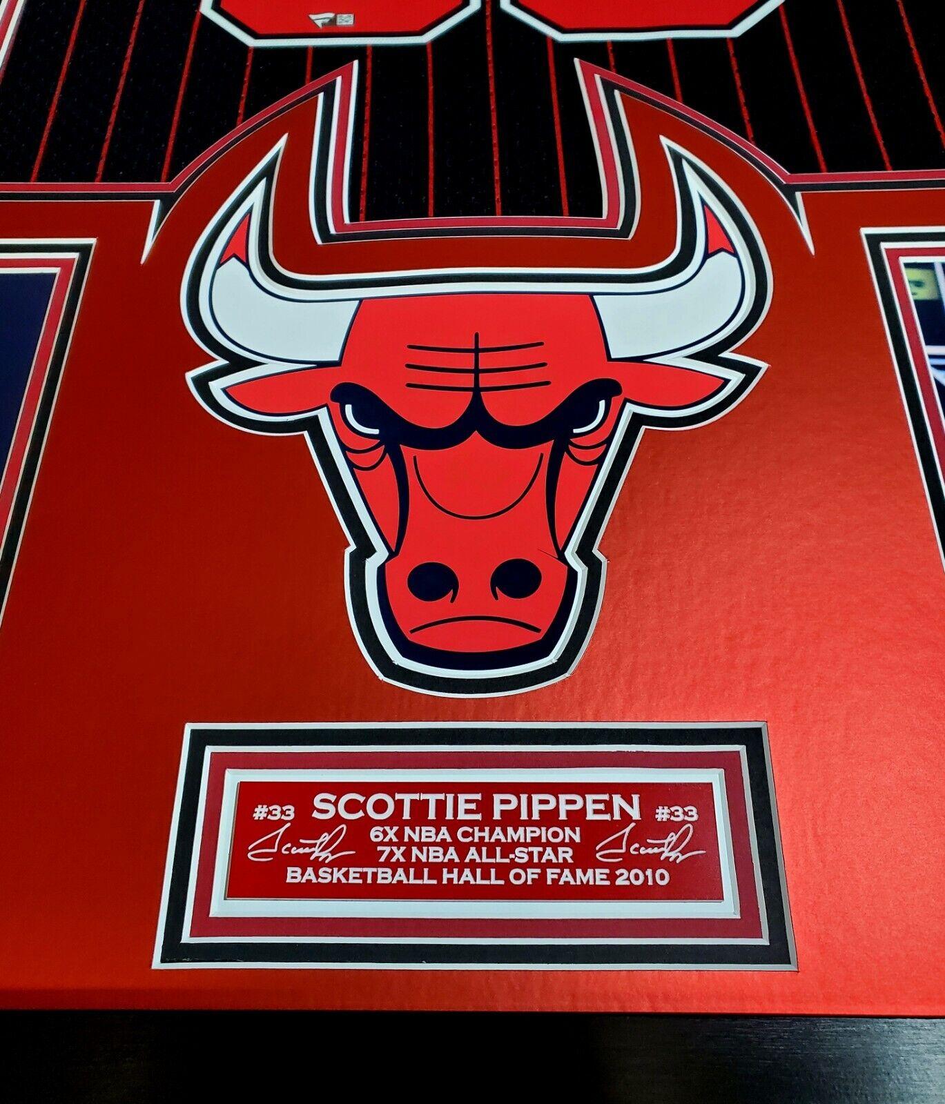 Custom display measures 33" x 42" in size and features a jersey that has been hand-signed by Scottie Pippen (Chicago Bulls, HOF).