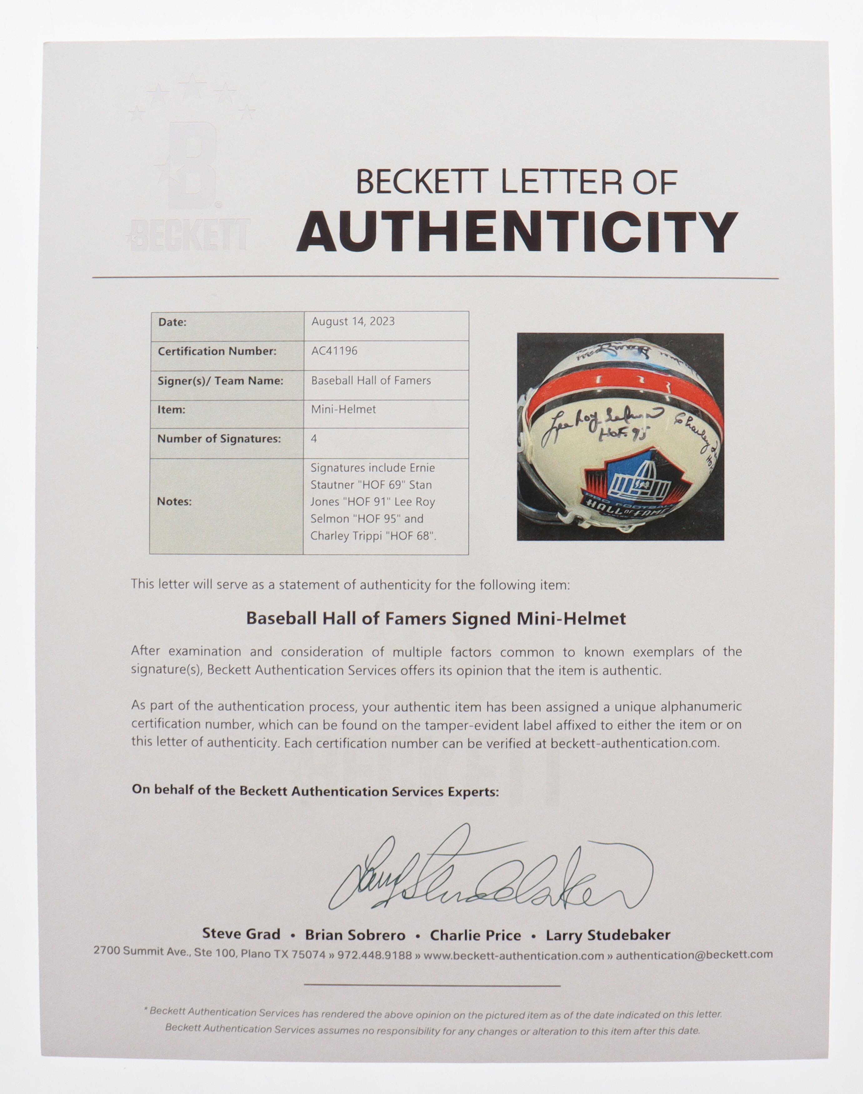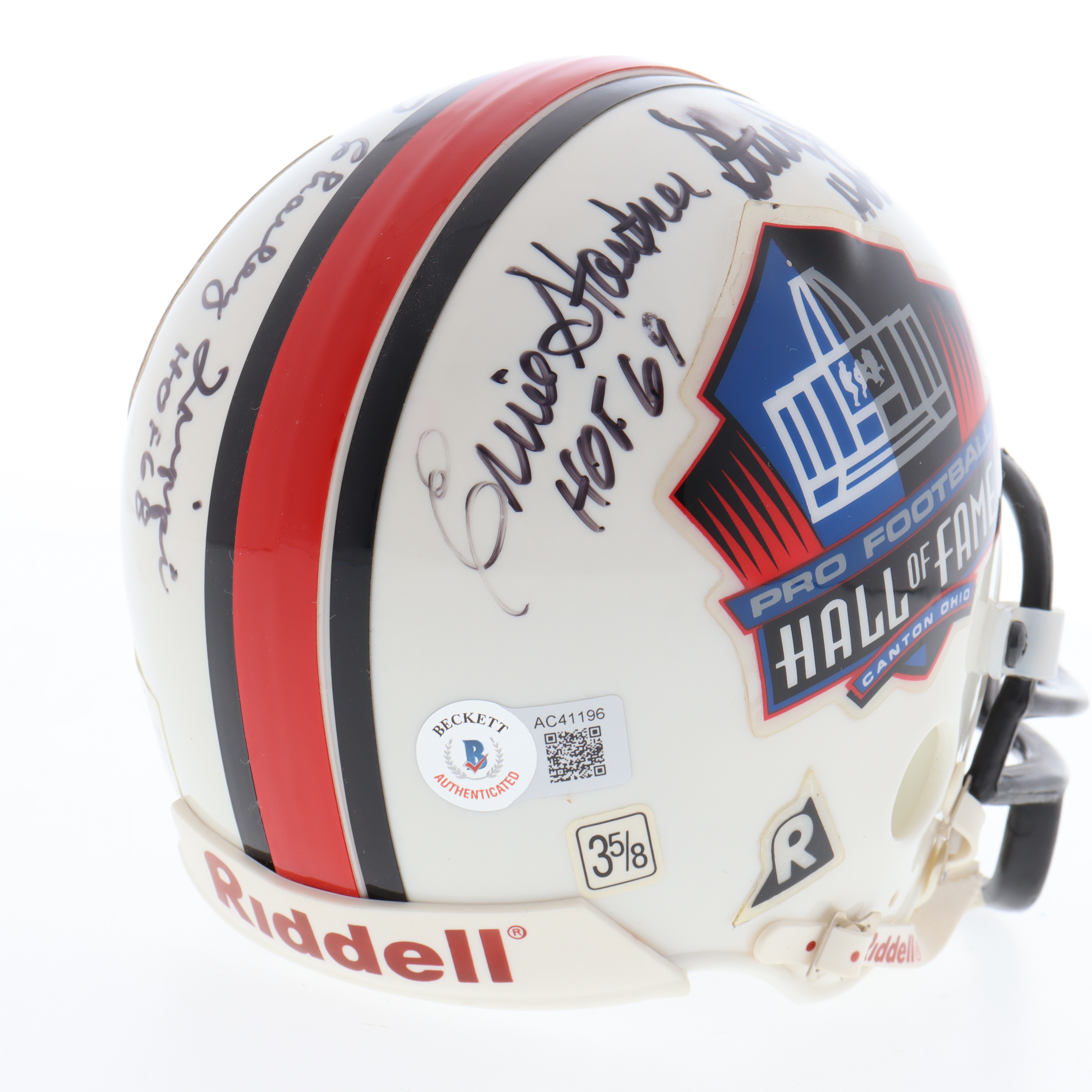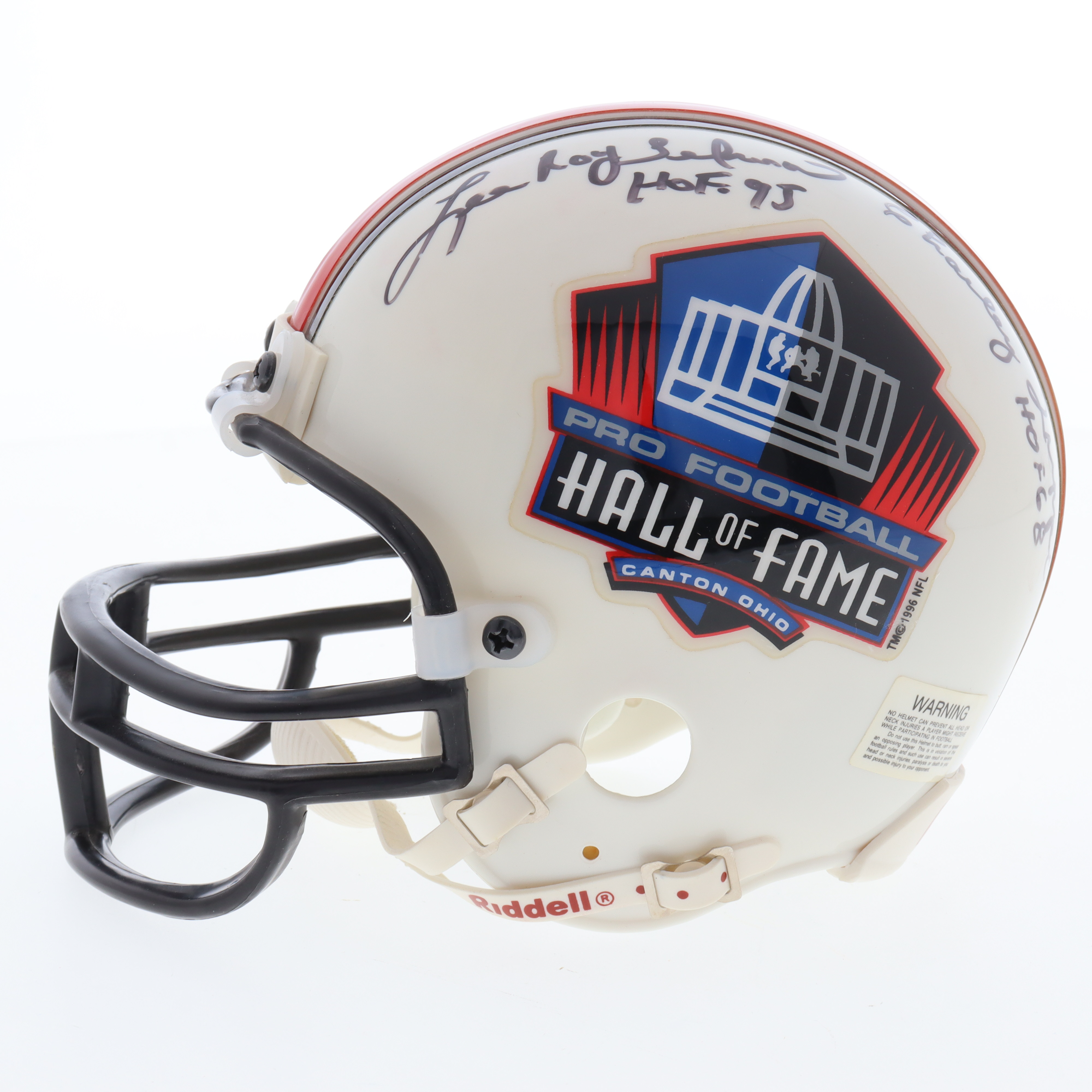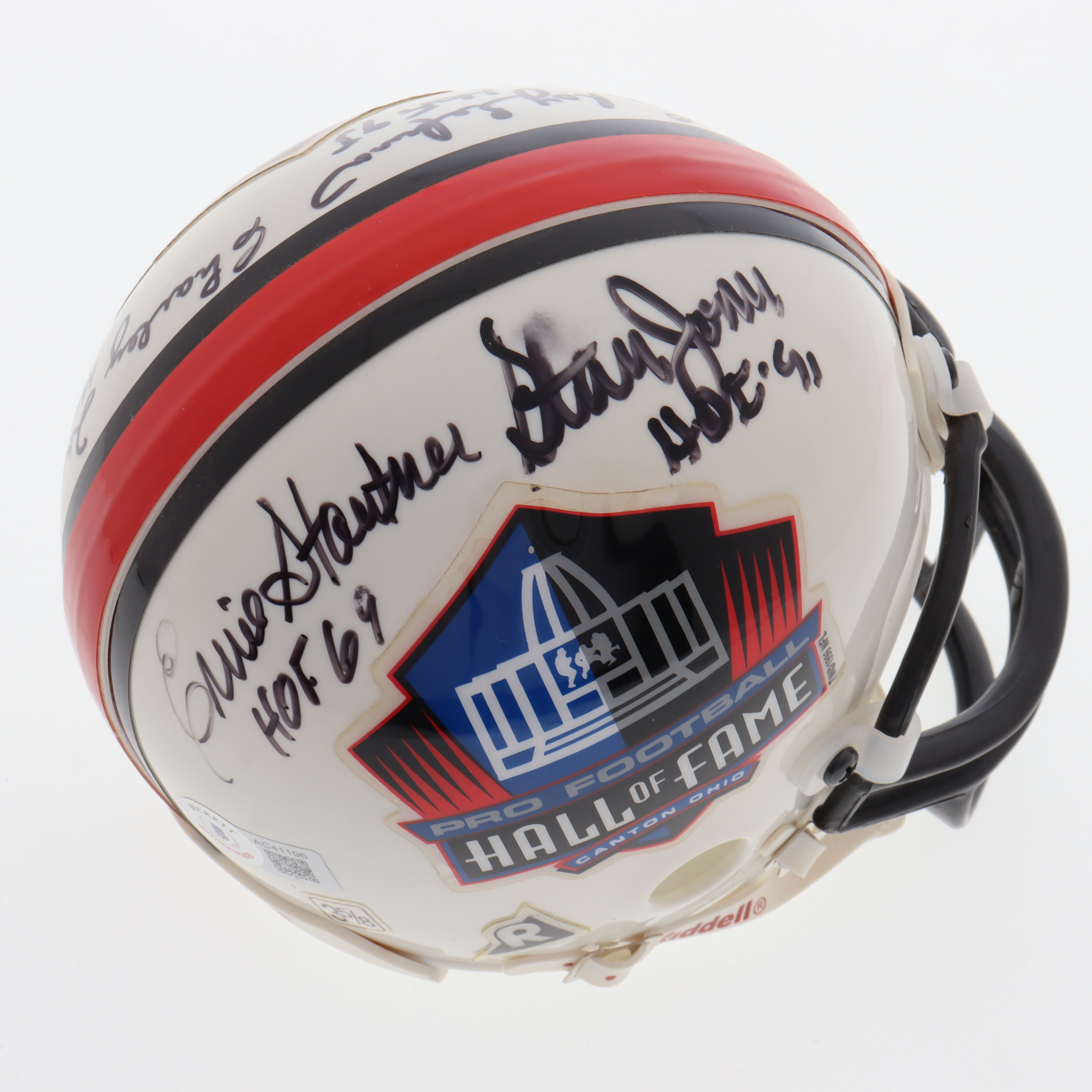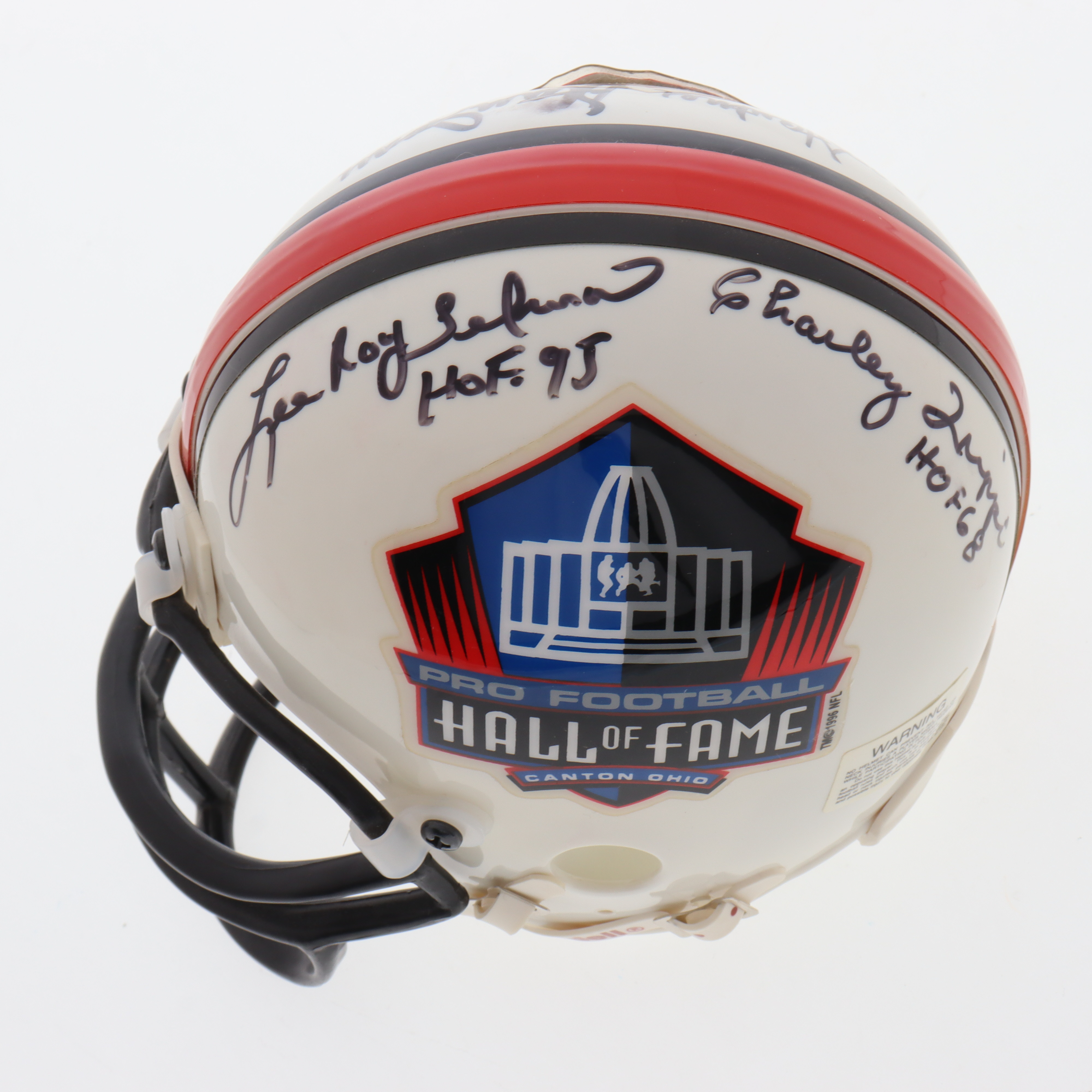 Riddell NFL Hall Of Fame Logo mini helmet. Hand-signed and inscribed by Ernie Stautner (D. 2006, Pittsburgh Steelers, HOF) Stan Jones (D. 2010, Chicago Bears, HOF), Lee Roy Selmon (Tampa Bay Buccaneers, HOF) and Charley Trippi (D. 2022, Chicago Cardinals, HOF).