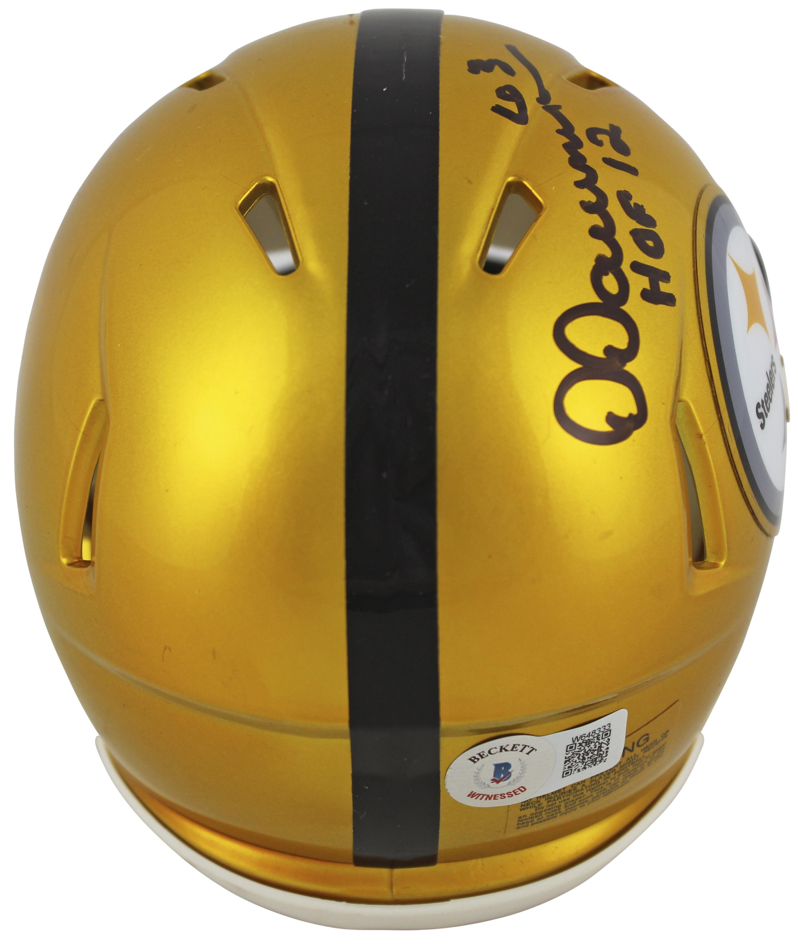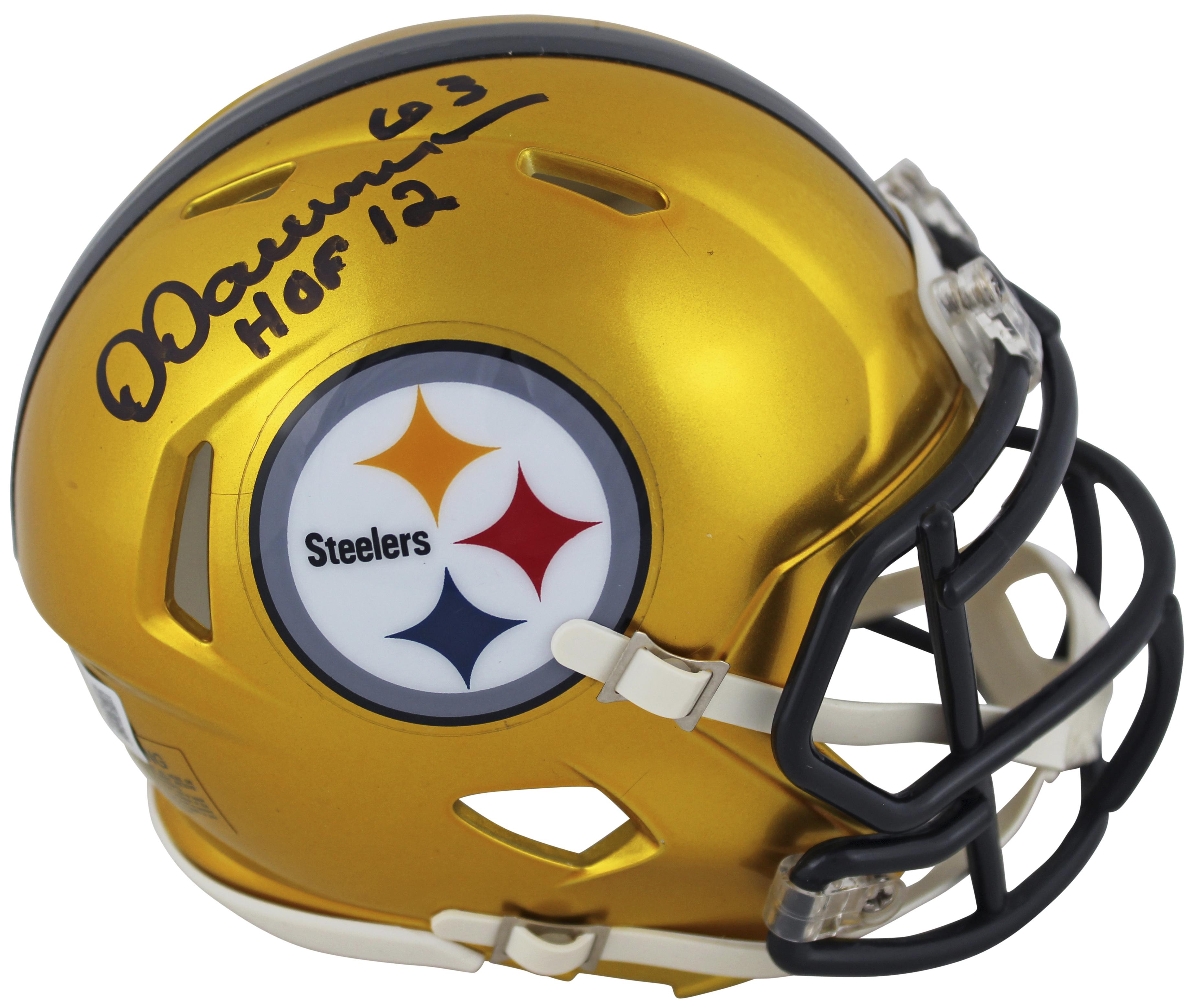 Riddell Pittsburgh Steelers Flash Alternate Speed mini helmet. Hand-signed and inscribed by Dermontti Dawson (HOF).