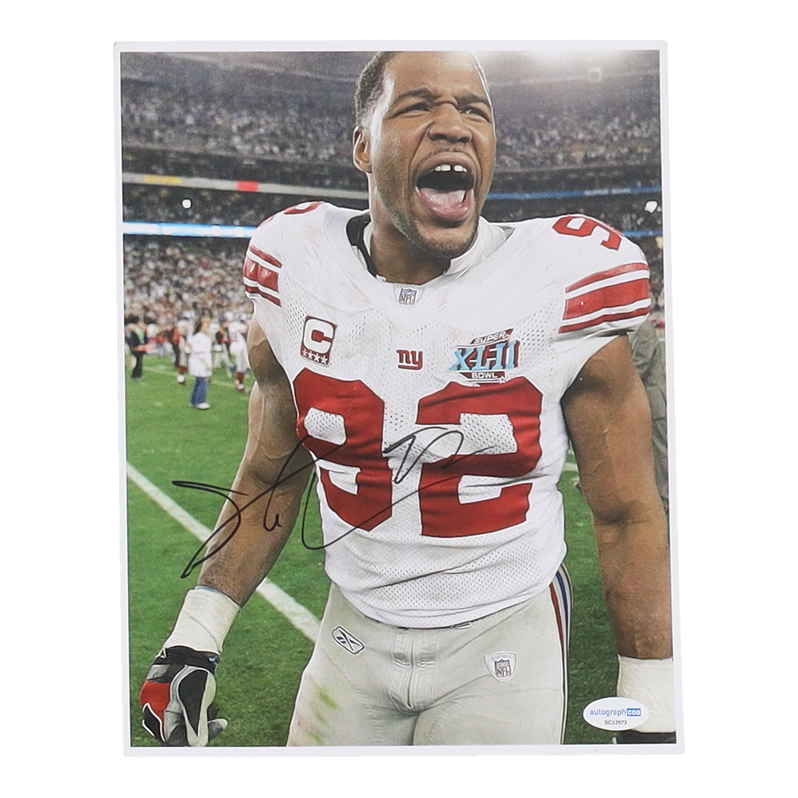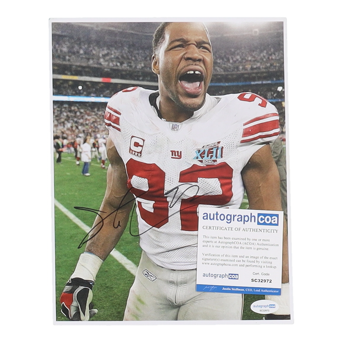 Photo measures 8" x 10" in size and has been hand-signed by Michael Strahan. (New York Giants, HOF)