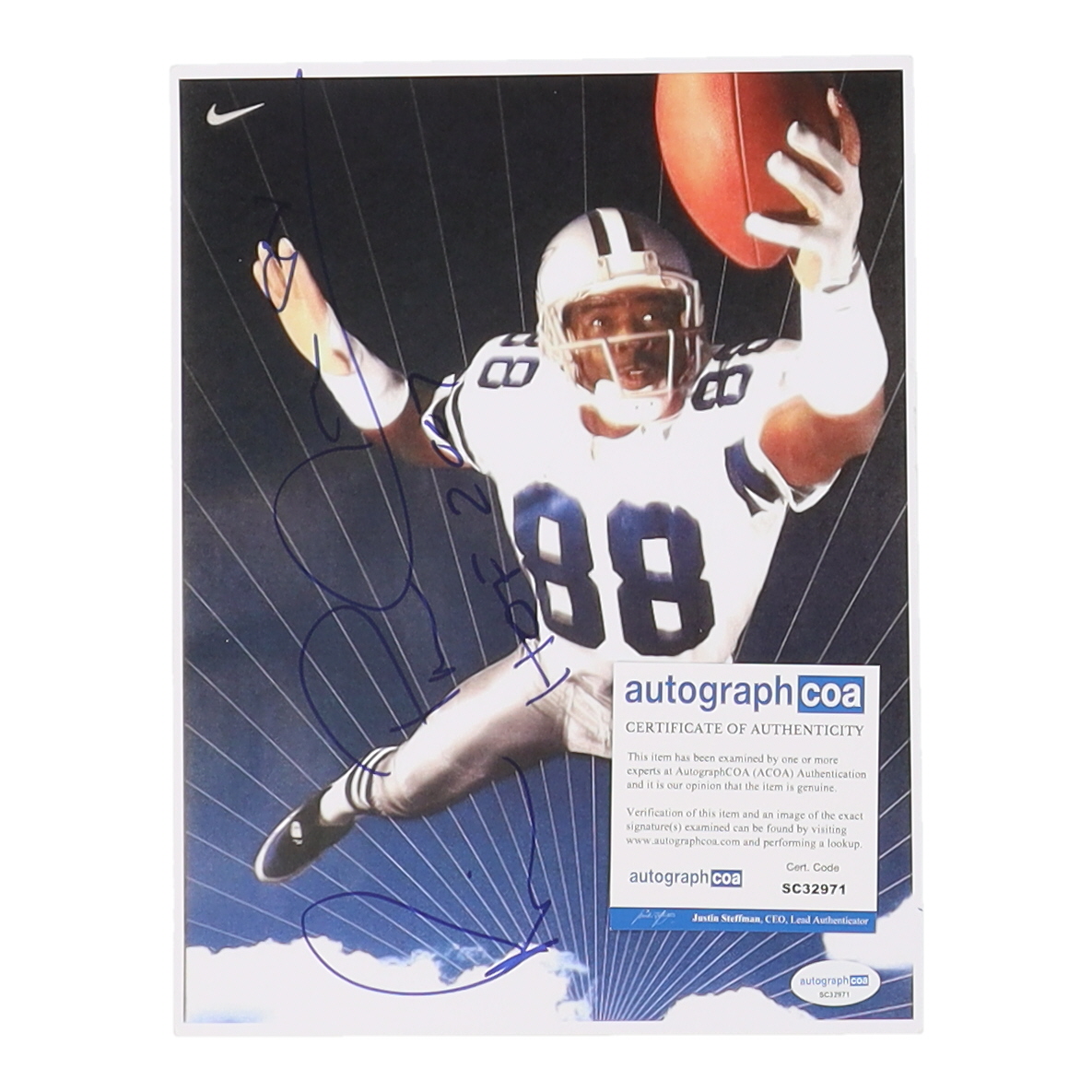 Photo measures 8" x 10" in size and has been hand-signed and inscribed by Michael Irvin (Dallas Cowboys, HOF).