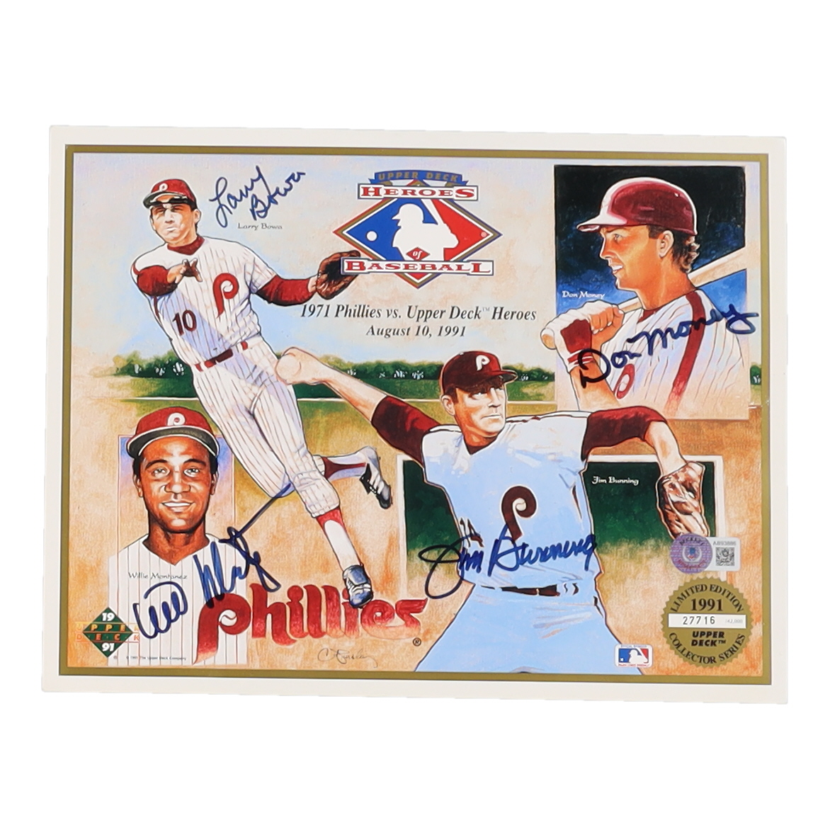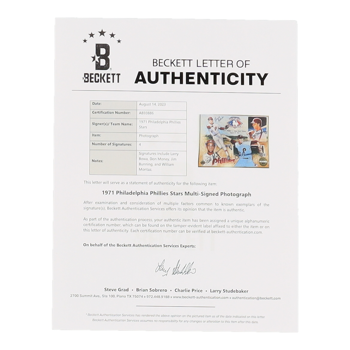 Photo measures 8" x 10" in size and has been hand-signed by Jim Bunning (D. 2017, HOF), Willie Montanez, Don Money and Larry Bowa (Philadelphia Phillies).