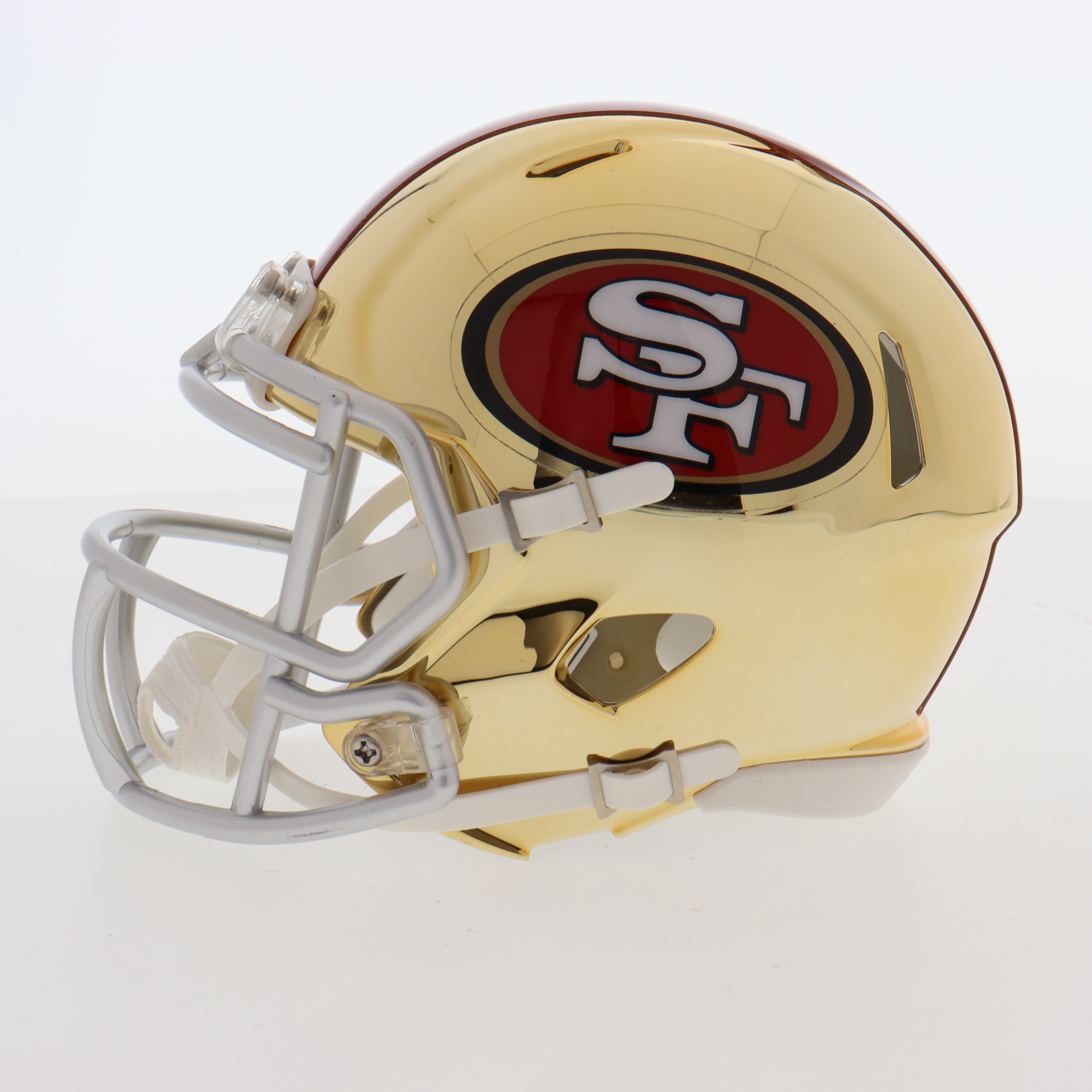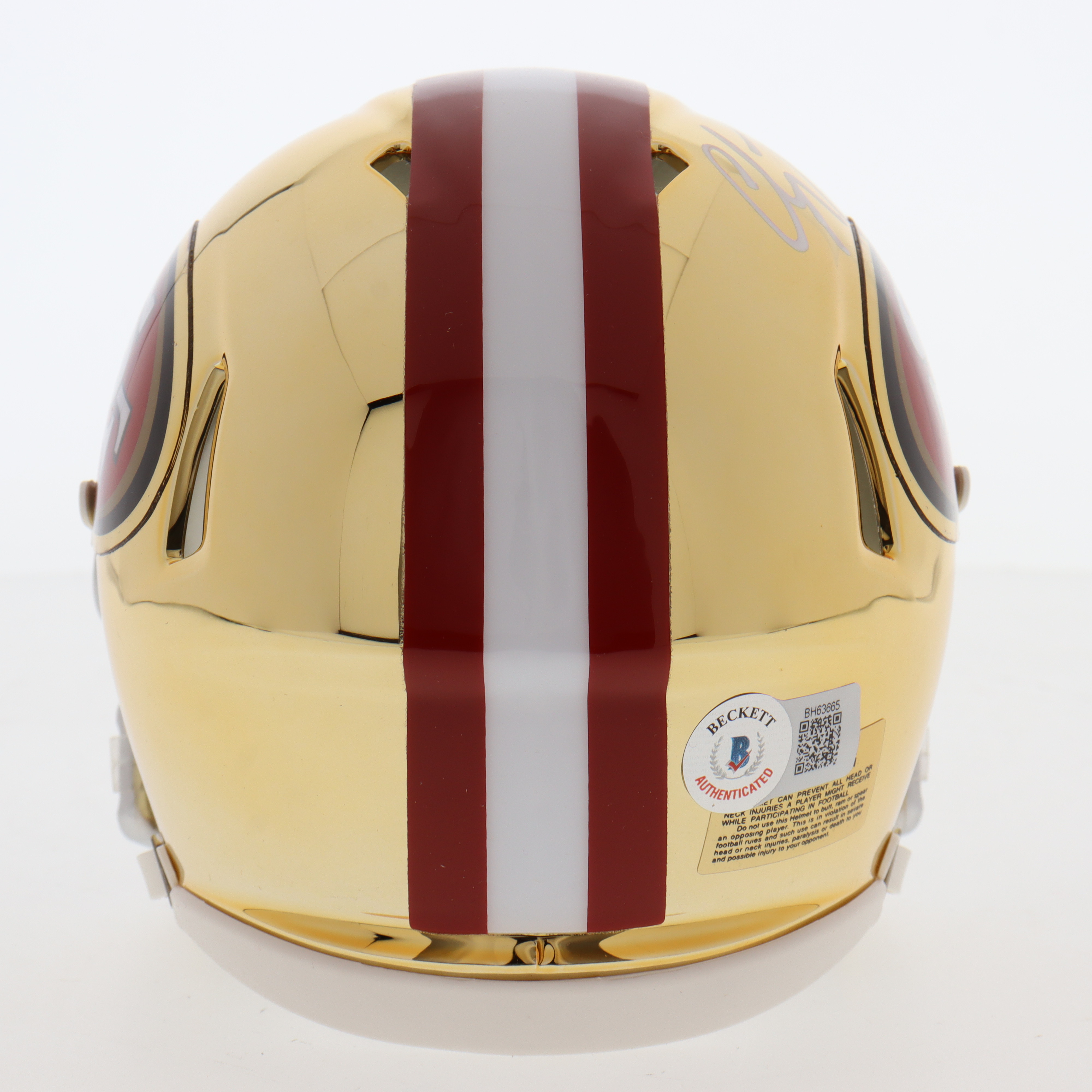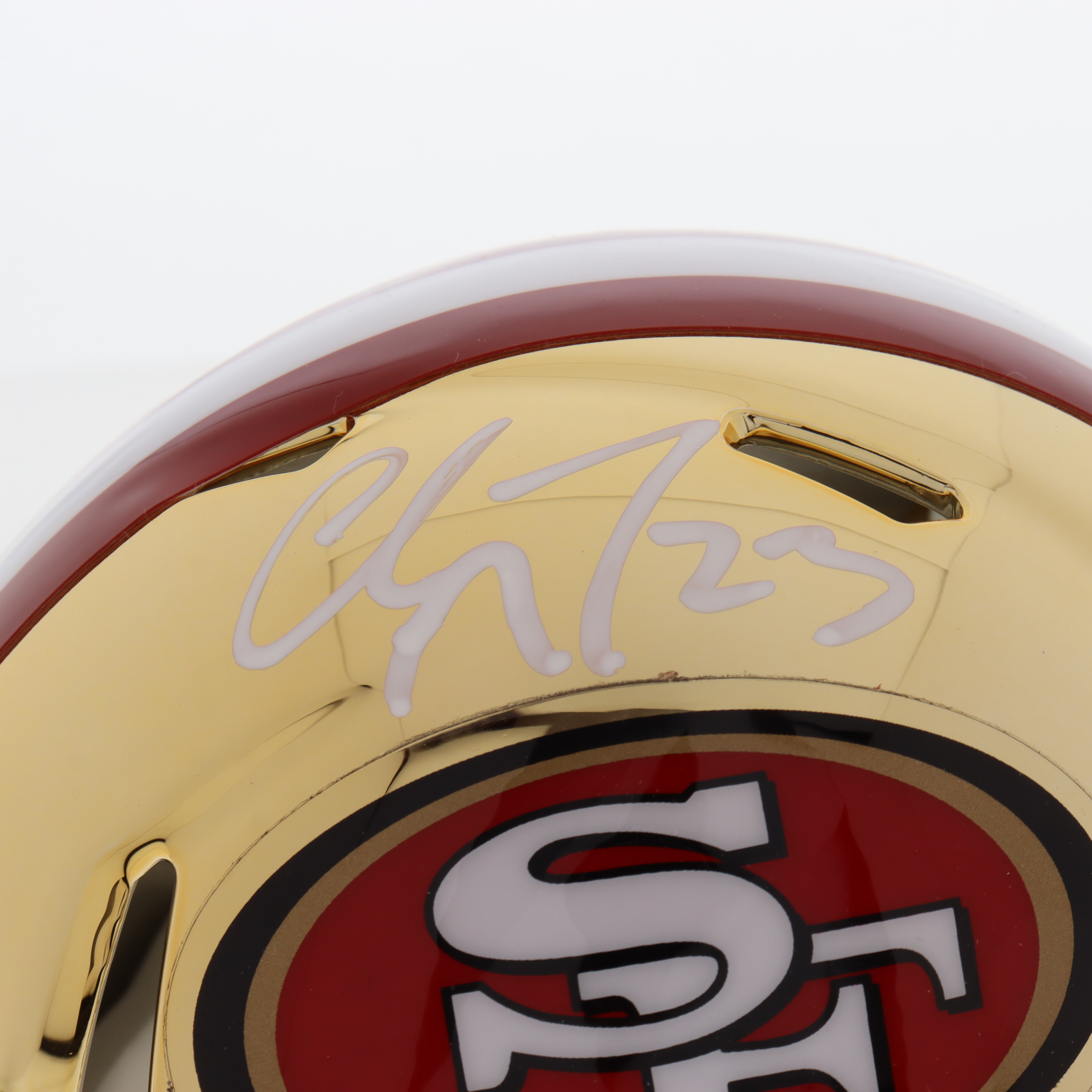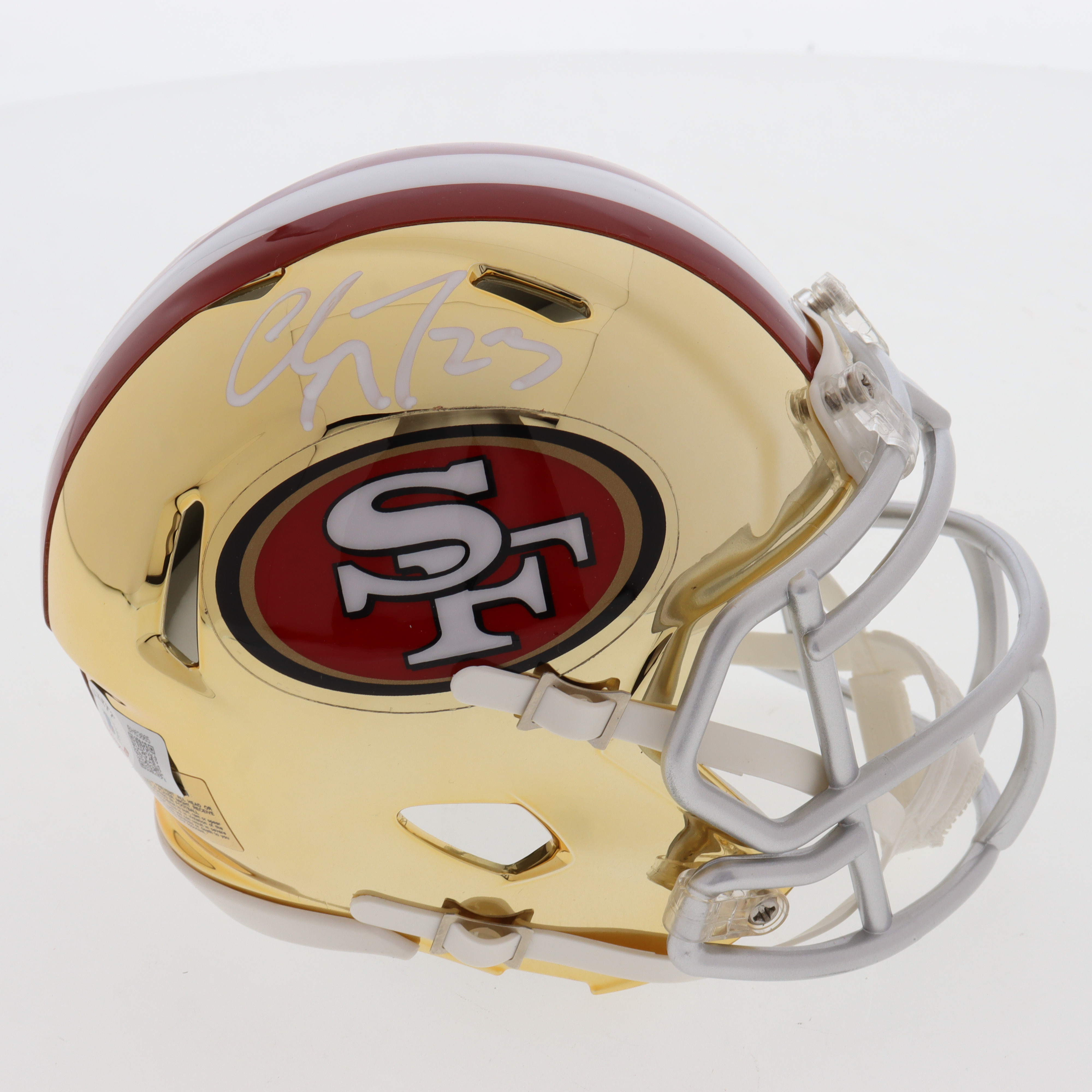 Riddell San Francisco 49ers chrome speed mini helmet. Hand-signed by Christian McCaffrey.
