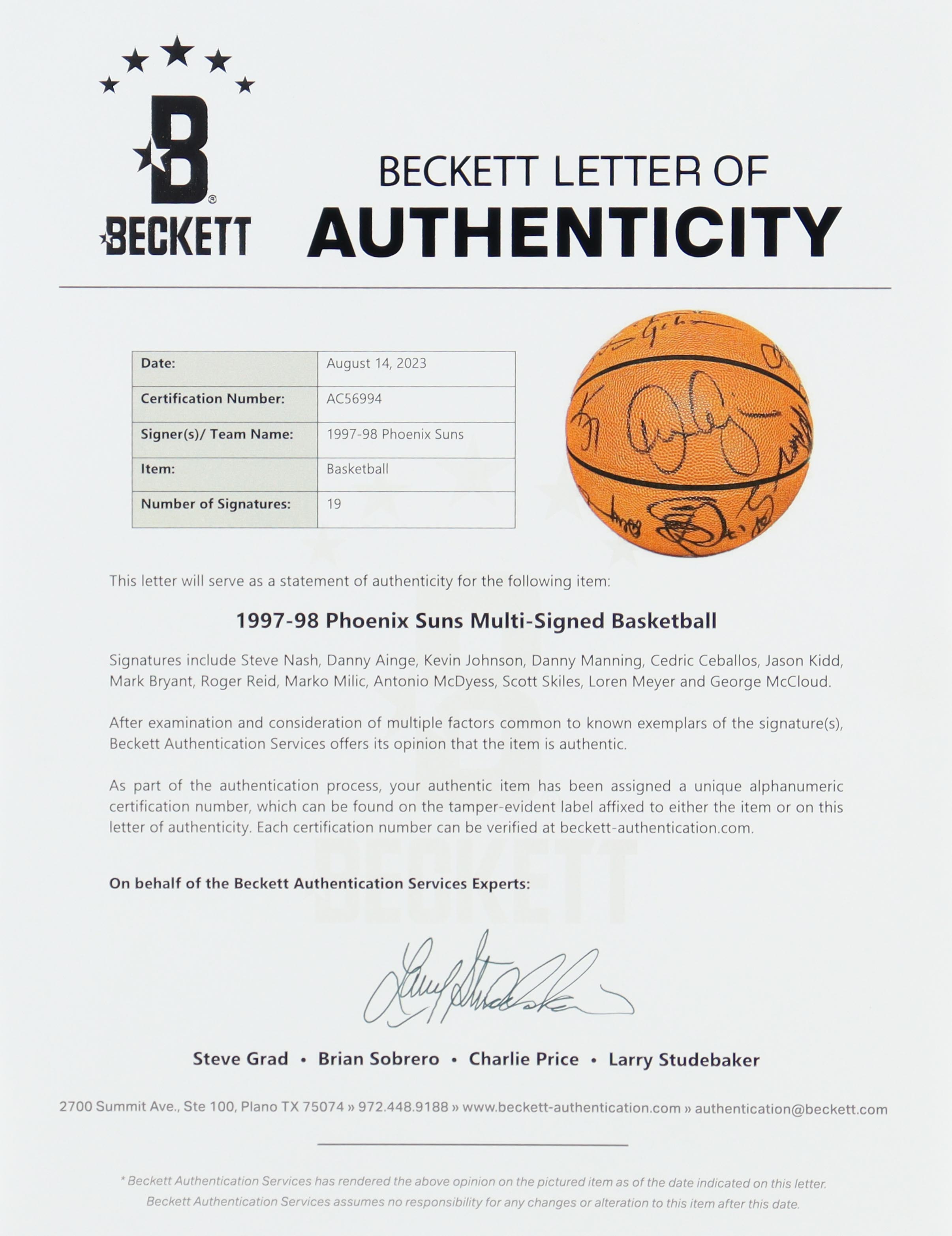 1997-98 Suns NBA Basketball Team-Signed By Steve Nash, Jason Kidd, Kevin Johnson, Danny Manning, Cedric Ceballos, Danny Ainge (Beckett)