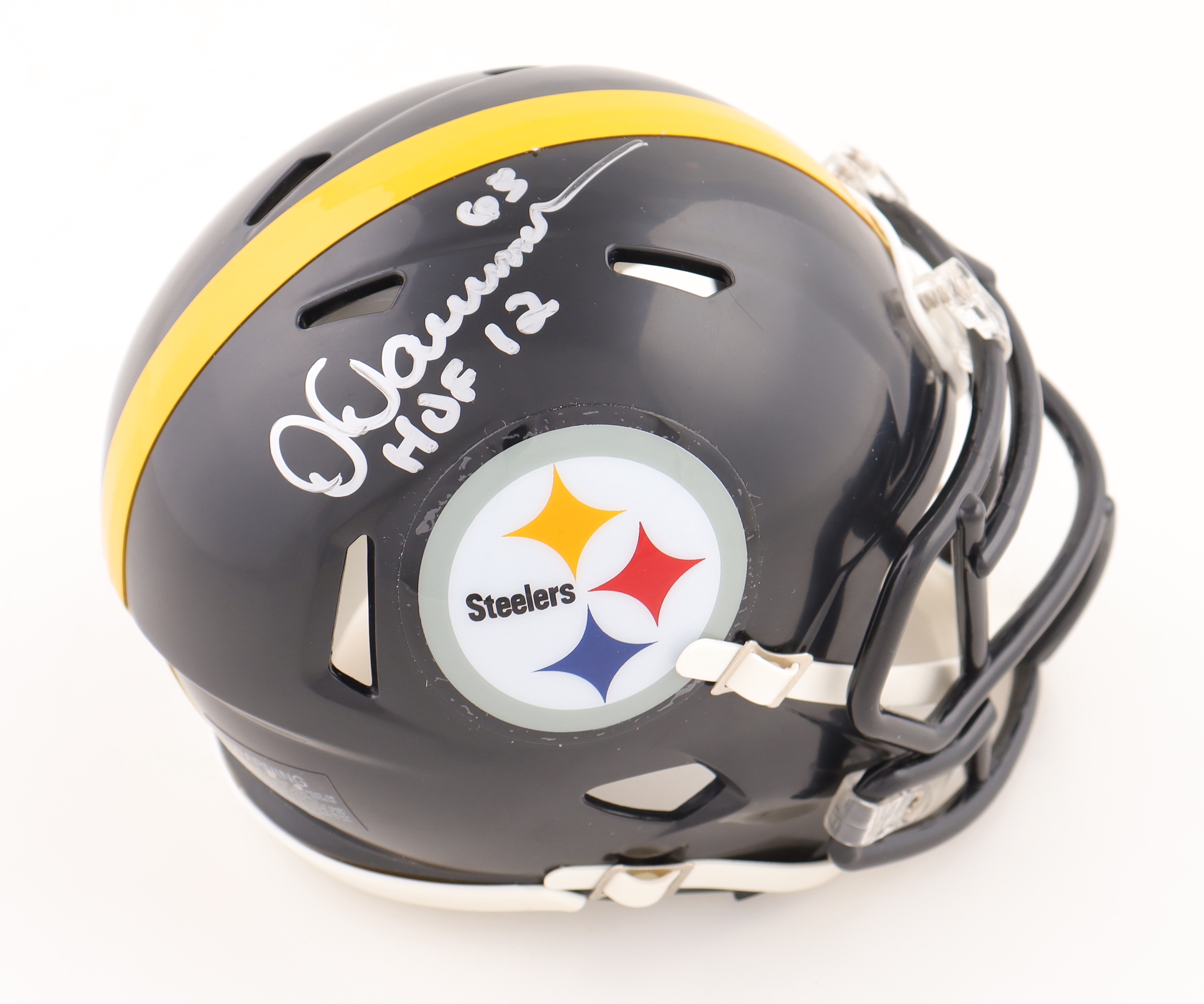 Riddell Pittsburgh Steelers Speed mini helmet. Hand-signed and inscribed by Dermontti Dawson (HOF).