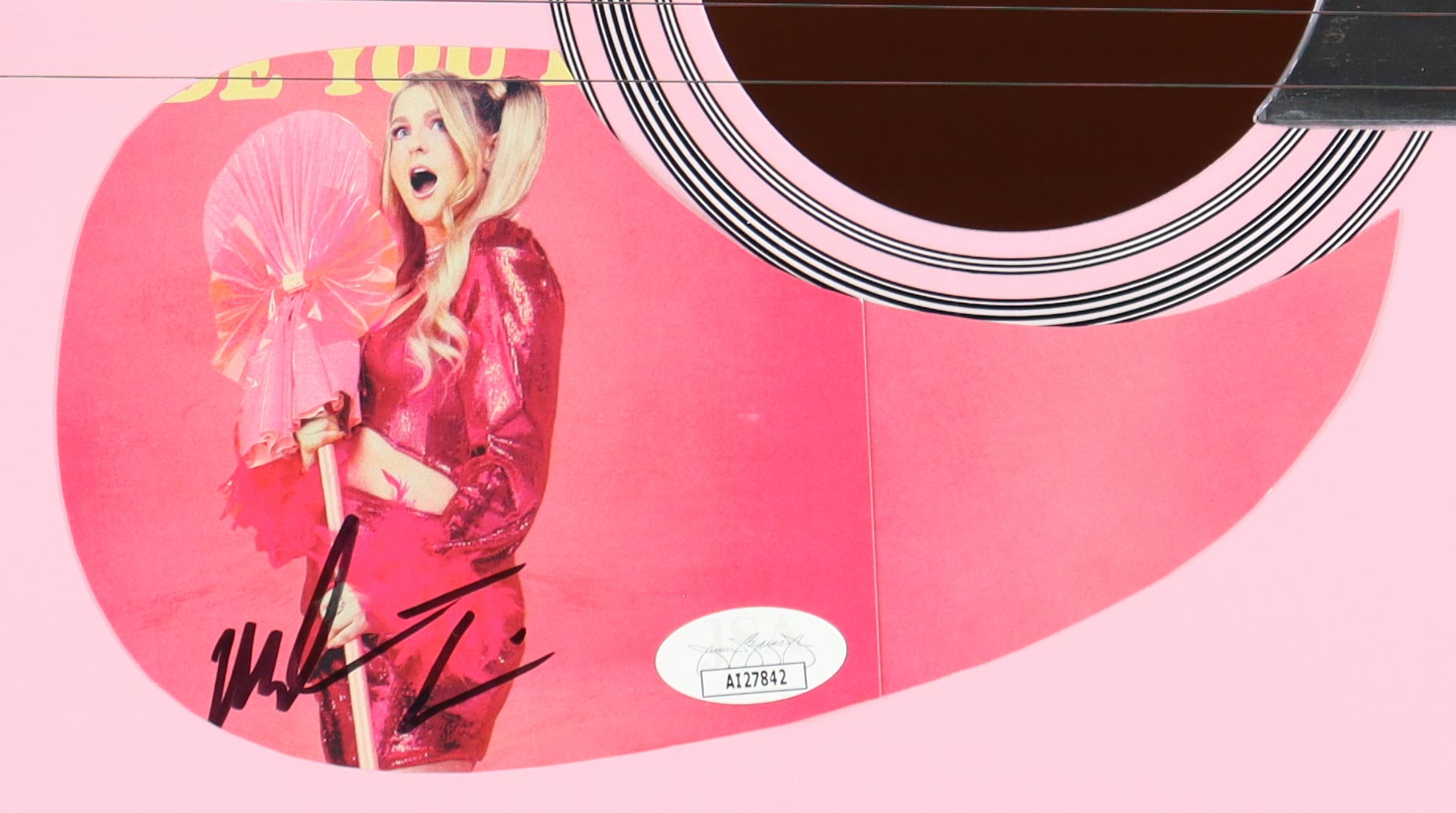 Guitar measures 38” in size has been hand-signed on the pick-guard by Meghan Trainor.