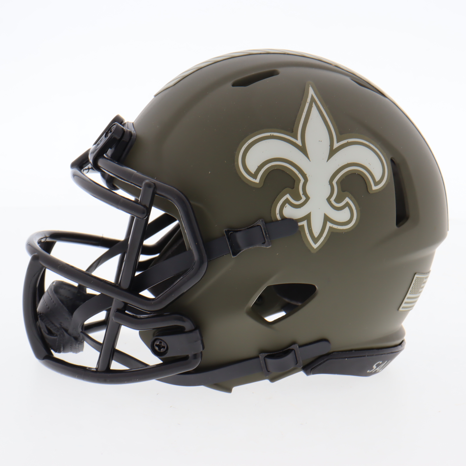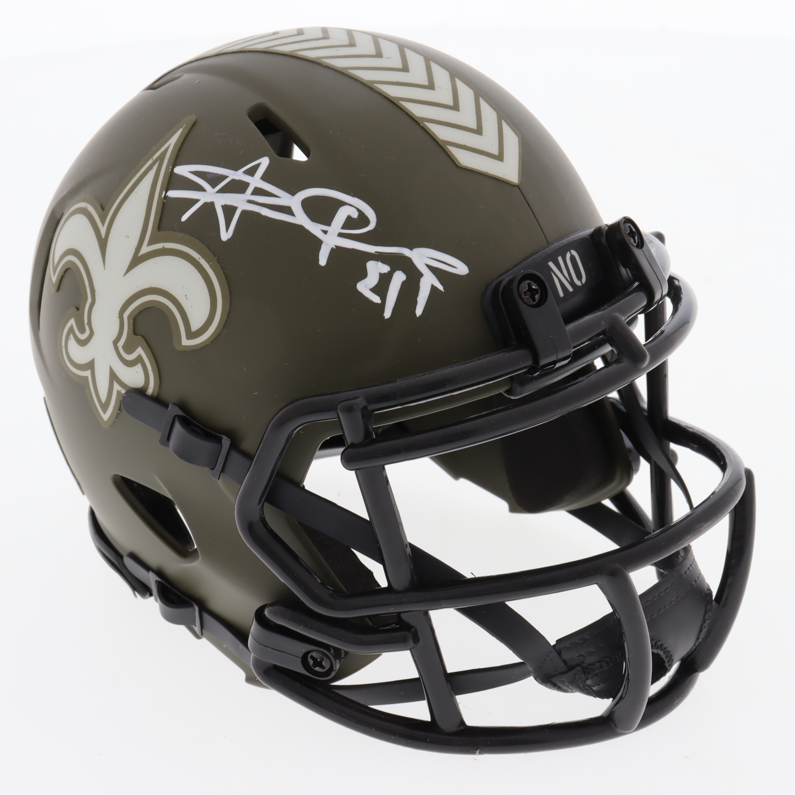 Riddell New Orleans Saints Salute to Service alternate speed mini helmet. Hand-signed by Alvin Kamara.