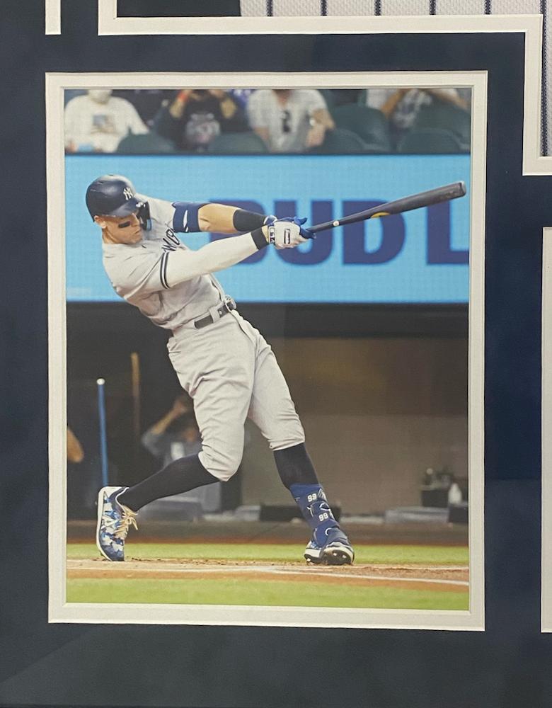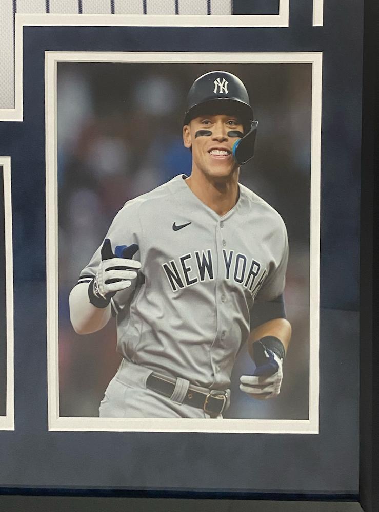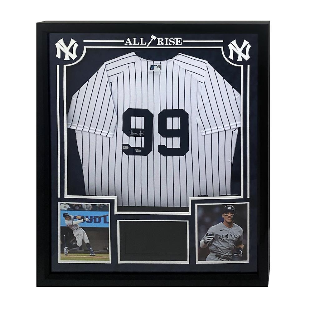 Custom Frame measures 34" x 44" in size and features an Authentic Yankees jersey that has been hand-signed by Aaron Judge. The display also includes two unsigned 8" x 10" photos of Judge as well as a 10" video monitor pre-programed with a continuous reel of Judge highlights.