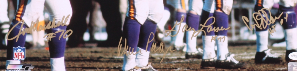 Photo measures 16" x 20" in size and was signed in gold paint pen by (4) members of the Minnesota Vikings Purple People Eaters. The autographs include Alan Page (HOF), Carl Eller (HOF), Jim Marshall and Gary Larsen.
