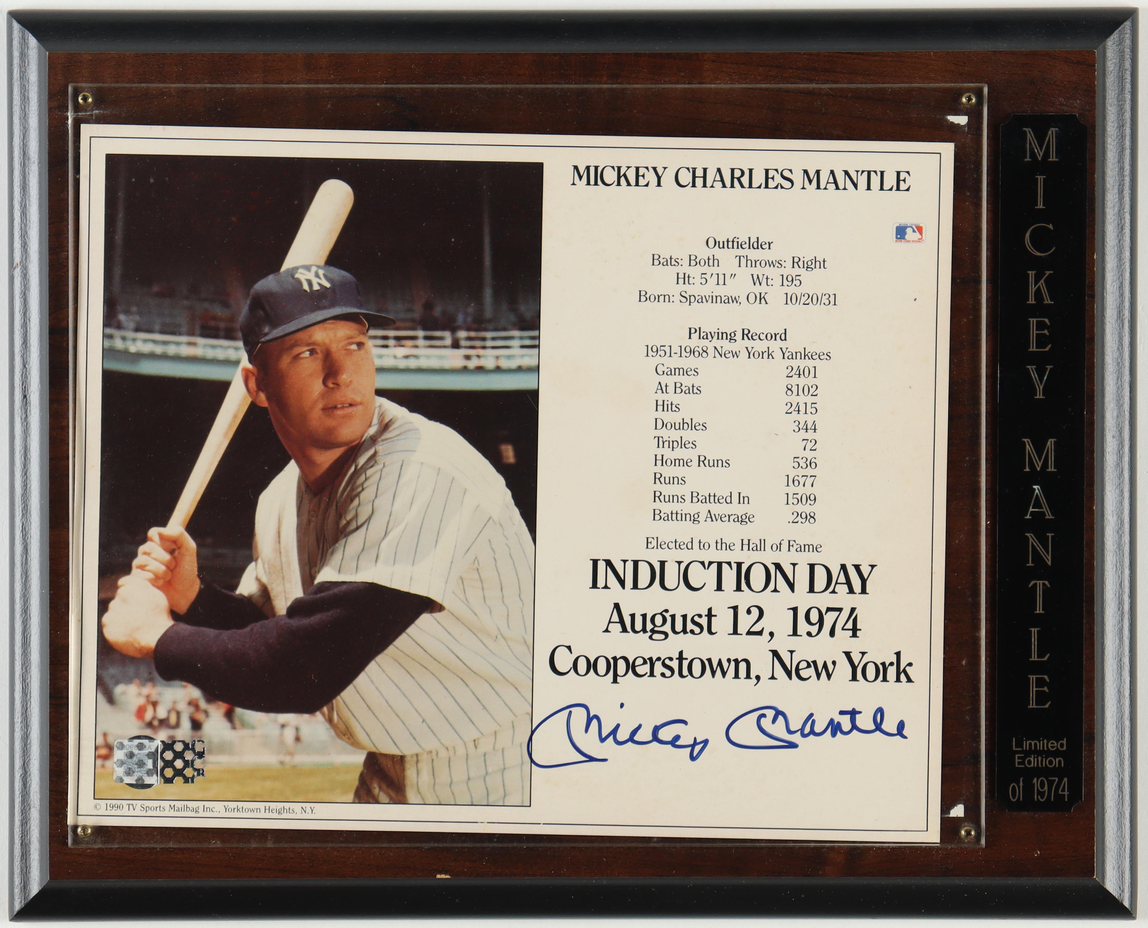 Plaque measures 10" x 13" in size and features a photo that has been hand-signed by Mickey Mantle (D. 1995, New York Yankees, HOF). Please note the photo inside the plaque has fallen and is not level anymore.