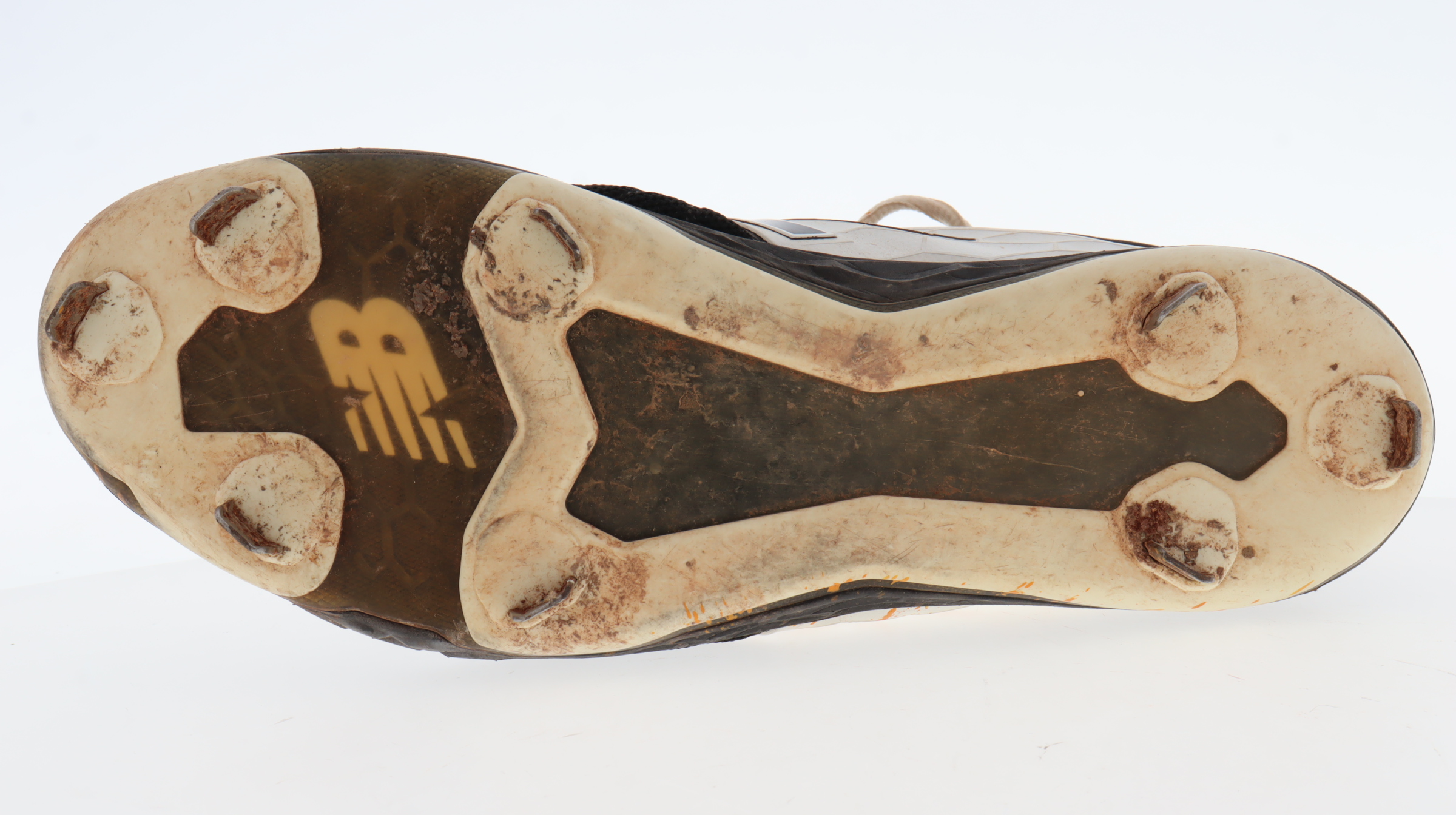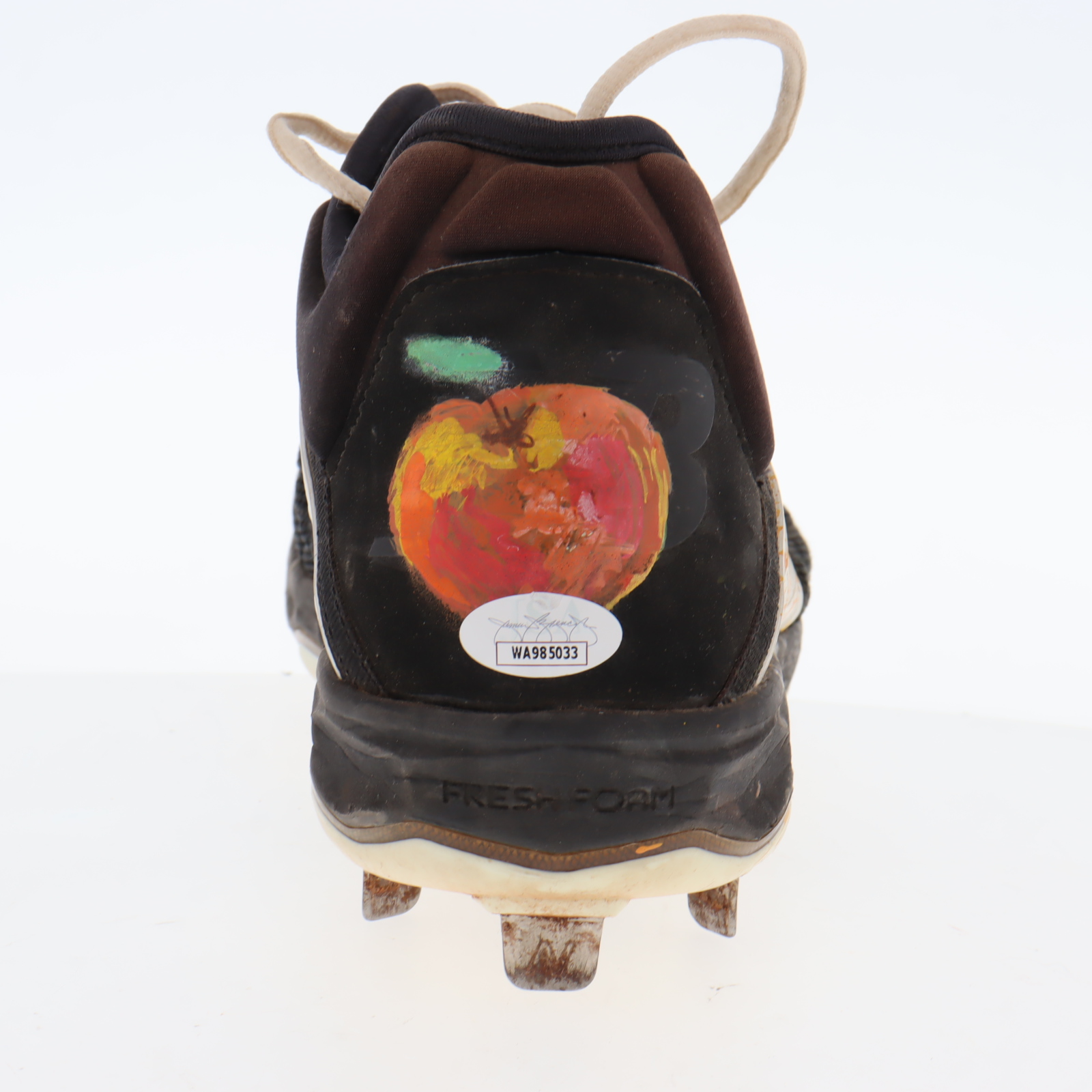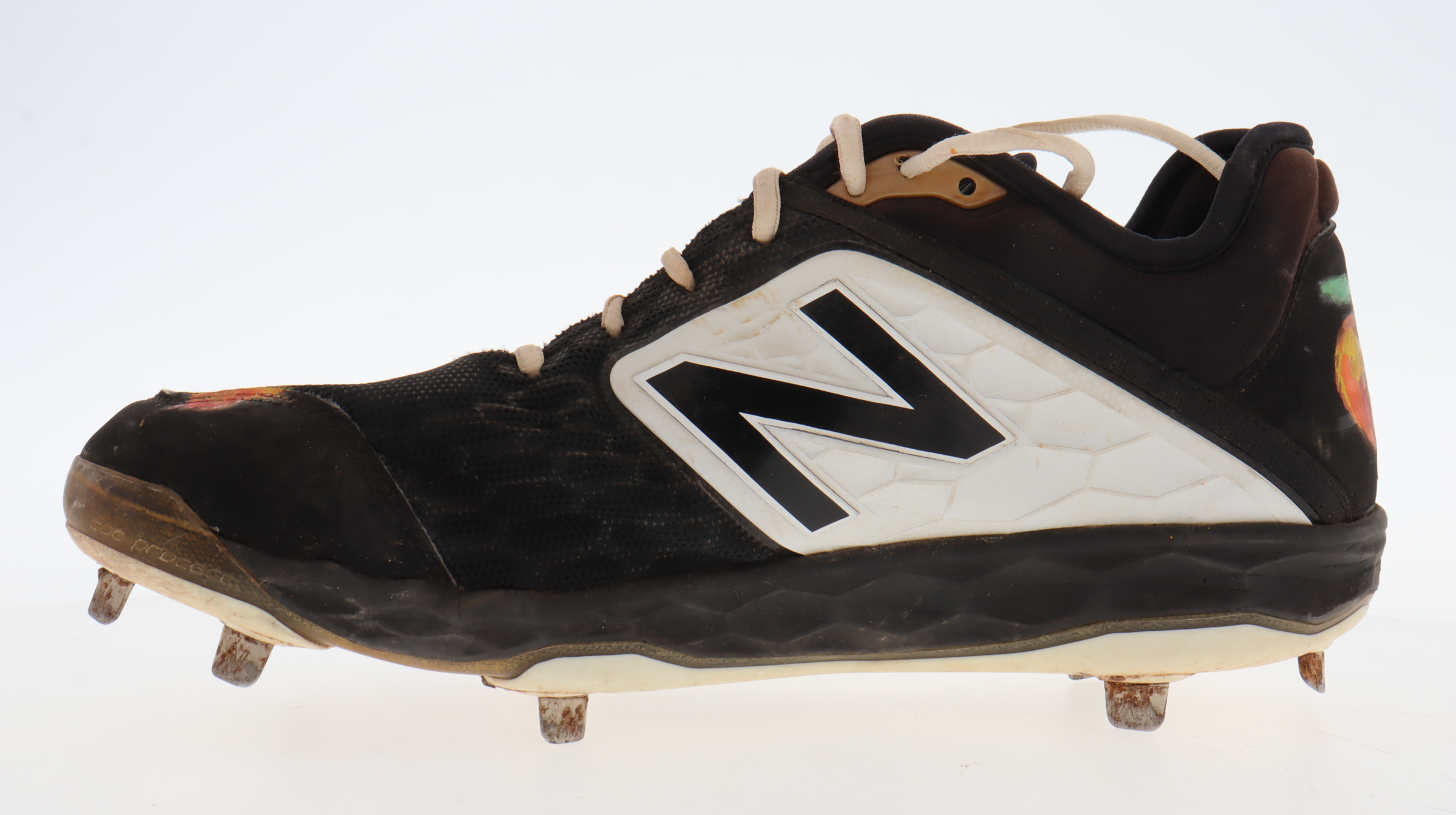 New Balance baseball cleat, size 11.5. Hand-signed by Aroldis Chapman (Texas Rangers). Cleat shows signs of wear. Please note, the cleat has been game-used by an unknown player and there is custom paint job on the cleats.