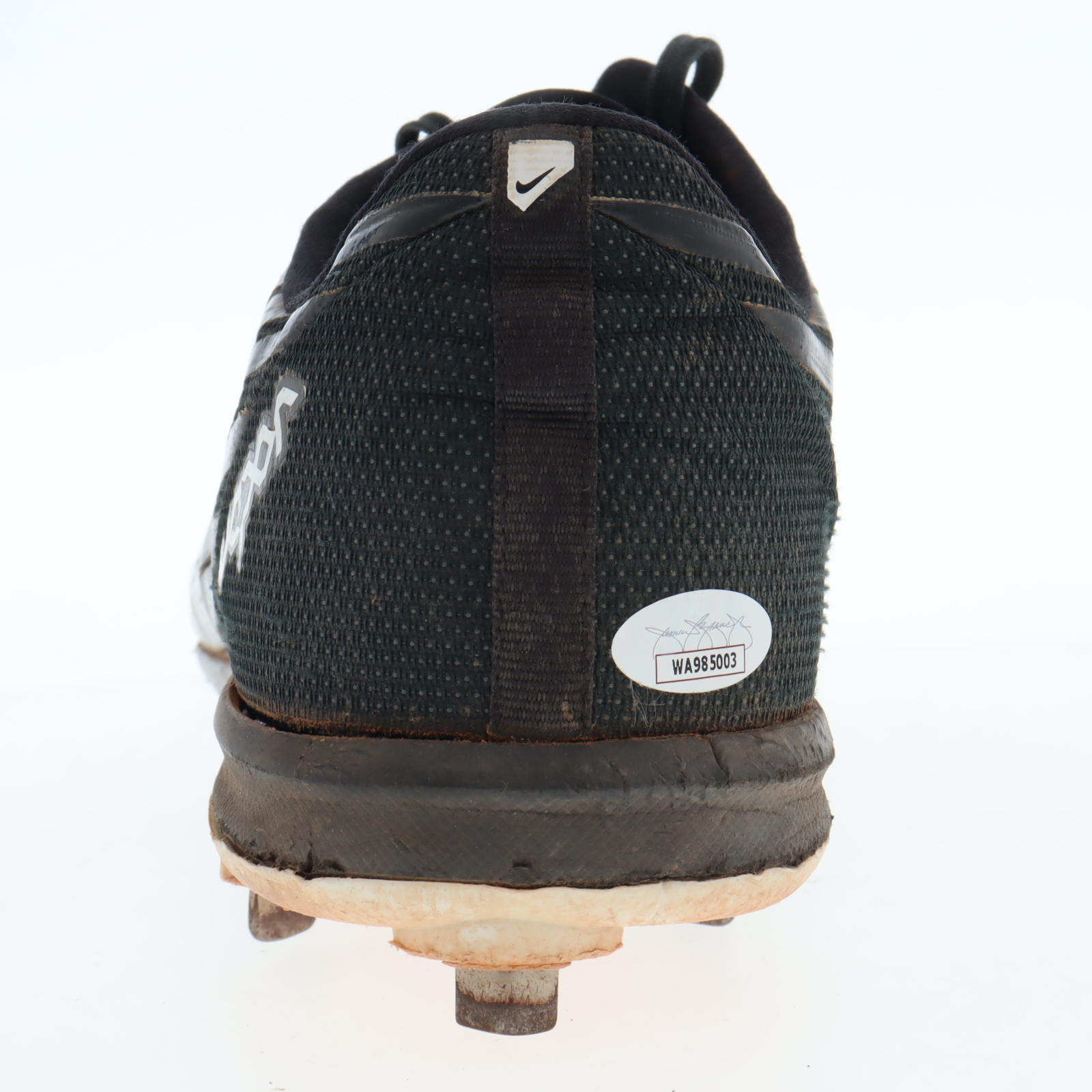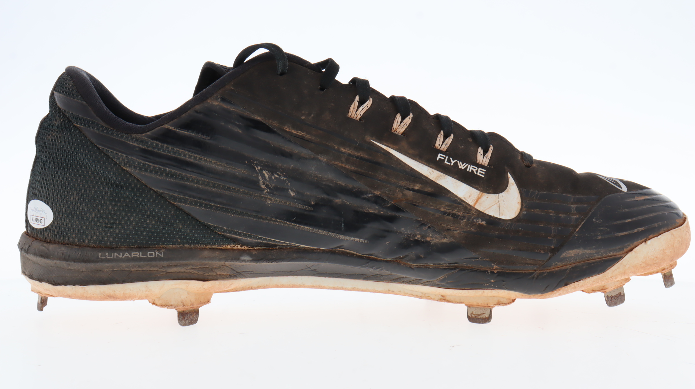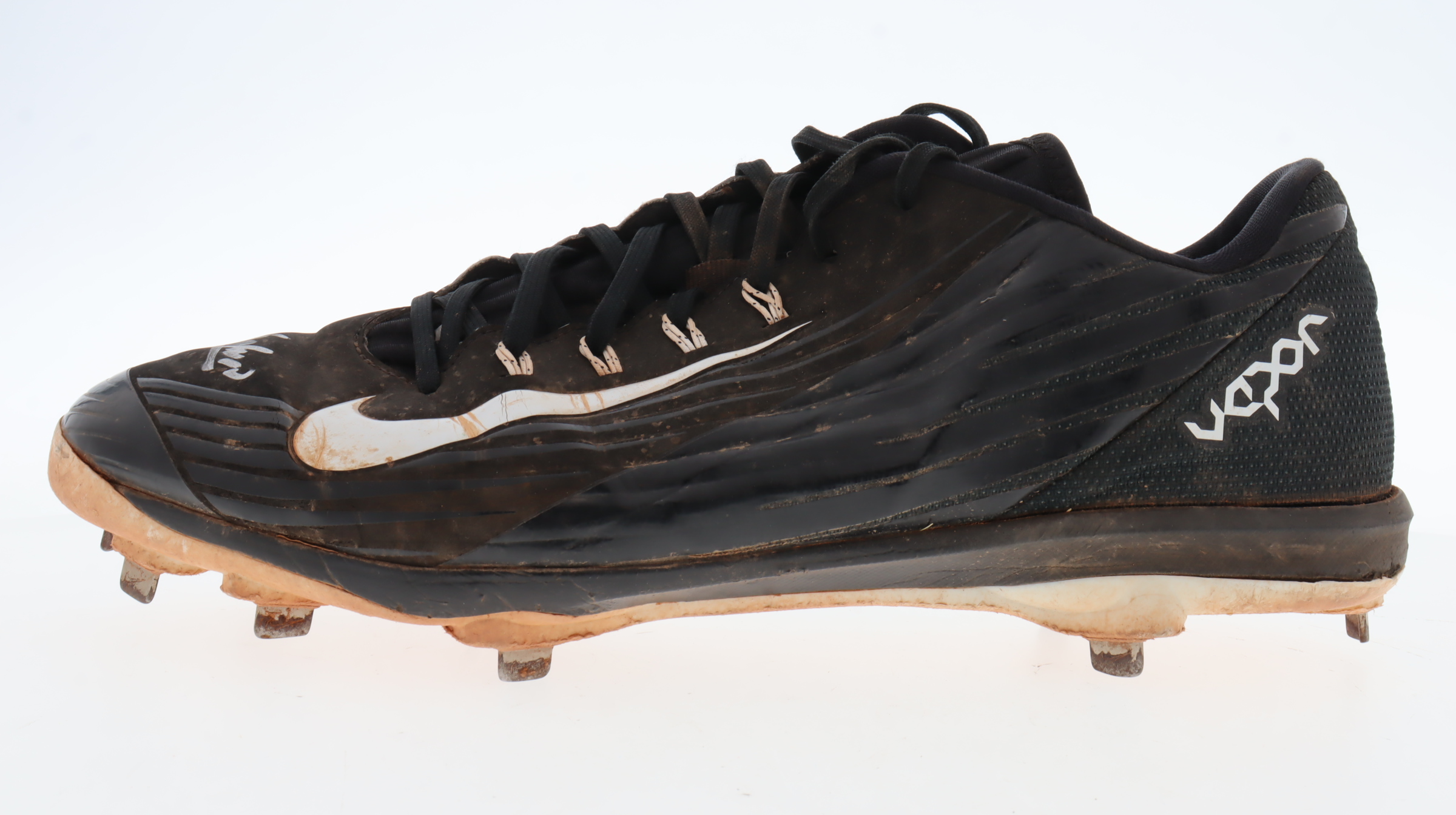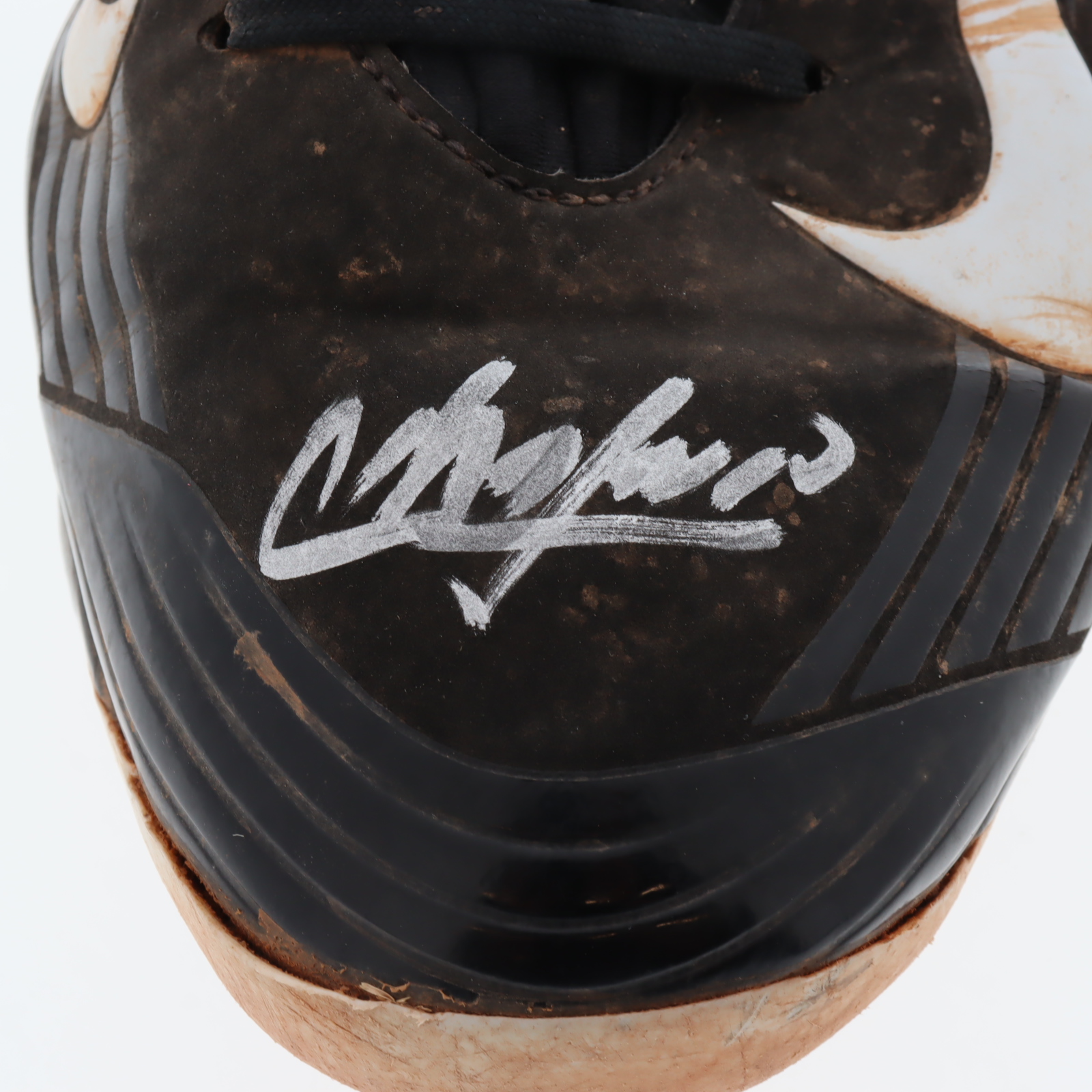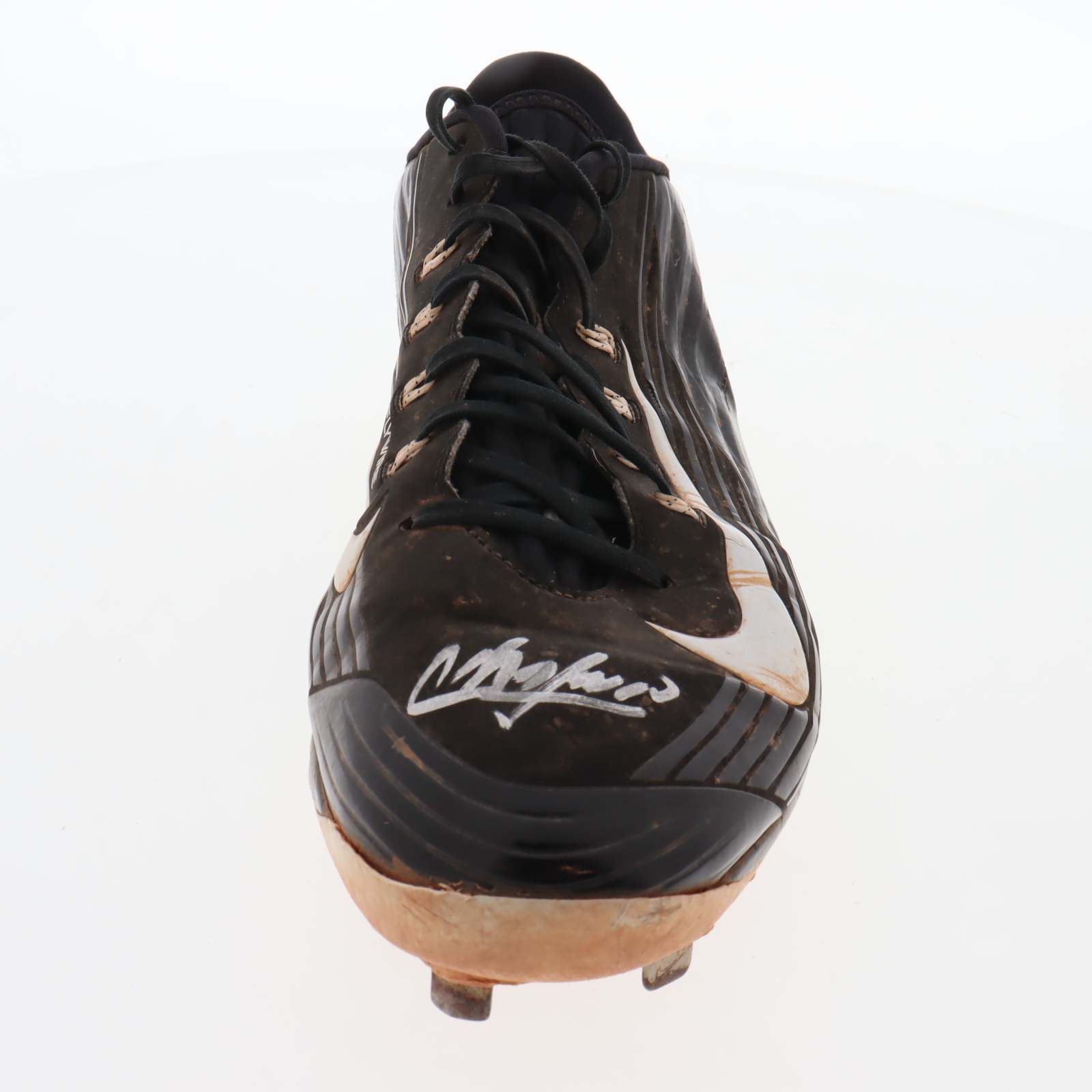 Nike Flywire baseball cleat, size 13. Hand-signed by Aroldis Chapman (Texas Rangers). Cleat shows signs of wear. Please note, the cleat has been game-used by an unknown player.