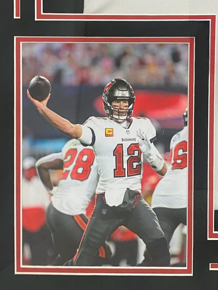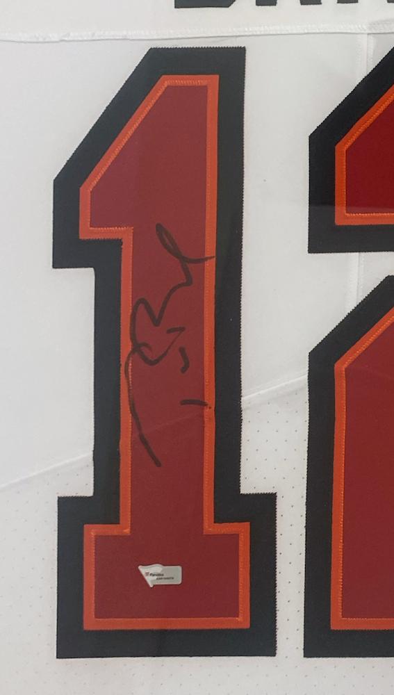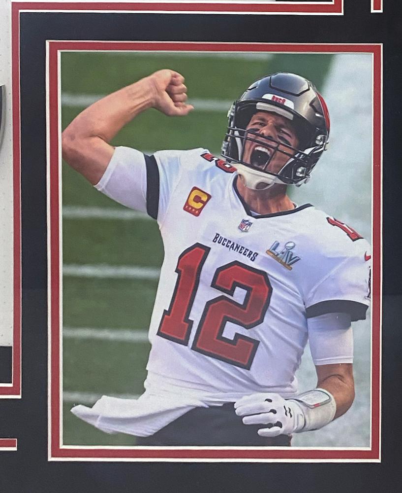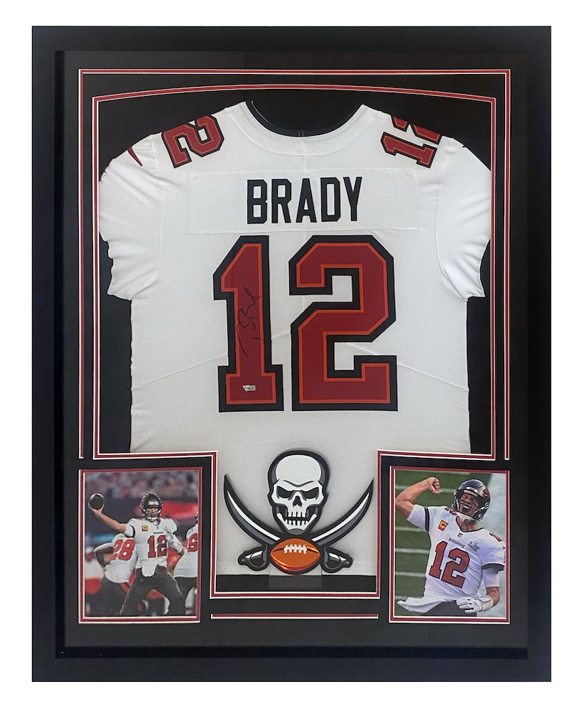 Custom framed display measures 34" x 42" and features an authentic Nike Elite jersey that has been hand-signed by Tom Brady. Additionally included are 8 x 10 photos and a Buccaneers logo cutout.