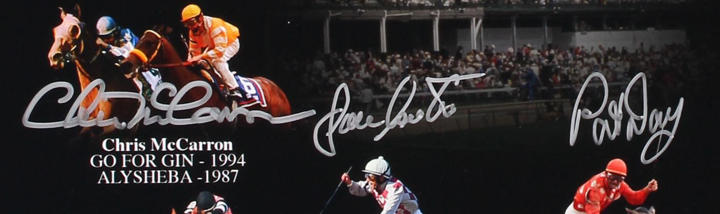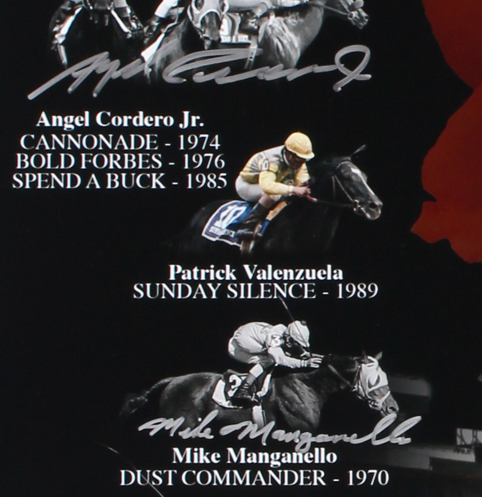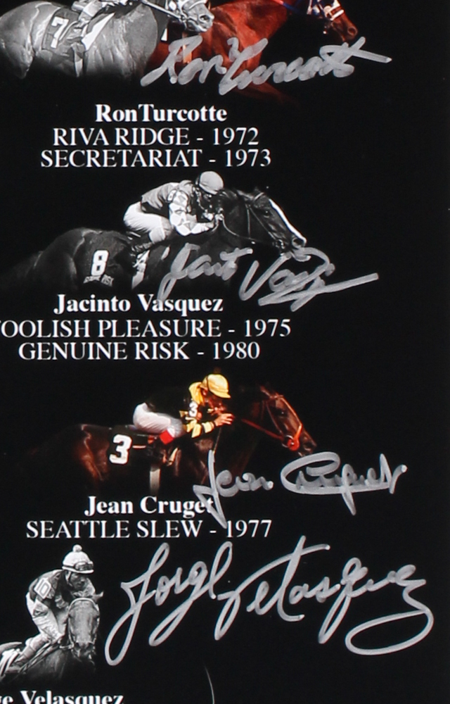Photo measures 16" x 20" in size. Photo has been hand-signed in silver paint pen by (9) jockeys including Ron Turcotte, Pat Day, Jean Cruguet, Mike Manganello, Angel Cordero Jr., Chris McCarron, Jose Santos, Jorge Velasquez, and Jacinto Vasquez.