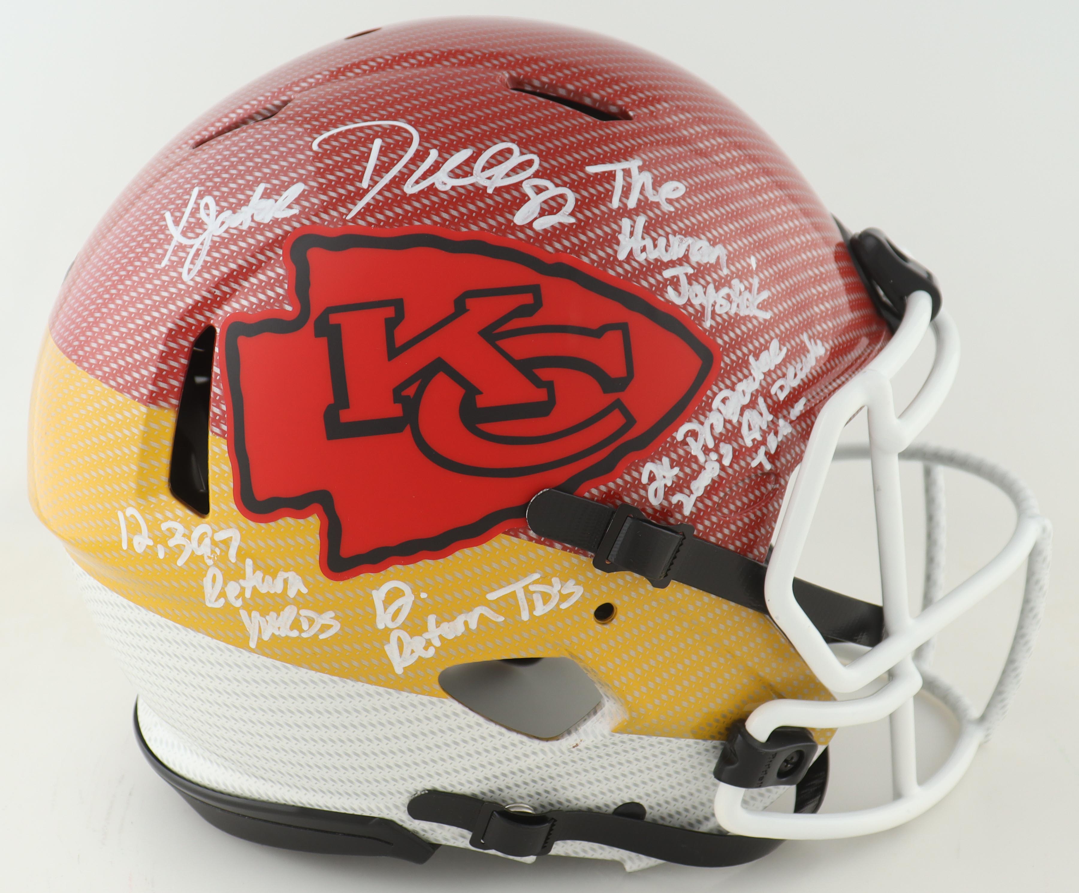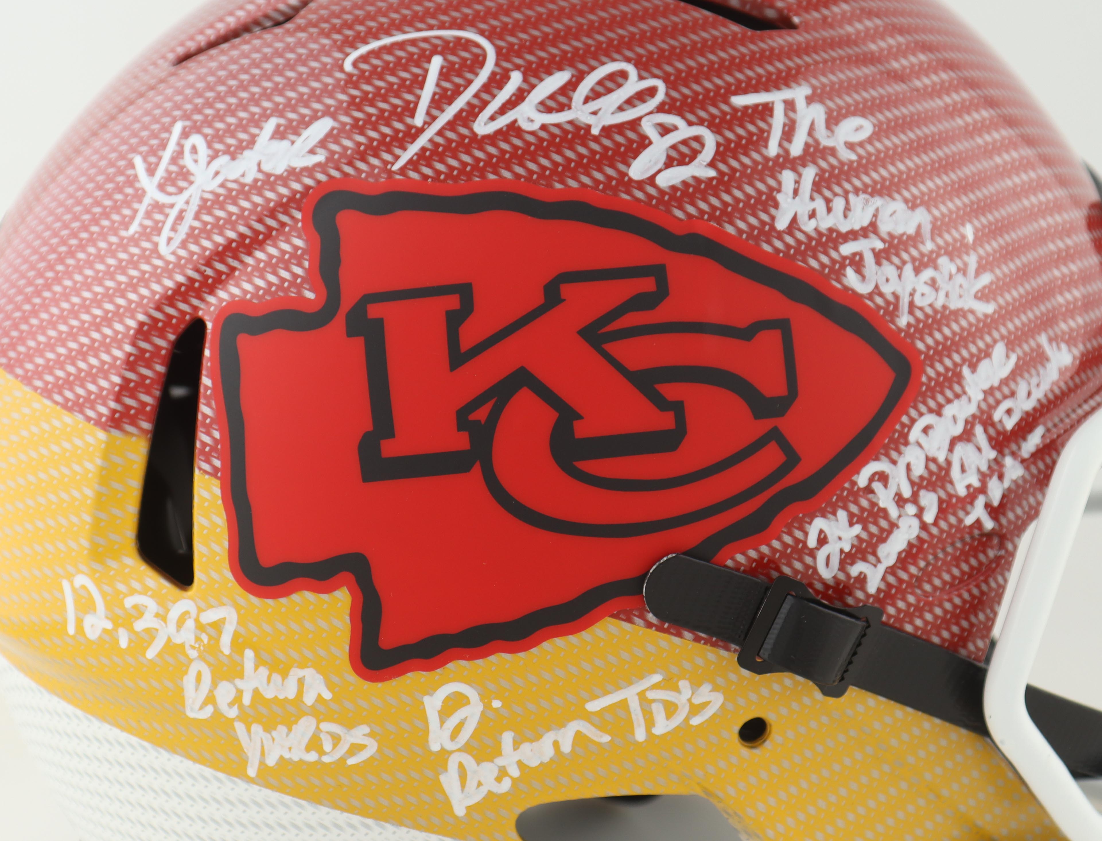 Riddell full-size authentic on-field hydro-dipped helmet. Hand-signed and inscribed by Dante Hall (Kansas City Chiefs).