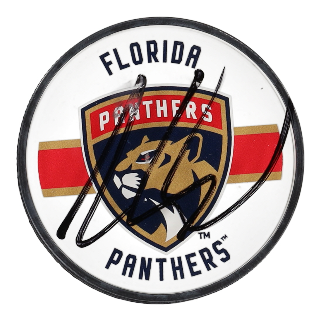 Florida Panthers Logo commemorative acrylic hockey puck. Hand-signed by Aaron Ekblad. Please note the smudged signature.