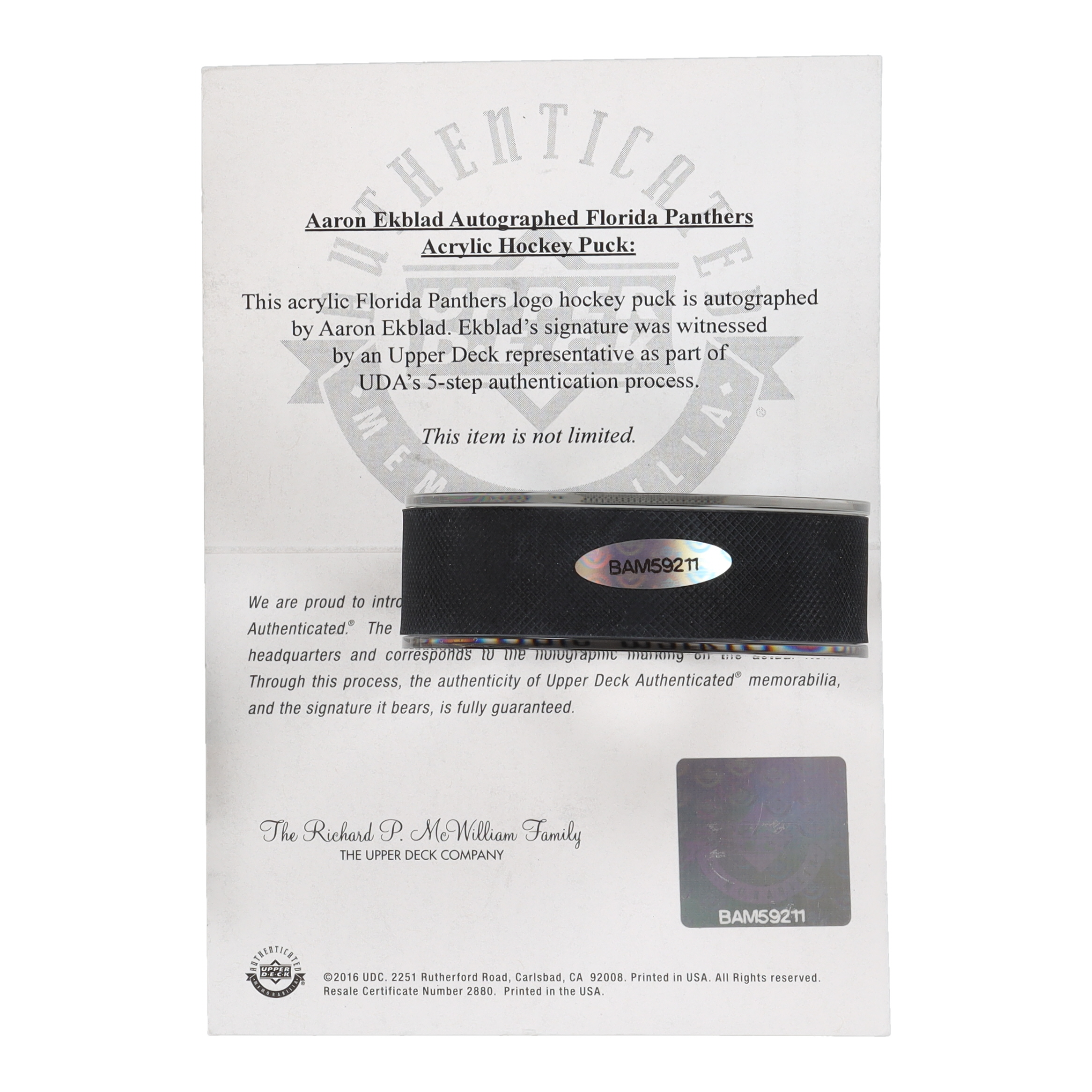 Aaron Ekblad Signed Panthers Logo Commemorative Hockey Puck (UDA)