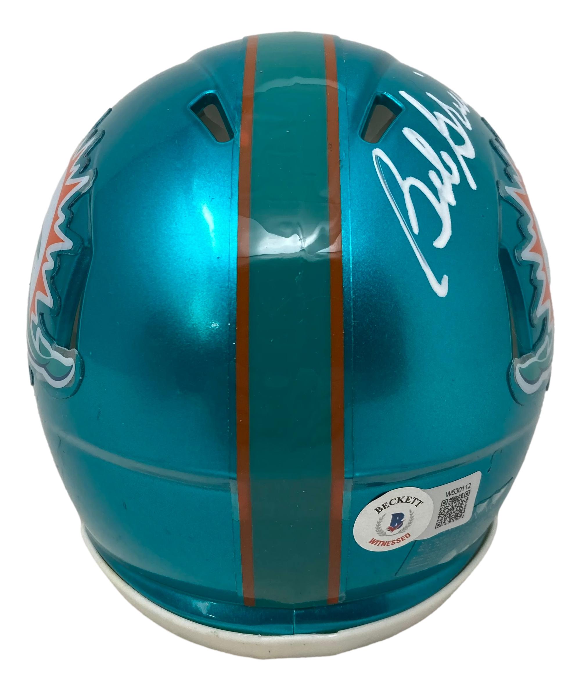 Riddell Miami Dolphins flash alternate Speed mini helmet has been hand-signed by Bob Griese (HOF).