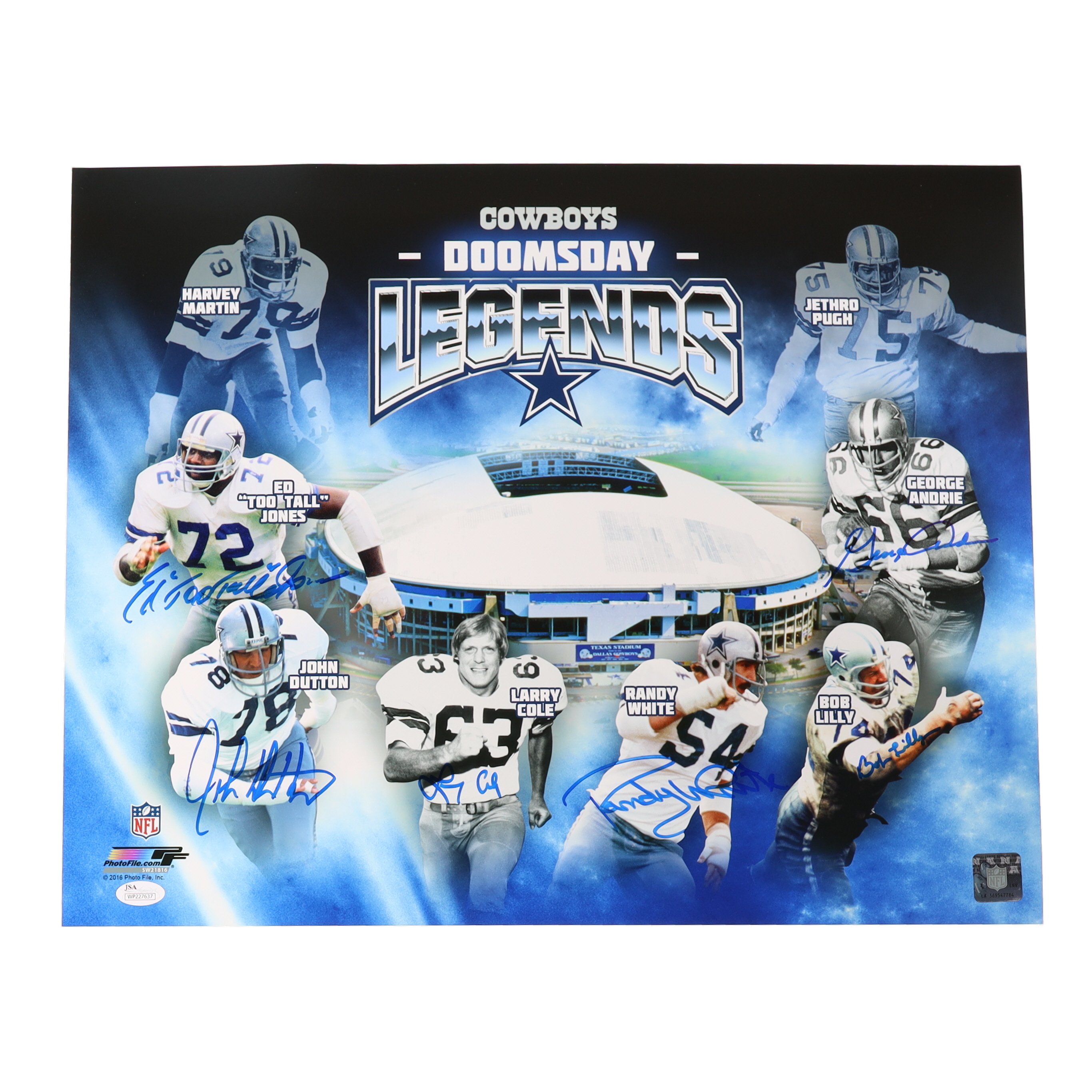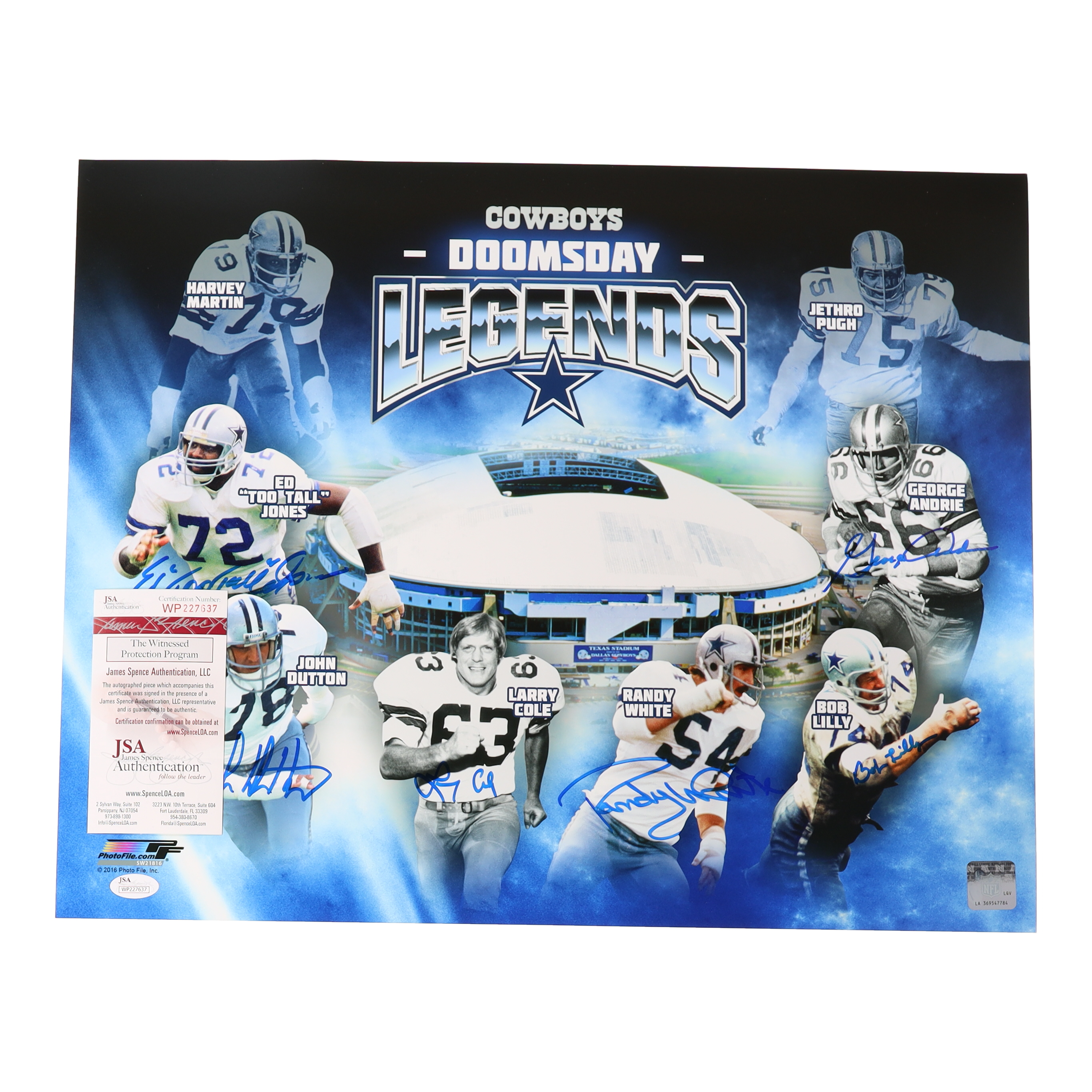 Photo measures 16" x 20" in size and has been hand-signed by Ed "Too Tall" Jones, John Dutton, Larry Cole, Randy White (HOF), Bob Lilly (HOF), and George Andrie. (Dallas Cowboys)