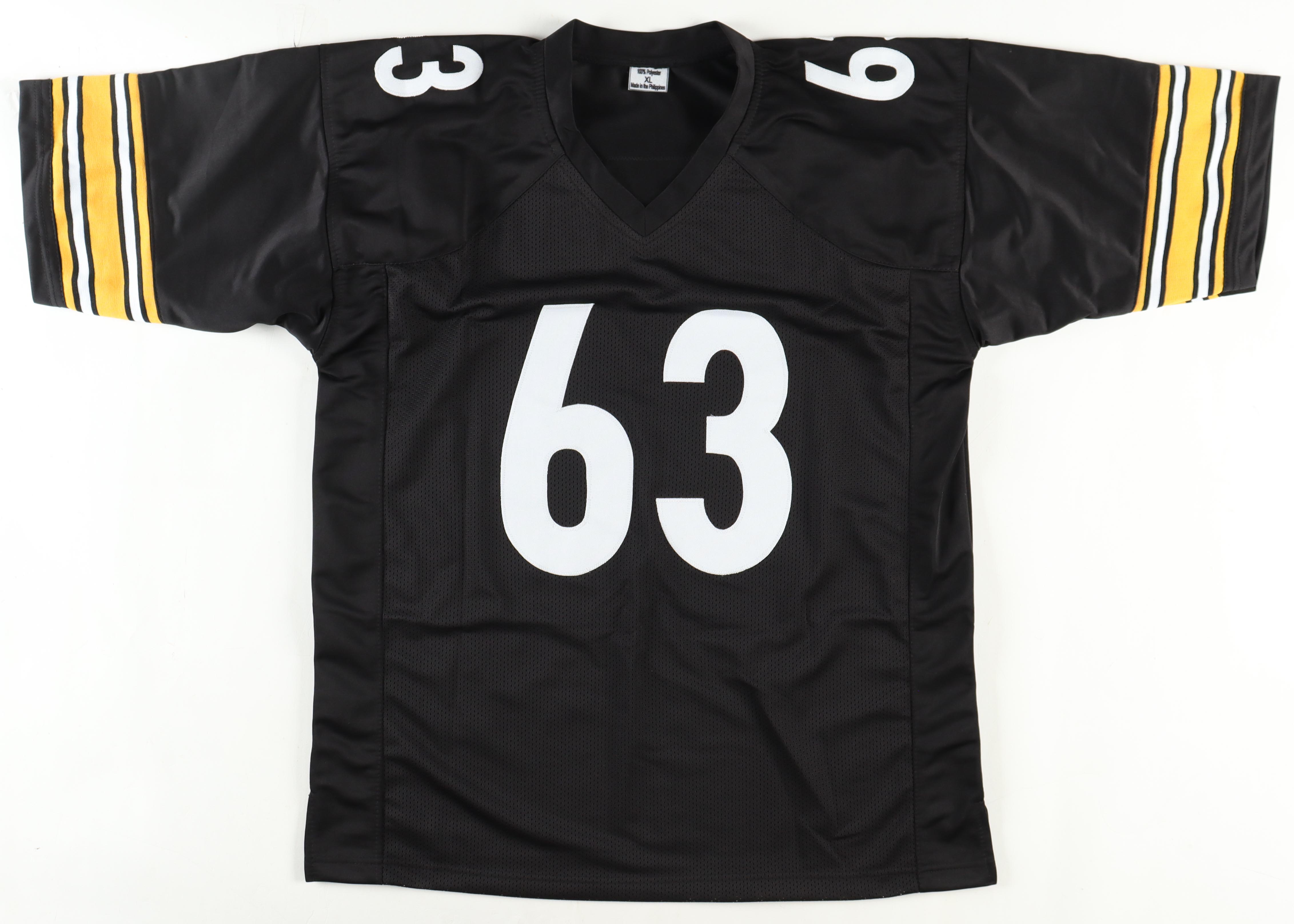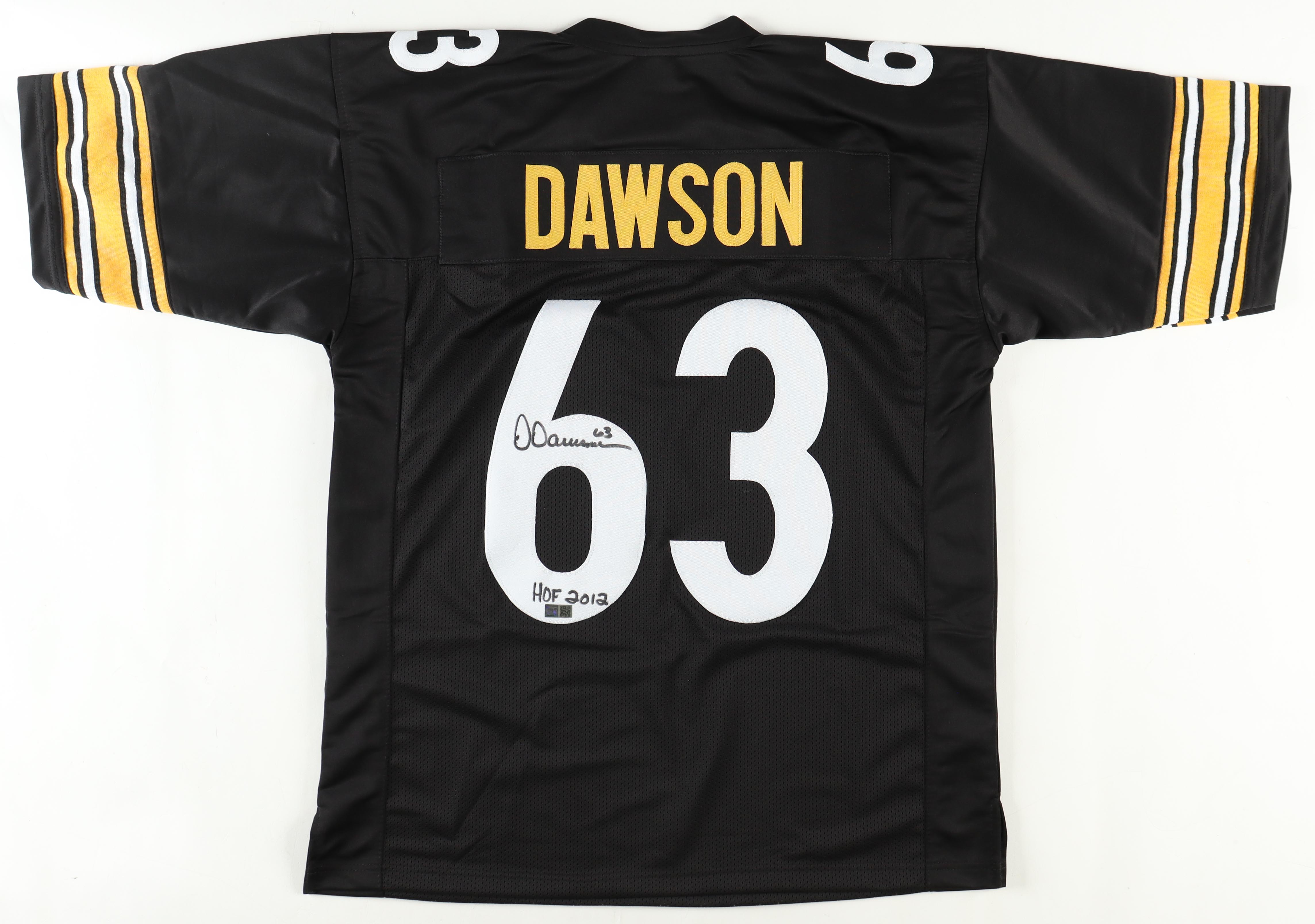 Custom jersey with everything sewn on, size XL. Hand-signed and inscribed by Dermontti Dawson (HOF).