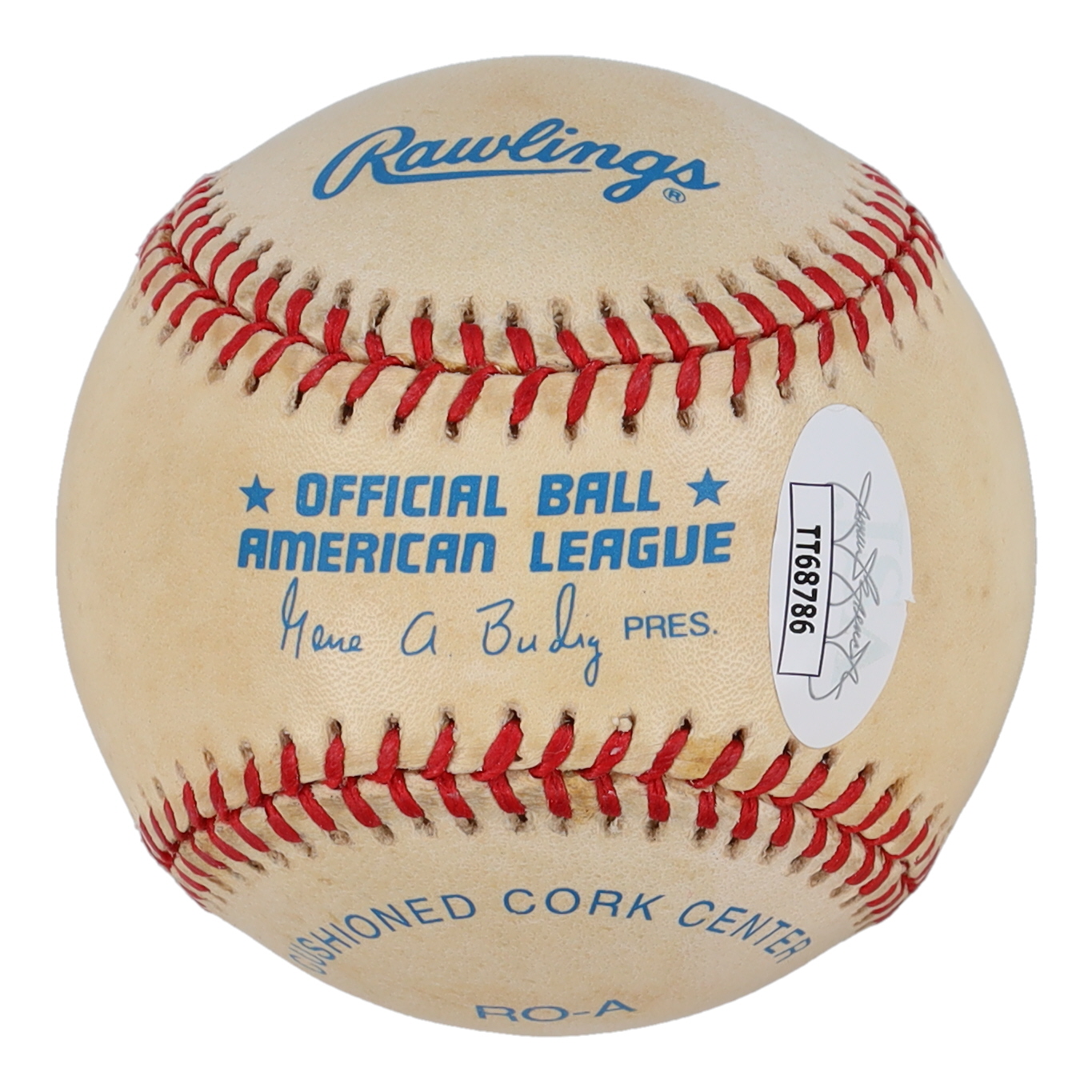 Rawlings Official American League baseball. Hand-signed and inscribed by Ivan Rodriguez (Texas Rangers, HOF). Please note, the baseball is naturally toned.