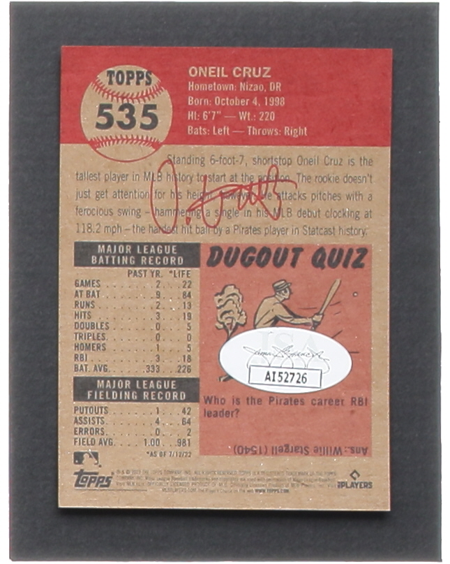 Oneil Cruz Signed 2022 Topps Living #535 RC (JSA)