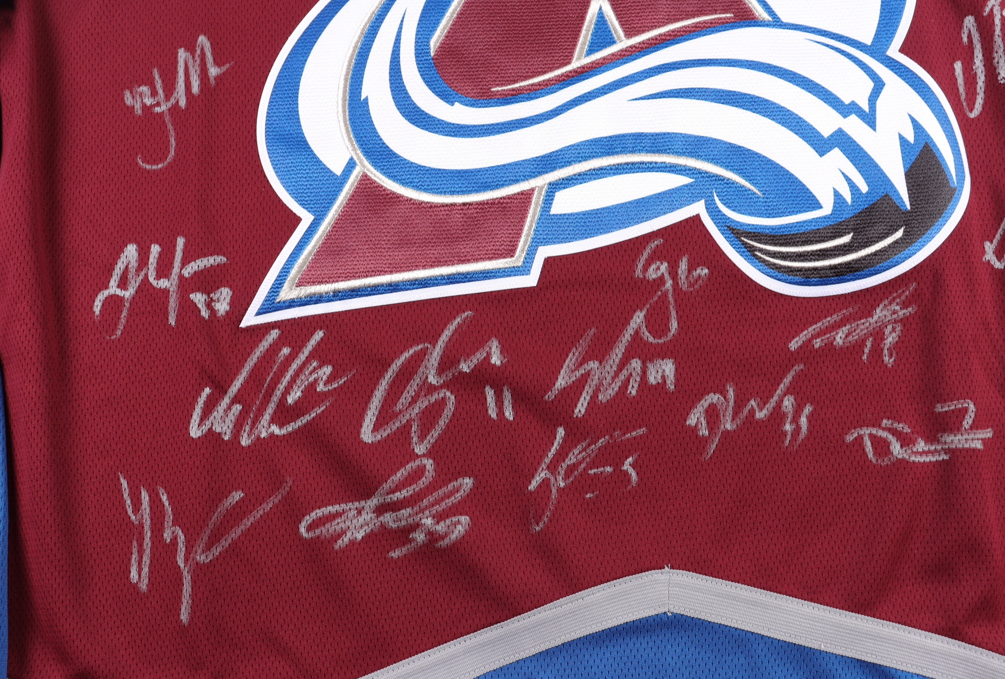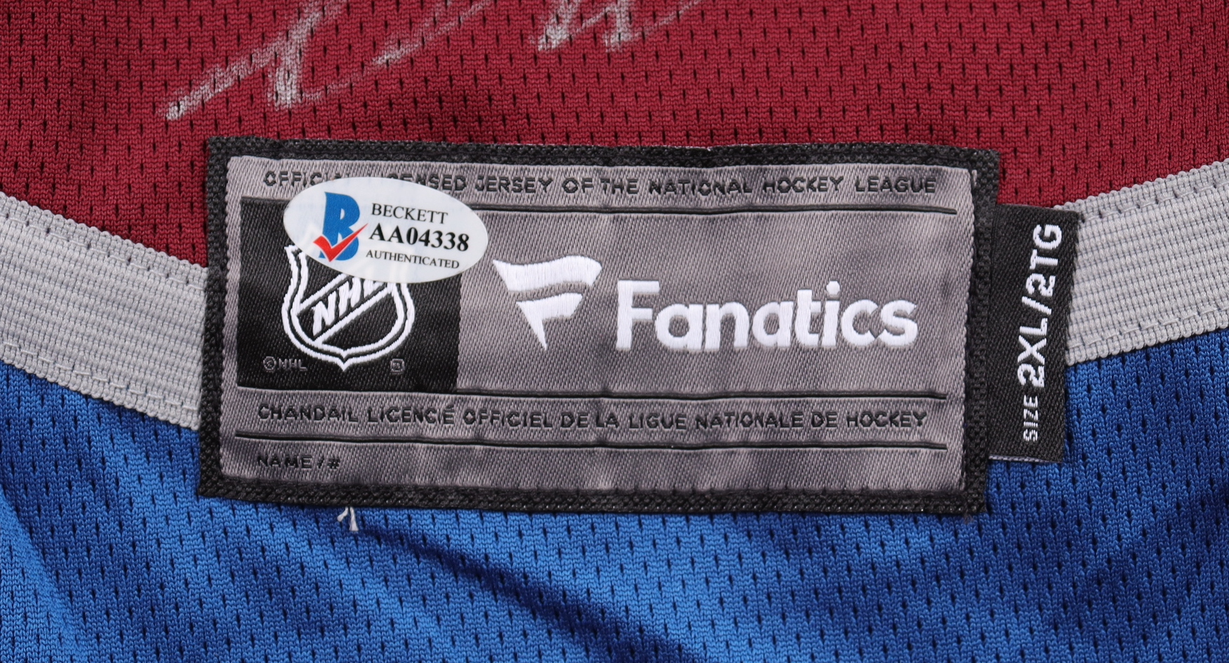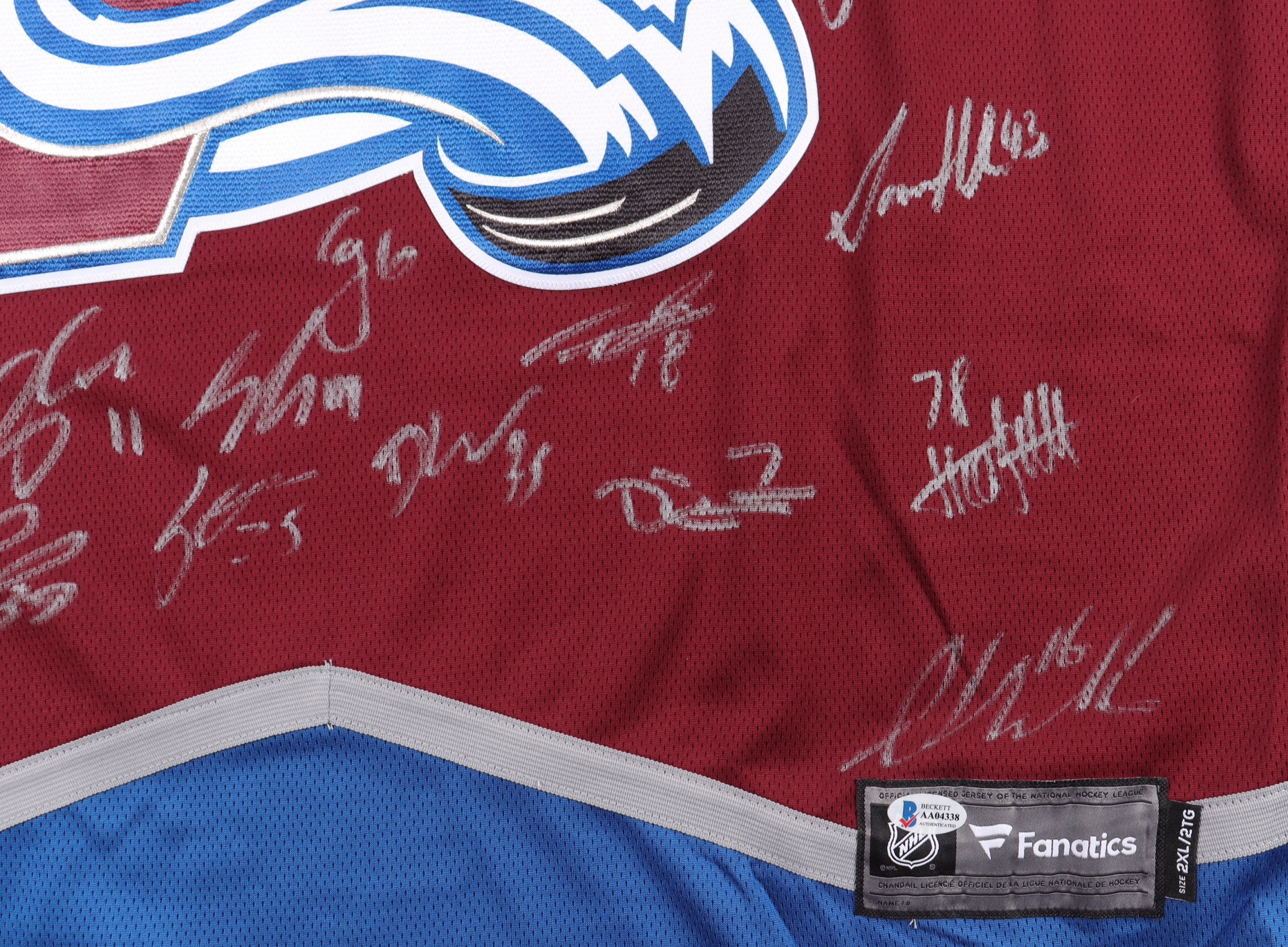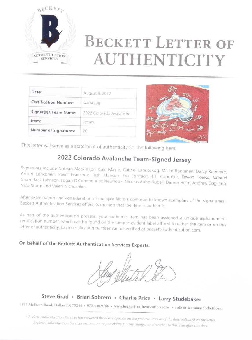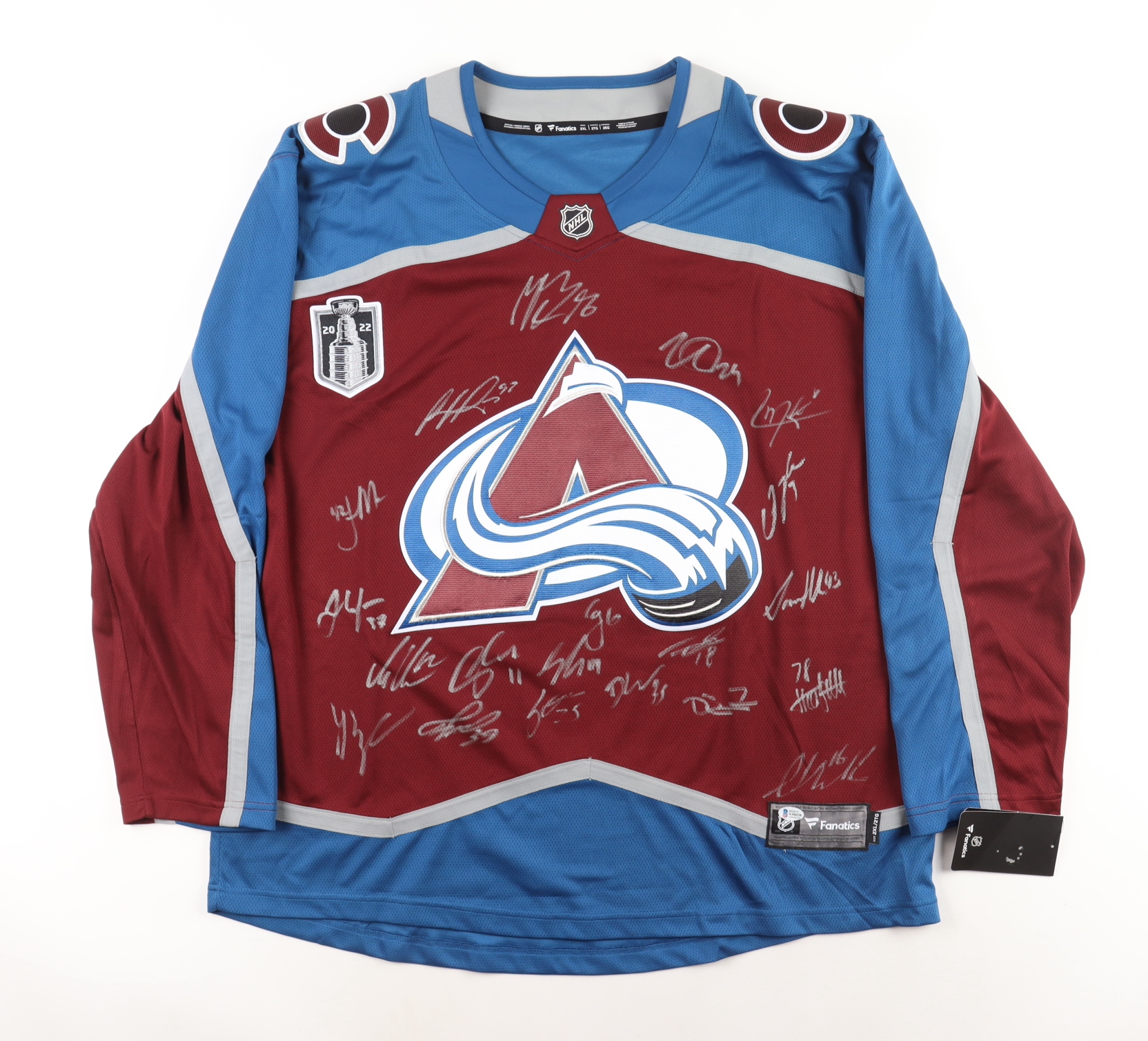 Fanatics jersey. Everything is sewn on, size 2XL. Has been hand-signed by (20) including Nathan Mackinnon, Cale Makar, Gabriel Landeskog, Mikko Rantanen, Darcy Kuemper, Artturi Lehkonen, Pavel Francouz, Josh Manson, Erik Johnson, J.T. Compher, Devon Toews, Samuel Girard,Jack Johnson, Logan O'Connor, Alex Newhook, Nicolas Aube-Kubell, Darren Helm, Andrew Cogliano, Nico Sturm and Valeri Nichushkin.