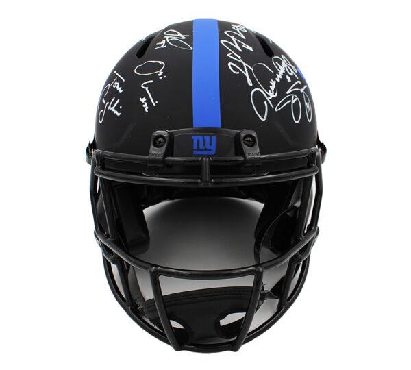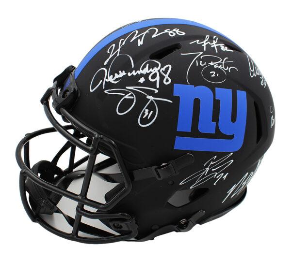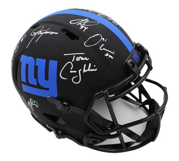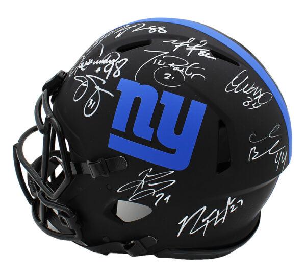 Riddell New York Giants full-size authentic on-field eclipse alternate speed helmet. Hand-signed by (17) former players and coach of the Giants. Signers include Jessie Armstead, Mark Bavaro, Ahmad Bradshaw, Plaxico Burress, Tom Coughlin, Tiki Barber, Derrick Ward, Phil Simms, Justin Tuck, Jason Sehorn, Mario Manningham, Rodney Hampton, Lawrence Taylor, Brandon Jacobs, Amani Toomer, Osi Umenyiora, and Hakeem Nicks.