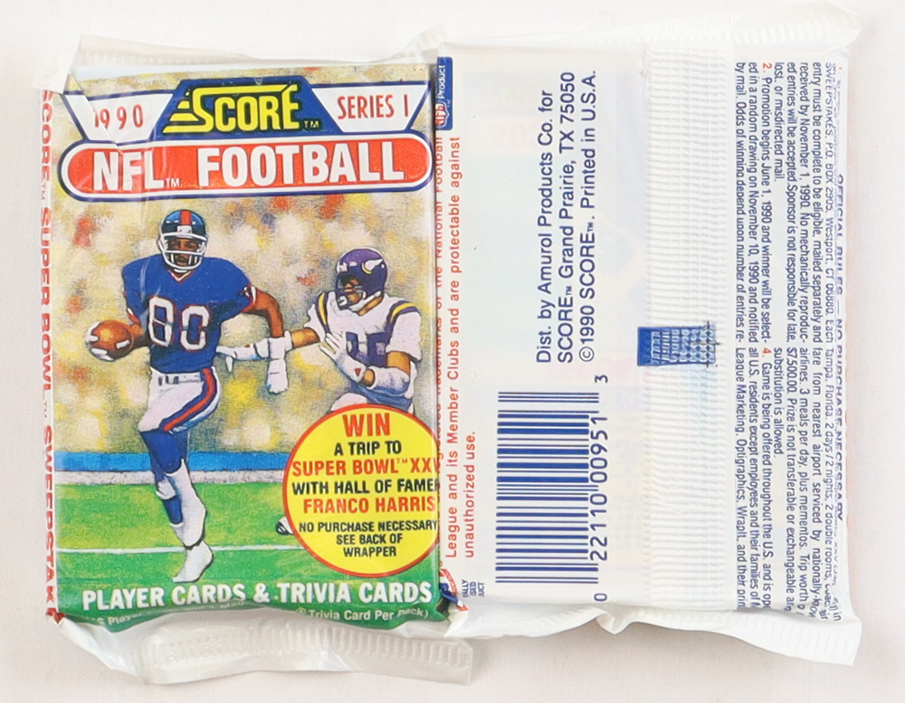 The 1990 Score football set consists of 660 standard-size cards issued in two series of 330.The fronts have sharp color action photos and multicolored borders. The vertically oriented backs have color photos, stats and highlights. There are numerous subsets including Draft Picks (289-310/618-657), Hot Guns (311-320/563/564), Ground Force (321-330/561/562), Crunch Crew (551-555), Rocket Man (556-560), All-Pros (565-590), Record Breakers (591-594), Hall of Famers (595-601) and Class of '90 (606-617). Rookie Cards include Junior Seau, Cortez Kennedy, Ken Harvey, Andre Ware, and Rodney Hampton.