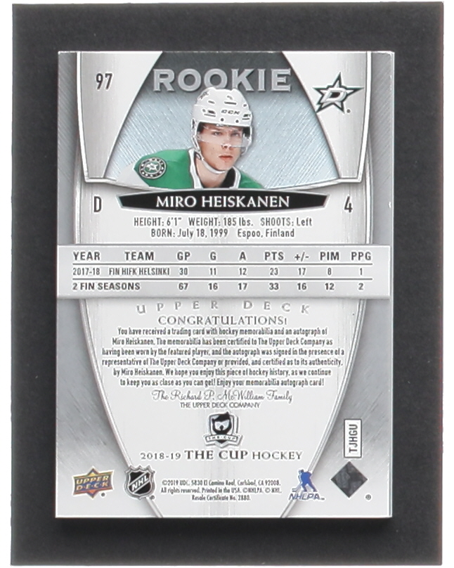 Miro Heiskanen 2018-19 The Cup #97 Jersey Autograph #077/249 RC