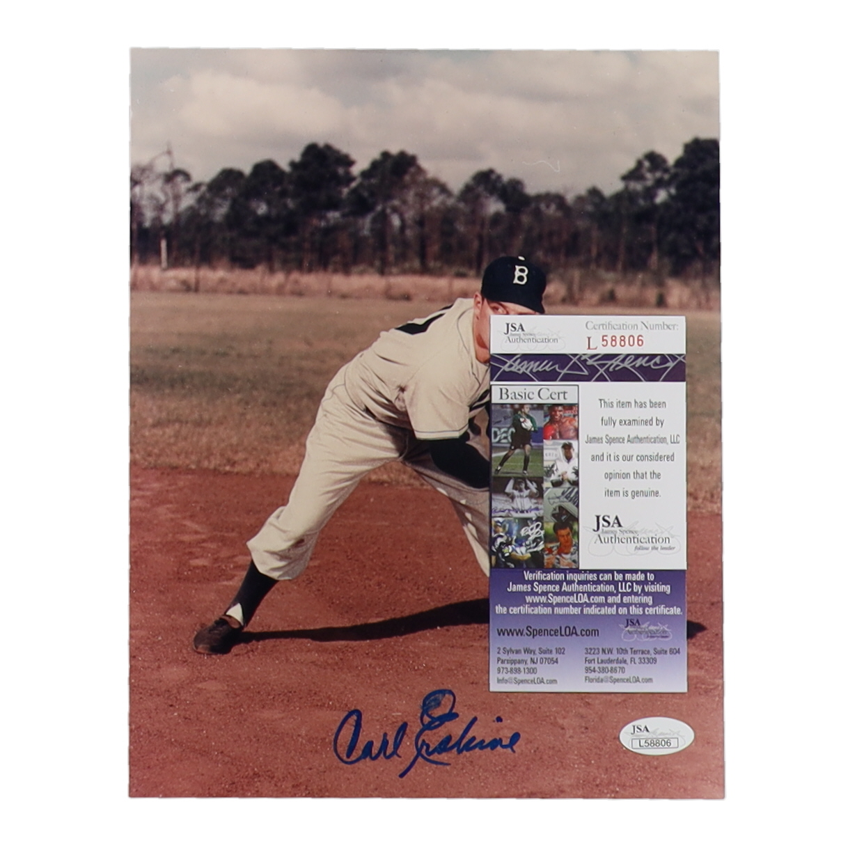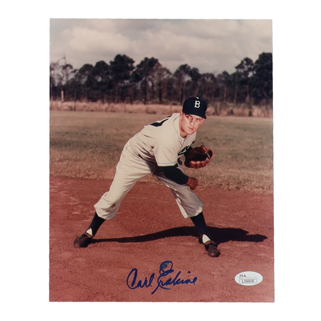 Photo measures 8" x 10" in size and is hand-signed by Carl Erskine (Brooklyn Dodgers). Please note, the signature is smudged.