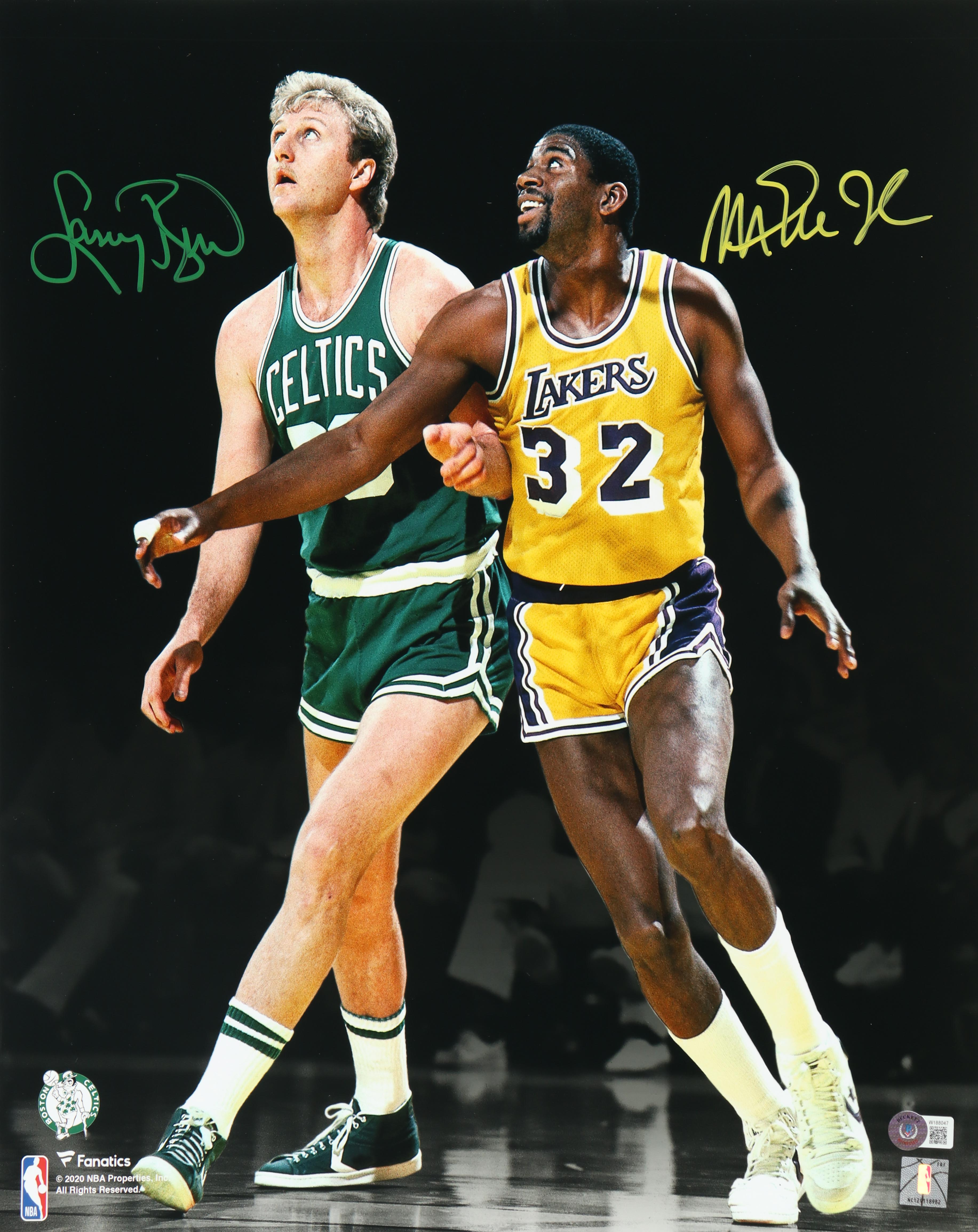 Photo measures 16" x 20" in size and has been hand-signed by Larry Bird (Boston Celtics, HOF) and Magic Johnson (Los Angeles Lakers, HOF).