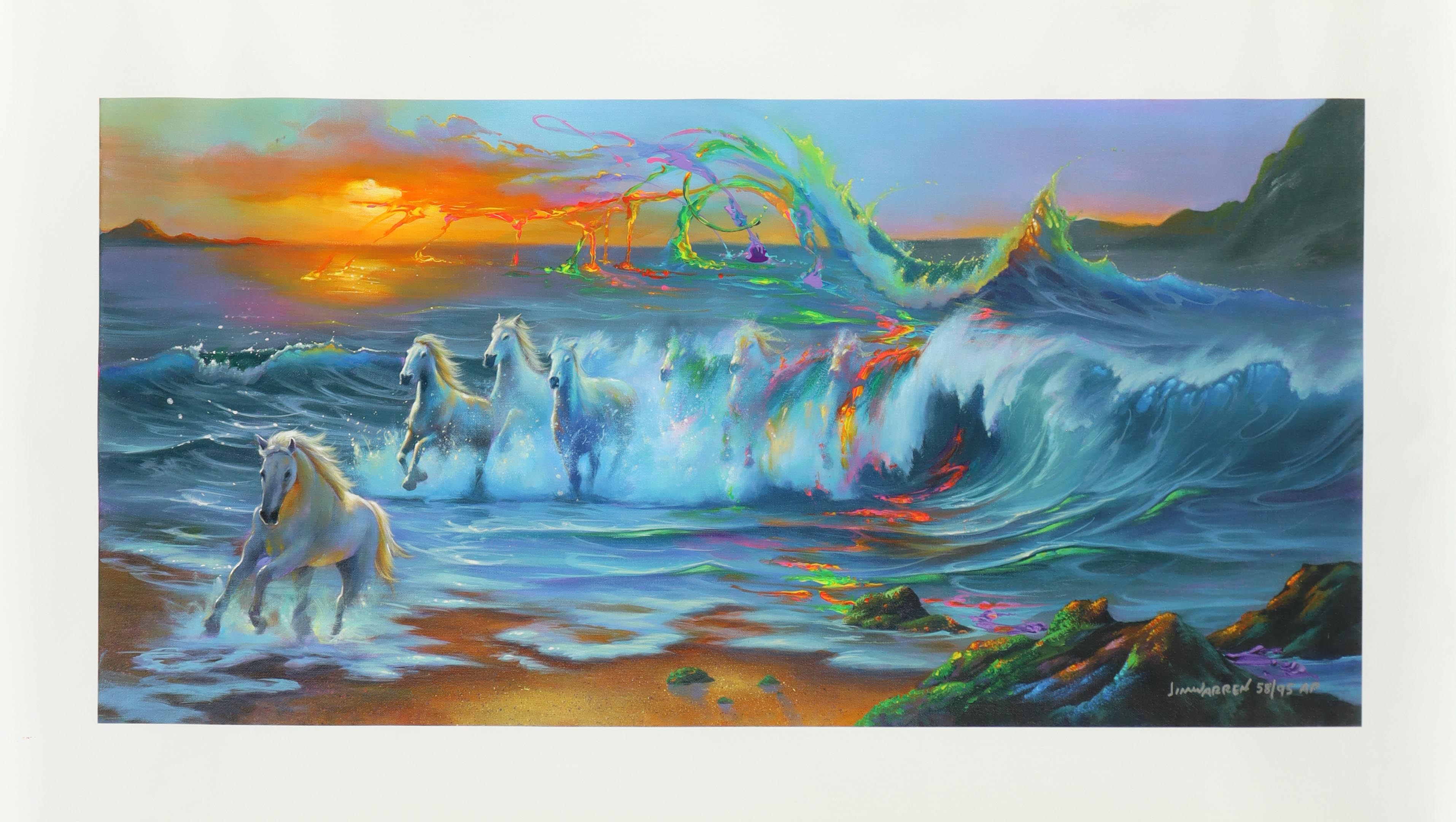 "Living Color" is an AP numbered, artist embellished limited edition giclee on canvas by Jim Warren. The piece is hand-signed and accompanied by a certificate of authenticity. Measures approximately 18" x 36" (image).
