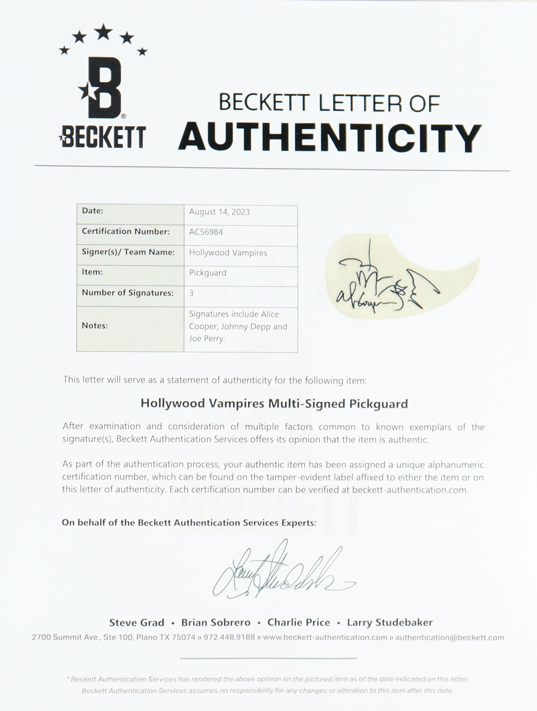Customized full-size guitar measures approximately 39" in length and is hand-signed on the pick guard by Alice Cooper, Johnny Depp and Joe Perry.