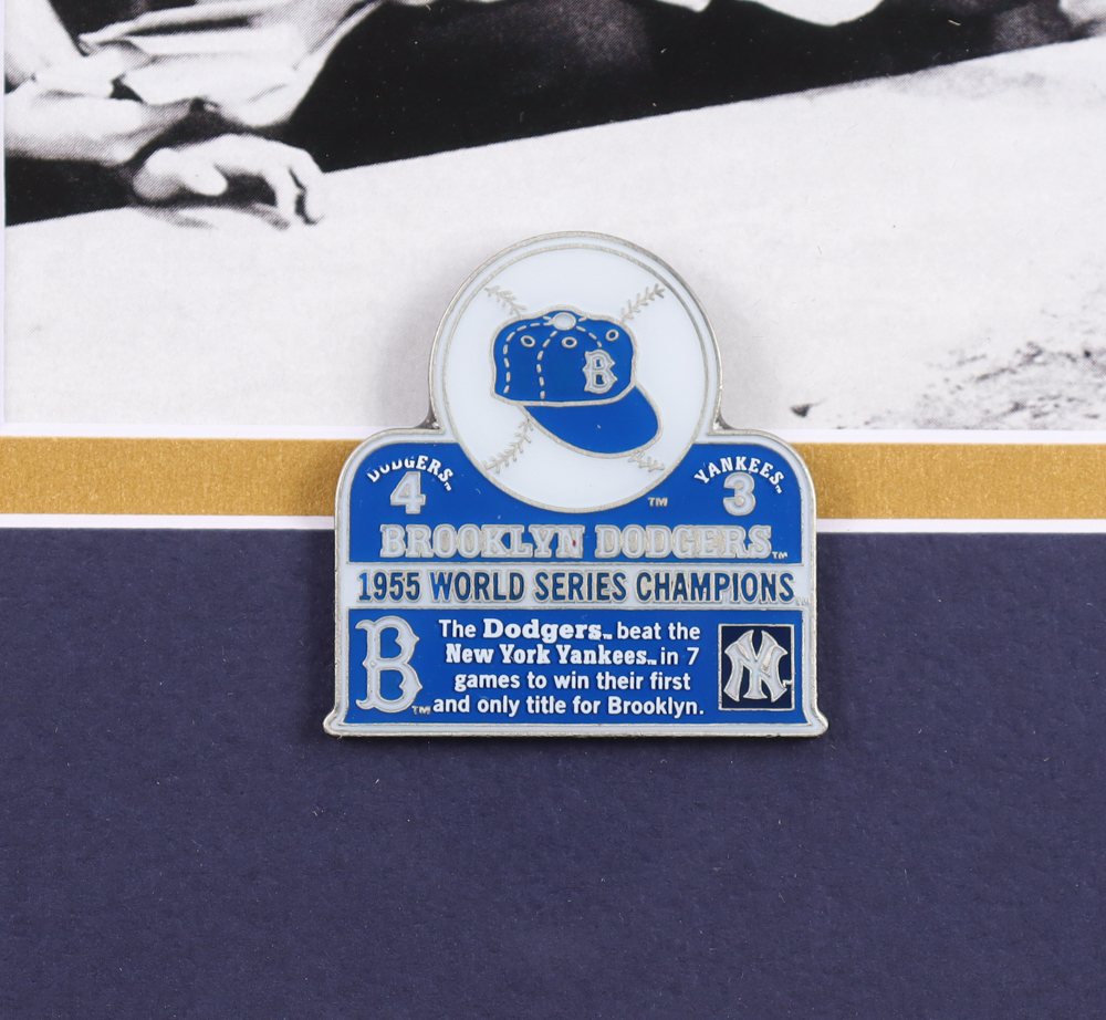 Custom frame measures approximately 13" x 16" in size and features a photo of Jackie Robinson (D.1972, Brooklyn Dodgers, HOF). Display also features a 1955 official world series pin. Please note, the display is unsigned.