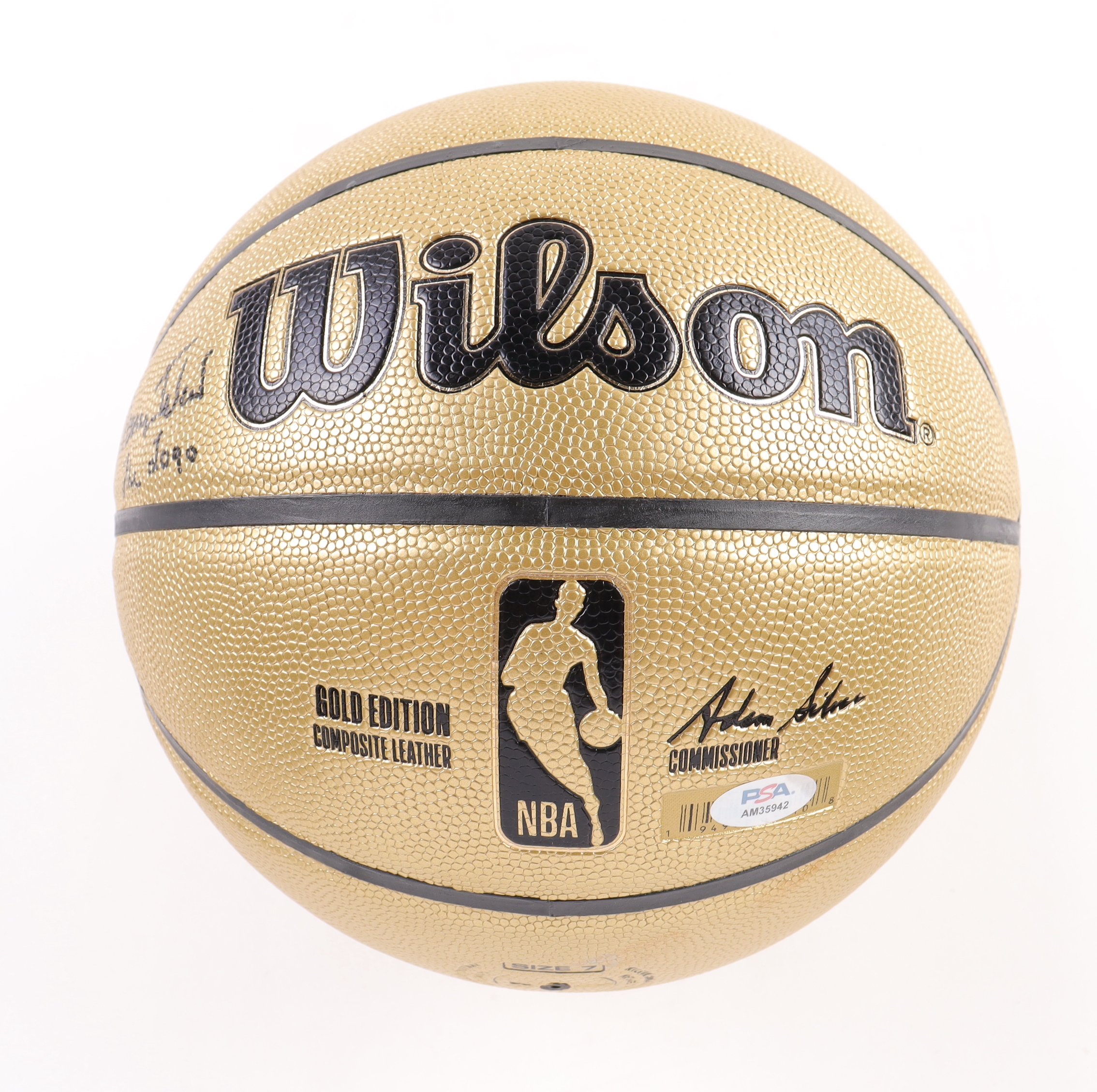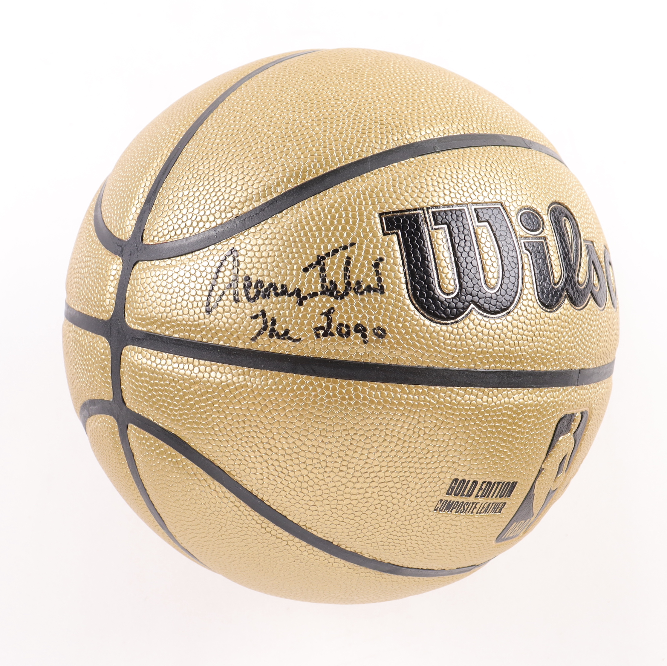 Wilson Gold Edition Composite Leather NBA basketball. Hand-signed and inscribed by Jerry West (Los Angeles Lakers, HOF). The acrylic display stand and name plate are included as shown.