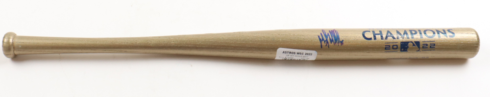 Houston Astros 2022 World Series Champions logo mini bat has been hand-signed by Martin Maldonado (Houston Astros).