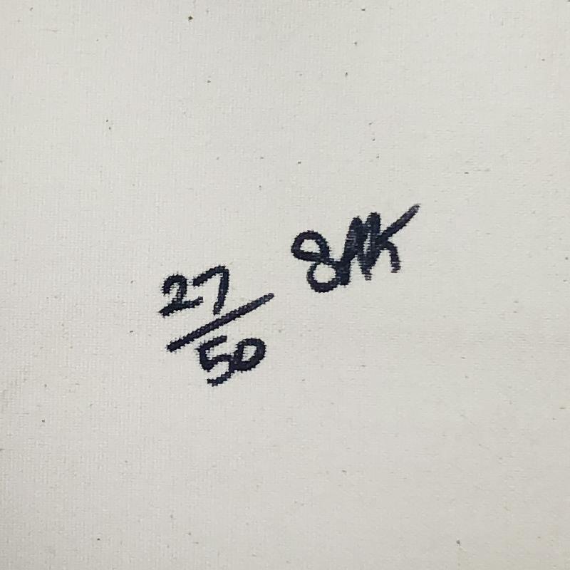 "Steeplechase, Coney Island" is limited edition hand pulled silkscreen unique mixed media on canvas by Andy Warhol protege Steve Kaufman (1960-2010). This piece is numbered and hand signed inverso and includes a letter of authenticity. As is common with Kaufman's works, this piece may have perceived minor flaws, but is in overall good condition. Measures approximately 16.5" x 17" before cropping.